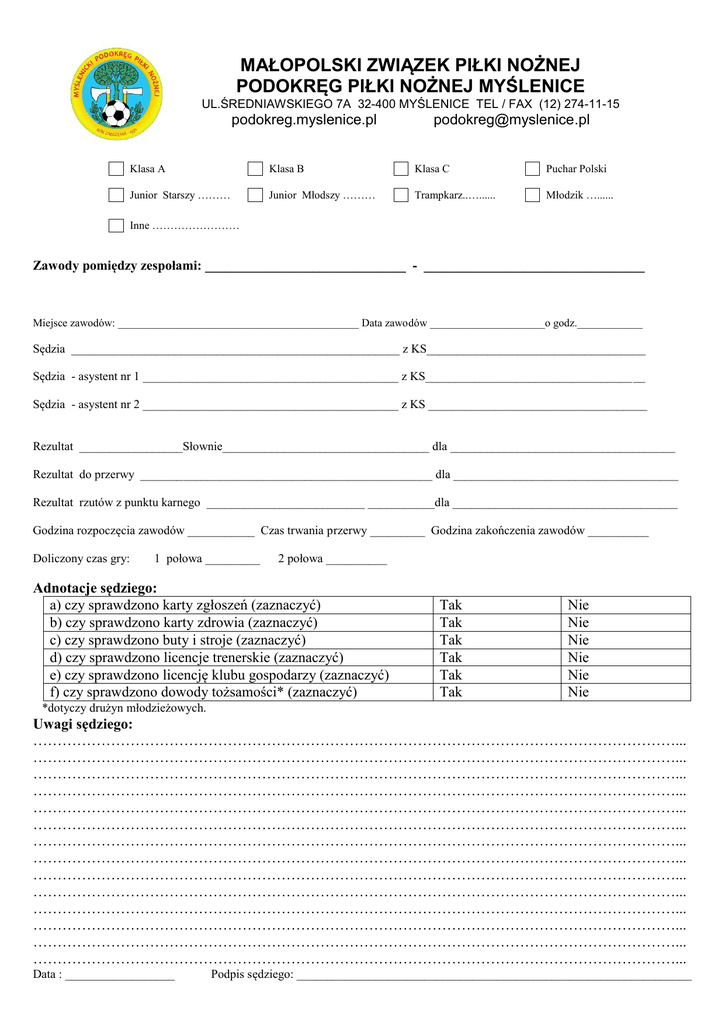 Sprawozdanie meczowe - PDF - Podokręg Piłki Nożnej Myślenice