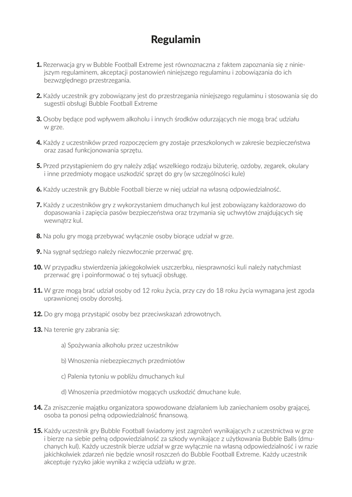 Regulamin 1. Rezerwacja gry w Bubble Football Extreme jest równoznaczna z faktem zapoznania się z niniejszym regulaminem, akceptacji postanowień niniejszego regulaminu i zobowiązania do ich bezwzględnego przestrzegania. 2. Każdy uczestnik gry zobowiązany jest do przestrzegania niniejszego regulaminu i stosowania się do sugestii obsługi Bubble Football Extreme 3. Osoby będące pod wpływem alkoholu i innych środków odurzających nie mogą brać udziału w grze. 4. Każdy z uczestników przed rozpoczęciem gry zostaje przeszkolonych w zakresie bezpieczeństwa oraz zasad funkcjonowania sprzętu. 5. Przed przystąpieniem do gry należy zdjąć wszelkiego rodzaju biżuterię, ozdoby, zegarek, okulary i inne przedmioty mogące uszkodzić sprzęt do gry (w szczególności kule) 6. Każdy uczestnik gry Bubble Football bierze w niej udział na własną odpowiedzialność. 7. Każdy z uczestników gry z wykorzystaniem dmuchanych kul jest zobowiązany każdorazowo do dopasowania i zapięcia pasów bezpieczeństwa oraz trzymania się uchwytów znajdujących się wewnątrz kul. 8. Na polu gry mogą przebywać wyłącznie osoby biorące udział w grze. 9. Na sygnał sędziego należy niezwłocznie przerwać grę. 10. W przypadku stwierdzenia jakiegokolwiek uszczerbku, niesprawności kuli należy natychmiast przerwać grę i poinformować o tej sytuacji obsługę. 11. W grze mogą brać udział osoby od 12 roku życia, przy czy do 18 roku życia wymagana jest zgoda uprawnionej osoby dorosłej. 12. Do gry mogą przystąpić osoby bez przeciwskazań zdrowotnych. 13. Na terenie gry zabrania się: a) Spożywania alkoholu przez uczestników b) Wnoszenia niebezpiecznych przedmiotów c) Palenia tytoniu w pobliżu dmuchanych kul d) Wnoszenia przedmiotów mogących uszkodzić dmuchane kule. 14. Za zniszczenie majątku organizatora spowodowane działaniem lub zaniechaniem osoby grającej, osoba ta ponosi pełną odpowiedzialność finansową. 15. Każdy uczestnik gry Bubble Football świadomy jest zagrożeń wynikających z uczestnictwa w grze i bierze na siebie pełną odpowiedzialność za szkody wynikające z użytkowania Bubble Balls (dmuchanych kul). Każdy uczestnik bierze udział w grze wyłącznie na własną odpowiedzialność i w razie jakichkolwiek zdarzeń nie będzie wnosił roszczeń do Bubble Football Extreme. Każdy uczestnik akceptuje ryzyko jakie wynika z wzięcia udziału w grze. 16. Udział w grze oznacza akceptację regulaminu. 17. Zawodnik zobowiązuje się do przestrzegania zasad gry i stosowania się do poleń obsługi. 18. Obsługa dokłada wszelkich starań, aby zachować bezpieczeństwo uczestników gry. 19. Organizator zastrzega sobie prawo do wprowadzenia zmian w niniejszym regulaminie. 20. W sprawach nieokreślonych w niniejszym regulaminie decyzje podejmuje uprawniona osoba Bubble Football Extreme.