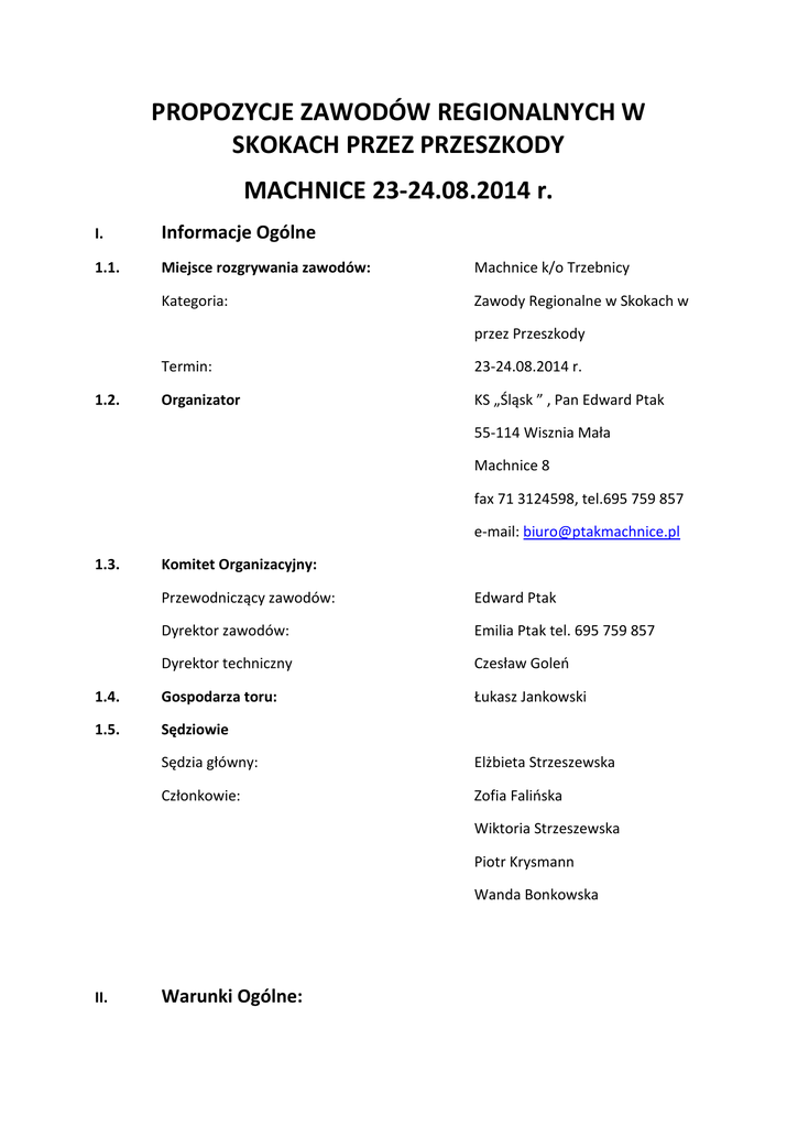 PROPOZYCJE ZAWODÓW REGIONALNYCH W SKOKACH PRZEZ PRZESZKODY MACHNICE 23-24.08.2014 r. I. Informacje Ogólne 1.1. Miejsce rozgrywania zawodów: Machnice k/o Trzebnicy Kategoria: Zawody Regionalne w Skokach w przez Przeszkody 1.2. Termin: 23-24.08.2014 r. Organizator KS „Śląsk ” , Pan Edward Ptak 55-114 Wisznia Mała Machnice 8 fax 71 3124598, tel.695 759 857 e-mail: [email protected] 1.3. Komitet Organizacyjny: Przewodniczący zawodów: Edward Ptak Dyrektor zawodów: Emilia Ptak tel. 695 759 857 Dyrektor techniczny Czesław Goleń 1.4. Gospodarza toru: Łukasz Jankowski 1.5. Sędziowie Sędzia główny: Elżbieta Strzeszewska Członkowie: Zofia Falińska Wiktoria Strzeszewska Piotr Krysmann Wanda Bonkowska II. Warunki Ogólne: 2.1. Zawody będą rozegrane zgodnie z przepisami PZJ III. Udział: 3.1. Kluby i sekcje zarejestrowane w PZJ. Organizator zastrzega sobie prawo ograniczenia liczby startujących do 200 koni. IV. WARUNKI TECHNICZE: 4.1. Zawody otwarte podłoże: piasek kwarcowy 4.2. Rozprężalnia podłoże: piasek kwarcowy V. WARUNKI UDZIAŁU: 5.1. Zawodnicy – na koszt własny, 5.2. Luzacy – na koszt własny, 5.3. Konie – koszt transportu pokrywają delegujący. VI. ZGŁOSZENIA I OPŁATY 6.1. Zgłoszenia zawodników i koni należy przesyłać w terminie do dnia: 20.08.2014 r. do godziny 18.00 Zgłoszenia prosimy wysyłać na drukach PZJ. Na zgłoszeniu należy podać adres e-mail lub telefon kontaktowy osoby zgłaszającej. 6.2. Opłaty startowe: Opłata 50 zł od każdego startu. Opłaty należy dokonywać w biurze zawodów najpóźniej na 2 godziny przed rozpoczęciem konkursów. Bez dokonanej wpłaty zawodnicy oraz konie będą skreślani z list startowych. Za każdą zmianę na listach startowych dokonaną później niż ww. terminie pobierana będzie opłata w wysokości 20.00zł. Informacje o rezygnacji ze startów należy podać organizatorowi najpóźniej do godz. 18:00 dnia poprzedzającego starty. 6.3. Boksy: Boksy zamawiać można do dnia 18.08.2014r. tylko na adres organizatora: [email protected] , tylko z dołączonym dowodem wpłaty, rezerwacja boksów jest ważna tylko z dowodem wpłaty. Rezerwację boksów prosimy robić do dnia 18.08.2014 r. PKO BP S.A. 55-100 Trzebnica, ul Henryka Pobożnego 1 Wojskowy Klub Sportowy „Śląsk” Wrocław 96 1020 5297 0000 1102 0153 8164 Z dopiskiem – Imię i Nazwisko/Klub_Opłata za boks ZR 2324.08.2014r. Opłaty za boksy nie podlegają zwrotowi w wypadku rezygnacji ze startów w zawodach . Opłata za boks: Opłata za boks za 2 dni zawodów (ściółka standard – słoma): 250 zł – stajnie namiotowe 350 zł – stajnie murowane Wszystkie boksy dostępne są od piątku 22.08.2014 od godz. 12.00 Ściółka- słoma. Istnieje możliwość dodatkowego zakupu: Siano: 15zł za balik trocin - 50zł za balot VII. Dokumenty i przepisy weterynaryjne: Konie muszą posiadać aktualne szczepienia, aktualną licencję. Bez w/w dokumentów konie nie będą dopuszczone do startu. Dokumentacja dla klubów i zawodników zgodna z wymaganiami Polskiego Związku Jeździeckiego VIII. Różne: 8.1. Organizator nie ponosi odpowiedzialności za zaistniałe szkody, wypadki i kradzieże. 9.2. W stajniach mogą przebywać tylko osoby biorące udział w zawodach trener, luzak, właściciel konia) oraz konie mające wykupione boksy. 9.3 Zgłoszenie się do zawodów jest równoznaczne z zaakceptowaniem propozycji zawodów, 9.3. Noclegi dla uczestników zawodów: - Dwa domki 6 osobowe na terenie zawodów (rezerwacja: 695 759 857) - Hotel Ptak, Adres: Świętego Wincentego 43, 50-251 Wrocław, Telefon:71 372 12 00, Cennik: Pokój 1 osobowy 170 zł / dobę Pokój 2 osobowy 210 zł / dobę Pokój 3 osobowy 280 zł / dobę Pokój 4 osobowy 370 zł / dobę W cenę wliczone jest pełne wyżywienie (śniadanie i obiadokolacja) Zniżka 20% dla uczestników zawodów. IX. Program Zawodów: Sobota 23.08.2014 r. Konkurs nr 1 – klasy LL (do 90 cm) dokładności bez rozgrywki art.238.1.1 Konkurs nr 2 – klasy L (100 cm) dokładności bez rozgrywki art.238.1.1 Konkurs nr 3–klasy P (110 cm) zwykły art.238.2.1 Konkurs nr 4- klasy N (120 cm) dwufazowy art.274.5.3 Konkurs nr 4a - klasy N-1 zwykły art.238.2.1 Niedziela 24.08.2014 r. Konkurs nr 8 – klasy LL (do 90) dokładności bez rozgrywki art.238.1.1 Konkurs nr 9 – klasy L (100) dokładności bez rozgrywki art.238.1.1 Konkurs nr 10 – klasy P (110cm) dwufazowy art.274.5.3 Konkurs nr 11- klasy N (120 cm) zwykły art.238.2.1 Konkurs nr11a - klasy N-1 zwykły art.238.2.1 W konkursach bez rozgrywki klasy LL i L (do 105 cm) duży koń w wieku od 6 lat może startować trzykrotnie w ciągu dnia z zachowaniem zasady dwukrotnego startu w konkursie . Organizator zastrzega sobie prawo zmian w programie. X. Nagrody: Konkursy 1,2,3,8,9,10,: flots Konkursy 4,11: I m. 300 zł, II m. 200 zł, III m. 100 zł Konkursy 4a, 11a : nagrody rzeczowe Propozycje zatwierdzone przez Dolnośląski Związek Jeździecki KODEKS POSTĘPOWANIAZ KONIEM Polski Związek Jeździecki prosi wszystkie osoby zaangażowane w jakikolwiek sposób w sporty konne, o przestrzeganie poniżej przedstawionego kodeksu oraz zasady, że dobro konia jest najważniejsze. Dobro konia musi być zawsze i wszędzie uwzględniane w sportach konnych i nie może być podporządkowane współzawodnictwu sportowemu ani innym celom np. komercyjnym. I. Na wszystkich etapach treningu i przygotowań konia do startu w zawodach, dobro konia musi stać ponad wszelkimi innymi wymaganiami. Dotyczy to stałej opieki, metod treningu, starannego obrządku, kucia i transportu. II. Konie i jeźdźcy muszą być wytrenowani, kompetentni i zdrowi zanim wezmą udział w zawodach. Odnosi się to także do podawania leków i środków medycznych, zabiegów chirurgicznych zagrażających dobru konia lub ciąży klaczy, oraz do przypadków nadużywania pomocy. III. Zawody nie mogą zagrażać dobru konia. Wymaga to zwrócenia szczególnej uwagi na teren zawodów, powierzchnię podł