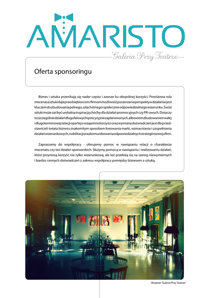 Oferta sponsoringu Biznes i sztuka przenikają się nader często i zawsze ku obopólnej korzyści. Prestiżowa rola mecenasa sztuki daje przedsiębiorcom/firmom możliwość poszerzania perspektyw działania i jest kluczem do zbudowania pełnego, szlachetnego i społecznie odpowiedzialnego wizerunku. Świat sztuki może zaś być unikalną inspiracją choćby dla działań promocyjnych czy PR-owych. Dotyczy to szczególnie działań długofalowych i precyzyjnie zaplanowanych, albowiem zbudowanie trwałej i długoterminowej relacji opartej o wzajemne korzyści oraz wymianę doświadczeń jest dla przedstawicieli świata biznesu znakomitym sposobem kreowania marki, wzmacniania i uzupełniania działań wizerunkowych, nobilitacji oraz komunikowania odpowiedzialnych strategii rozwoju firm. Zapraszamy do współpracy - oferujemy pomoc w nawiązaniu relacji o charakterze mecenatu czy też działań sponsorskich. Służymy pomocą w nawiązaniu i realizowaniu działań, które przyniosą korzyść nie tylko wizerunkową, ale też przełożą się na szereg niewymiernych i bardzo cennych doświadczeń z zakresu współpracy pomiędzy biznesem a sztuką. Wnętrze “Galeria Przy Teatrze” Projekty zrealizowane: Wernisaż Dominika Jasińskiego, 200 gości Wernisaż Magdaleny Nałęcz, 350 gości Wernisaż Marii Wollenberg - Kluzy, 350 gości Wernisaż Jasinski & friends, 300 gości Wernisaż Wojciecha Łukowskiego, 150 gości Wernisaż Cyryla Polaczka i Krzysztofa Nowickiego, 250 gości zobacz na www.galeriaprzyteatrze.pl Face Wojciech Łukowski Szanowni Państwo, Galeria Przy Teatrze nawiąże współpracę na zasadach sponsoringu z podmiotami, które jednorazowo lub przez czas określony zechcą wspierać nasze działania wystawiennicze. W zamian za dofinansowanie działań Galeria może przyznać różne moduły działań promocyjnych oraz tytuł: SPONSOR GALERII PRZY TEATRZE dotacja 59 000 zł (kwota netto) czas trwania świadczeń: 1 rok “Portret Leonor II” Magdalena Nałęcz GŁÓWNY SPONSOR WYSTAWY dotacja 19 000 zł (kwota netto) czas trwania świadczeń: 3 miesięcy SPONSOR WYSTAWY dotacja 9 000 zł (kwota netto) czas trwania świadczeń: 3 miesięcy Przedstawione pakiety działań stanowią punkt wyjścia do ustalenia szczegółowych warunków umowy sponsorskiej, które negocjujemy indywidualnie dla każdego sponsora oraz dla każdej imprezy. “Bo!” Dominik Jasiński Teatr Narodowy w Warszawie to jedno z najbardziej prestiżowych miejsc na mapie kulturalnej Mazowsza. Ta instytucja narodowa wraz z Operą Narodową i Muzeum Teatralnym mieści się w jednym budynku na Placu Teatralnym w samym sercu stolicy. Widownia Teatru Narodowego liczy ponad 500 miejsc, a przedstawienia grane są średnio 5 razy w tygodniu. Miesięcznie teatr odwiedza ponad 10 tysięcy widzów. Projekty planowane: Jasiński&friends (malarstwo, grafika, fotografia, digital) Bogna Hiszpańska (mozaika papierowa) Agata Czeremuszkin-Chrut (malarstwo) Justyna Kisielewicz (malarstwo) Kobieta w błekicie Krzysztof Nowicki Firmom, które zdecydują się na współpracę,oferujemynastępujące moduły działań promocyjnych: * *zasięg świadczeń jest uzależniony od wysokości dofinansowania. Bez tytułu Cyryl Polaczek Promocja w Galerii Przy Teatrze podziękowanie dla Sponsora podczas uroczystego otwarcia wystawy ekspozycja materiałów promocyjnych (ulotek, katalogów) na terenie Galerii Przy Teatrze na czas trwania umowy umożliwienie wystawienia roll-up na terenie Galerii Przy Teatrze w dniach wernisaży możliwość umieszczenia stoiska promocyjnego w siedzibie Galerii Promocja w drukach emitowanych przez galerię zamieszczenie logotypu Sponsora na zaproszeniach rozpowszechnianych wśród przedstawicieli świata kultury i sztuki zamieszczenie logotypu Sponsora na ulotkach i folderach zamieszczenie logotypu Sponsora w katalogu wystawy Promocje w sieci podziękowanie dla Sponsora w mailingu własnym Galerii zamieszczenie logotypu Sponsora na stronie internetowej Galerii w dziale Partnerzy promocja marki Sponsora na profilu Galerii Przy Teatrze w serwisach społecznościowych Inne zaproszenia do Teatrów Krystyny Jandy (Polonia lub Och-Teatr) w Warszawie zaproszenia do Galerii na inne wydarzenia kulturalne inne formy współpracy zaproponowane przez Państwa Galeria Przy Teatrze przekaże sponsorom ustaloną liczbę zaproszeń na wernisaż, wystawę oraz wydarzenia towarzyszące organizowane w Galerii ustaloną liczbę katalogów wydanych przy okazji wystawy kompletną dokumentację wizualną wystawy i wydarzeń wspartych przez Sponsora wraz z opisem zrealizowanych działań promocyjnych Patroni medialni Galerii: Łączę wyrazy szacunku, Maciej Maćkowiak +48 512 606 440 [email protected]