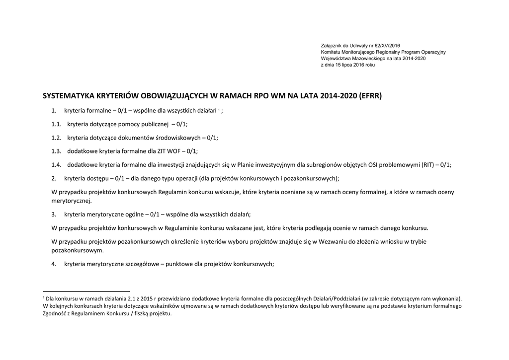 Załącznik do Uchwały nr 62/XV/2016 Komitetu Monitorującego Regionalny Program Operacyjny Województwa Mazowieckiego na lata 2014-2020 z dnia 15 lipca 2016 roku SYSTEMATYKA KRYTERIÓW OBOWIĄZUJĄCYCH W RAMACH RPO WM NA LATA 2014-2020 (EFRR) 1. kryteria formalne – 0/1 – wspólne dla wszystkich działań 1 ; 1.1. kryteria dotyczące pomocy publicznej – 0/1; 1.2. kryteria dotyczące dokumentów środowiskowych – 0/1; 1.3. dodatkowe kryteria formalne dla ZIT WOF – 0/1; 1.4. dodatkowe kryteria formalne dla inwestycji znajdujących się w Planie inwestycyjnym dla subregionów objętych OSI problemowymi (RIT) – 0/1; 2. kryteria dostępu – 0/1 – dla danego typu operacji (dla projektów konkursowych i pozakonkursowych); W przypadku projektów konkursowych Regulamin konkursu wskazuje, które kryteria oceniane są w ramach oceny formalnej, a które w ramach oceny merytorycznej. 3. kryteria merytoryczne ogólne – 0/1 – wspólne dla wszystkich działań; W przypadku projektów konkursowych w Regulaminie konkursu wskazane jest, które kryteria podlegają ocenie w ramach danego konkursu. W przypadku projektów pozakonkursowych określenie kryteriów wyboru projektów znajduje się w Wezwaniu do złożenia wniosku w trybie pozakonkursowym. 4. kryteria merytoryczne szczegółowe – punktowe dla projektów konkursowych; Dla konkursu w ramach działania 2.1 z 2015 r przewidziano dodatkowe kryteria formalne dla poszczególnych Działań/Poddziałań (w zakresie dotyczącym ram wykonania). W kolejnych konkursach kryteria dotyczące wskaźników ujmowane są w ramach dodatkowych kryteriów dostępu lub weryfikowane są na podstawie kryterium formalnego Zgodność z Regulaminem Konkursu / fiszką projektu. 1 W przypadku projektów konkursowych przyjmuje się, że projekt spełnia kryteria merytoryczne punktowe w sytuacji, gdy suma punktów uzyskanych podczas oceny kryteriów merytorycznych stanowi, co najmniej 60% maksymalnej możliwej do uzyskania liczby punktów. W uzasadnionych przypadkach, jeżeli wynika to z Regulaminu konkursu, dopuszcza się odstąpienie od wymogu 60% limitu punktów dopuszczającego projekt do dalszej oceny. 5. kryteria merytoryczne szczegółowe zgodności ze strategią ZIT WOF – punktowe dla projektów konkursowych, 0/1 dla projektów pozakonkursowych; W przypadku stosowania kryteriów punktowych kryteria: - stanowią minimum 30 % ogólnej liczby punktów możliwych do uzyskania na etapie oceny merytorycznej oraz - przyjmuje się, że projekt spełnia ww. kryteria w sytuacji, gdy projekt uzyska przynajmniej 50% maksymalnej liczby punktów. W przypadku kryteriów 0/1 uzyskanie przez projekt pozytywnej oceny oznacza spełnienie wszystkich 0/1 kryteriów. W zależności od specyfiki konkursu stosowane są wybrane pozycje kryteriów. W przypadku, gdy ocenie podlega projekt pozakonkursowy, zapis dotyczący Regulaminu konkursu odnosi się do Wezwania do złożenia wniosku w trybie pozakonkursowym. 1. KRYTERIA FORMALNE Lp. Nazwa kryterium Opis kryterium 1. W ramach kryterium weryfikowane będzie, czy łącznie zostały spełnione następujące elementy: a) wniosek o dofinansowanie wraz z załącznikami zostały podpisane przez osobę upoważnioną do reprezentowania wnioskodawcy w sposób określony w Regulaminie konkursu; b) wszystkie wymagane pola wniosku o dofinansowanie zostały wypełnione c) pola opisowe wypełniono treścią dającą się interpretować znaczeniowo, zapisaną w języku polskim; d) wnioskodawca złożył wszystkie wymagane oświadczenia znajdujące się we wniosku o dofinansowanie; e) wnioskodawca złożył wszystkie wymagane załączniki – zgodnie z Regulaminem konkursu / w przypadku projektów pozakonkursowych zgodnie z wykazem załączników niezbędnych do złożenia wniosku; f) załączniki do wniosku o dofinansowanie są aktualne i sporządzone na właściwych formularzach/we właściwej formie; g) uzupełnienie wniosku o dofinansowanie zostało złożone w terminie określonym w piśmie o uzupełnienie wniosku (jeśli dotyczy). W ramach kryterium weryfikowane będzie czy wnioskodawca (oraz partnerzy – jeśli dotyczy) nie podlega/podlegają wykluczeniu z ubiegania się o dofinansowanie. Ocena w ramach kryterium odbywa się w oparciu o oświadczenia złożone przez wnioskodawcę stanowiące integralna część wniosku o dofinansowanie projektu. W ramach kryterium ocenie podlega: czy kategoria wnioskodawcy jest zgodna listą podmiotów uprawnionych do ubiegania się o dofinansowanie wskazaną w Regulaminie konkursu lub Wykazem Projektów Pozakonkursowych EFRR RPO WM 2014-2020 (w przypadku projektów pozakonkursowych); czy w przypadku projektów realizowanych w partnerstwie, partnerstwo jest zgodne z zapisami Regulaminu konkursu. W ramach kryterium ocenie podlega czy: 2. 3. 4. Poprawność i kompletność złożenia wniosku o dofinansowanie projektu oraz załączników. Wnioskodawca (oraz Partnerzy) nie podlega/ podlegają wykluczeniu z ubiegania się o dofinansowanie Kwalifikowalność wnioskodawcy Kwalifikowalność projektu Punktacja Możliwość uzupełnienia 0/1 TAK 0/1 NIE 0/1 TAK 0/1 TAK a) projekt realizowany będzie na terenie województwa mazowieckiego lub zgodnie z zapisami Regulaminu konkursu /formularzu projektu pozakonkursowego EFRR RPO 2014-2020 w przypadku projektów pozakonkursowych; b) projekt jest zgodny z celami działania/poddziałania; c) typ projektu jest zgodny z typem działania/poddziałania; d) projekt jest zgodny z przepisami art. 65 ust. 6 i art. 125 ust. 3 lit. e) i f) Rozporządzenia Parlamentu Europejskiego i Rady (UE) nr 1303/2013 z dnia 17 grudnia 2013 r. tj.: - projekt nie został zakończony w rozumieniu art. 65 ust. 6, - wnioskodawca nie rozpoczął realizacji projektu przed dniem złożenia wniosku o dofinansowanie albo, że realizując projekt przed dniem złożenia wniosku, przestrzegał obowiązujących przepisów prawa dotyczących danej operacji 2 (art. 125 ust. 3 lit. e), - projekt nie obejm