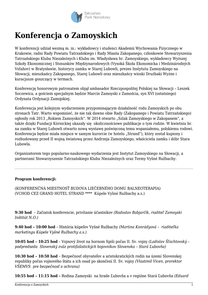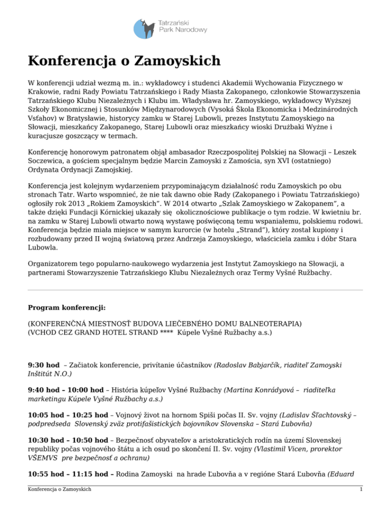 Konferencja o Zamoyskich W konferencji udział wezmą m. in.: wykładowcy i studenci Akademii Wychowania Fizycznego w Krakowie, radni Rady Powiatu Tatrzańskiego i Rady Miasta Zakopanego, członkowie Stowarzyszenia Tatrzańskiego Klubu Niezależnych i Klubu im. Władysława hr. Zamoyskiego, wykładowcy Wyższej Szkoły Ekonomicznej i Stosunków Międzynarodowych (Vysoká Škola Ekonomicka i Medzinárodných Vsťahov) w Bratysławie, historycy zamku w Starej Lubowli, prezes Instytutu Zamoyskiego na Słowacji, mieszkańcy Zakopanego, Starej Lubowli oraz mieszkańcy wioski Drużbaki Wyżne i kuracjusze goszczący w termach. Konferencję honorowym patronatem objął ambasador Rzeczpospolitej Polskiej na Słowacji – Leszek Soczewica, a gościem specjalnym będzie Marcin Zamoyski z Zamościa, syn XVI (ostatniego) Ordynata Ordynacji Zamojskiej. Konferencja jest kolejnym wydarzeniem przypominającym działalność rodu Zamoyskich po obu stronach Tatr. Warto wspomnieć, że nie tak dawno obie Rady (Zakopanego i Powiatu Tatrzańskiego) ogłosiły rok 2013 „Rokiem Zamoyskich”. W 2014 otwarto „Szlak Zamoyskiego w Zakopanem”, a także dzięki Fundacji Kórnickiej ukazały się okolicznościowe publikacje o tym rodzie. W kwietniu br. na zamku w Starej Lubowli otwarto nową wystawę poświęconą temu wspaniałemu, polskiemu rodowi. Konferencja będzie miała miejsce w samym kurorcie (w hotelu „Strand”), który został kupiony i rozbudowany przed II wojną światową przez Andrzeja Zamoyskiego, właściciela zamku i dóbr Stara Lubowla. Organizatorem tego popularno-naukowego wydarzenia jest Instytut Zamoyskiego na Słowacji, a partnerami Stowarzyszenie Tatrzańskiego Klubu Niezależnych oraz Termy Vyšné Ružbachy. Program konferencji: (KONFERENČNÁ MIESTNOSŤ BUDOVA LIEČEBNÉHO DOMU BALNEOTERAPIA) (VCHOD CEZ GRAND HOTEL STRAND **** Kúpele Vyšné Ružbachy a.s.) 9:30 hod – Začiatok konferencie, privítanie účastníkov (Radoslav Babjarčík, riaditeľ Zamoyski Inštitút N.O.) 9:40 hod – 10:00 hod – História kúpeľov Vyšné Ružbachy (Martina Konrádyová – riaditeľka marketingu Kúpele Vyšné Ružbachy a.s.) 10:05 hod – 10:25 hod – Vojnový život na hornom Spiši počas II. Sv. vojny (Ladislav Šľachtovský – podpredseda Slovenský zväz protifašistických bojovníkov Slovenska – Stará Ľubovňa) 10:30 hod – 10:50 hod – Bezpečnosť obyvateľov a aristokratických rodín na území Slovenskej republiky počas vojnového štátu a ich osud po skončení II. Sv. vojny (Vlastimil Vicen, prorektor VŠEMVS pre bezpečnosť a ochranu) 10:55 hod – 11:15 hod – Rodina Zamoyski na hrade Ľubovňa a v regióne Stará Ľubovňa (Eduard Konferencja o Zamoyskich 1 Laincz, historik Ľubovnianske múzeum) 11:20 hod – 11:40 hod – Rodina Zamoyski v kontexte Katolíckej Cirkvi a službe pre spoločnosť (Radoslav Babjarčík, riaditeľ Zamoyski Inštitút N.O.) Premiéra dokumentárneho filmu z dielne slovenského režiséra pána Štefana Dlugolinského pod názvom: ,,Storočia v kameni“ 12:15 hod – 13:15 hod – obedňajšia prestávka – spoločný obed (Kúpele Vyšné Ružbachy a.s.) 13:15 hod – 13:45 hod – Kraľowska hrobka rodu Zamoyski – cintorin Vyžné Ružbachy Uroczyste złożenie kwiatów na grobie Zamoyskich w Rużbachach Wyżnych Wystąpienie Marcina hr. Zamoyskiego z Zamościa, syna ostatniego XVI Ordynata 13:45 hod – 14:05 hod – Uzdrowiska w Dolinie Popradu (dr hab. Zygmunt Kruczek, Akademia Wychowania Fizycznego w Krakowie) 14:10 hod – 14:30 hod – Władysław hr. Zamoyski – życie i działalność (dr hab. Jerzy M. Roszkowski, Akademia Wychowania Fizycznego w Krakowie) 14:35 hod – 14:55 hod – Władysław hr. Zamoyski a spór o Morskie Oko (mgr Piotr Bąk, Starosta Tatrzański, prezes Stowarzyszenia im. Wł. hr. Zamoyskiego w Zakopanem) 15:00 hod – 15:20 hod – Ród Zamoyskich w Polsce – zarys dziejów (mgr Adam Kitkowski, wiceprezes Stowarzyszenia Tatrzańskiego Klubu Niezależnych w Zakopanem) Film dokumentalny polskiego reżysera Janusza Sidora „Władysław hr. Zamoyski, Pan z Wielkopolski – Władca Tatr“ Zakończenie/Zaver Imprezy towarzyszące: ● ● Zwiedzanie zamku w Starej Lubowli i wystawy „Zamoyscy właściciele Lubowni 1882–1944“ – około godziny 16:30. Zwiedzanie uzdrowiska Rużbachy Wyżne, założonego przez rodzinę Zamoyskich. (Dla uczestników konferencji zwiedzanie będzie bezpłatne). Konferencja o Zamoyskich 2