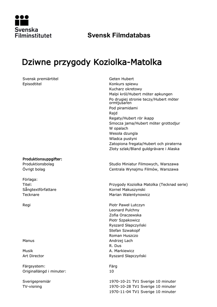 Svensk Filmdatabas Dziwne przygody Koziolka-Matolka Svensk premiärtitel Episodtitel Geten Hubert Konkurs spiewu Kucharz okretowy Malpi król/Hubert möter apkungen Po drugiej stronie teczy/Hubert möter ormtjusaren Pod piramidami Rajd Regaty/Hubert rör ikapp Smocza jama/Hubert möter grottodjur W opalach Wesola dzungla Wladca pustyni Zatopiona fregata/Hubert och piraterna Zloty szlak/Bland guldgrävare i Alaska Produktionsuppgifter: Produktionsbolag Övrigt bolag Studio Miniatur Filmowych, Warszawa Centrala Wynajmu Filmów, Warszawa Förlaga: Titel: Sångtextförfattare Tecknare Przygody Koziolka Matolka (Tecknad serie) Kornel Makuszynski Marian Walentynowicz Regi Musik Art Director Piotr Paweł Lutczyn Leonard Pulchny Zofia Oraczewska Piotr Szpakowicz Ryszard Słapczyński Stefan Szwakopf Roman Huszczo Andrzej Lach R. Dus A. Markiewicz Ryszard Słapczyński Färgsystem: Originallängd i minuter: Färg 10 Sverigepremiär TV-visning 1970-10-21 TV1 Sverige 10 minuter 1970-10-28 TV1 Sverige 10 minuter 1970-11-04 TV1 Sverige 10 minuter Manus Svensk Filmdatabas Urpremiär 1970-11-11 TV1 Sverige 10 1970-11-18 TV1 Sverige 10 1970-11-25 TV1 Sverige 10 1971-02-07 TV1 Sverige 10 1971-02-21 TV1 Sverige 10 1971-03-07 TV1 Sverige 10 1971-03-21 TV1 Sverige 10 1971-04-04 TV1 Sverige 10 1972-10-30 TV1 Sverige 10 1969 TVP Polen 10 minuter minuter minuter minuter minuter minuter minuter minuter minuter minuter