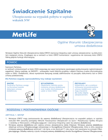 Świadczenie Szpitalne Świadczenie Szpitalne Ubezpieczenie na wypadek pobytu w szpitalu wskutek NW Ogólne Warunki Ubezpieczenia umowa dodatkowa Niniejsze Ogólne Warunki Ubezpieczenia (dalej OWU) stanowią integralną część umowy ubezpieczenia i są dokumentem wiążącym strony. Znajdujące się w ramkach w treści OWU komentarze i wyjaśnienia nie stanowią treści OWU. Pełnią jedynie funkcję informacyjną. POMOC Szanowni Państwo, w ramkach umieszczonych w treści OWU pojawiają się nasze komentarze zawierające podsumowanie najistotniejszych zagadnień. Mamy nadzieję, że SNOOPY – ambasador marki MetLife przybliży i objaśni Państwu trudne sformułowania użyte w OWU. Dodatkowo, słowa wyróżnione kursywą zostały zdefiniowane na początku dokumentu lub w OWU umowy podstawowej. Dla Państwa wygody wprowadziliśmy trzy rodzaje wyróżnień: WAŻNE Zwracamy Państwa uwagę na kluczowe kwestie dotyczące umowy dodatkowej. WYJAŚNIENIA Objaśniamy niektóre postanowienia umowy dodatkowej oraz trudne sformułowania użyte w treści OWU. PRZYKŁADY Wyjaśniamy, jak w praktyce stosowane są postanowienia umowy dodatkowej i jakie mają znaczenie dla osoby objętej ubezpieczeniem. Drawn by LoBianco Studios for Life Advice "Protecting Your Child" Brochure 4/97 ROZDZIAŁ I. POSTANOWIENIA OGÓLNE ARTYKUŁ 1. WSTĘP 1.Niniejsze OWU mają zastosowanie do umowy dodatkowej Ubezpieczenia na wypadek pobytu w szpitalu wskutek NW zawartej pomiędzy MetLife Towarzystwo Ubezpieczeń na Życie i Reasekuracji Spółka Akcyjna z siedzibą w Warszawie a Ubezpieczającym i stanowią integralną część tej umowy dodatkowej. 2.Niniejsza umowa dodatkowa jest częścią umowy ubezpieczenia (dalej Umowa). Niniejsza umowa dodatkowa obejmuje ochroną Ubezpieczonego wskazanego w Szczegółowej Umowie Ubezpieczenia, który w dniu zawarcia niniejszej umowy dodatkowej ukończył 1 rok życia, a nie ukończył 71 roku życia i jest zawierana na wniosek Ubezpieczającego. Składkę należną z tytułu niniejszej umowy dodatkowej określa Szczegółowa Umowa Ubezpieczenia. 1 Świadczenie Szpitalne ARTYKUŁ 2. DEFINICJE Użyte w niniejszych OWU określenia oznaczają: 1.hospitalizacja – pobyt w szpitalu służący zachowaniu, przywracaniu lub poprawie zdrowia chorych na zlecenie lekarza. Hospitalizacją nie jest w rozumieniu niniejszych OWU pobyt w szpitalu w celach opiekuńczych, pielęgnacyjnych, paliatywnych, hospicyjnych, z zakresu opieki długoterminowej, rehabilitacji leczniczej, leczenia uzależnień, psychiatrycznej opieki zdrowotnej oraz lecznictwa uzdrowiskowego, 2. nieszczęśliwy wypadek (NW) – niezależne od woli Ubezpieczonego, gwałtowne i nagłe zdarzenie wywołane przyczyną zewnętrzną, niezwiązane z jakimkolwiek istniejącym stanem chorobowym, WAŻNE: Prosimy o zwrócenie uwagi, iż zdarzenia takie jak zawał serca, udar lub wylew nie są wywołane przyczyną zewnętrzną, a zatem nie są traktowane jako nieszczęśliwy wypadek. Drawn by LoBianco Studios for Life Advice 3. pacjent stały – osobę, której hospitalizacja w związku z uszkodzeniem ciała w następstwie nie"Protecting Your Child" Brochure 4/97 szczęśliwego wypadku trwała co najmniej 24 godziny, licząc od momentu wpisania do chwili wypisania ze szpitala, 4. pasażerskie licencjonowane linie lotnicze – przedsiębiorstwo transportu lotniczego posiadające wszelkie zezwolenia uprawniające zarówno do regularnego, jak i na podstawie umowy czarteru, odpłatnego przewozu osób, 5.szpital – działające zgodnie z prawem przedsiębiorstwo podmiotu leczniczego, którego zadaniem jest całodzienna lub całodobowa opieka nad chorymi i ich leczenie w warunkach stałych i specjalnie do tych celów przystosowanych pomieszczeniach, posiadające odpowiednią infrastrukturę do przeprowadzania badań diagnostycznych i wykonywania zabiegów chirurgicznych przez wykwalifikowany personel medyczny, 6. uszkodzenie ciała – fizyczne obrażenie ciała Ubezpieczonego będące następstwem nieszczęśliwego wypadku zaistniałego w czasie trwania niniejszej umowy dodatkowej. ROZDZIAŁ II. OCHRONA UBEZPIECZENIOWA I JEJ ZAKRES ARTYKUŁ 3. PRZEDMIOT UBEZPIECZENIA Przedmiotem niniejszego ubezpieczenia jest ochrona zdrowia Ubezpieczonego. WAŻNE: Ochrona ubezpieczeniowa trwa przez 24 godziny na dobę na całym świecie. ARTYKUŁ 4. ZAKRES OCHRONY Drawn by LoBianco Studios for Life Advice "Protecting Your Child" Brochure 4/97 1. Zakres ochrony niniejszej umowy dodatkowej obejmuje świadczenie szpitalne wskutek nieszczęśliwego wypadku. 2. Towarzystwo wypłaci Ubezpieczonemu świadczenie szpitalne pomniejszone o wymagalne wierzytelności wynikające z Umowy, jeżeli w następstwie uszkodzenia ciała będącego skutkiem nieszczęśliwego wypadku, które powstało po rozpoczęciu ochrony przewidzianej niniejszą umową dodatkową, Ubezpieczony przez przynajmniej 4 kolejne dni podlegał hospitalizacji jako pacjent stały. 3. Dzienna wysokość świadczenia szpitalnego jest wskazana w Szczegółowej Umowie Ubezpieczenia jako suma ubezpieczenia z tego tytułu. 4. Świadczenie szpitalne jest płatne od 1 dnia hospitalizacji, pod warunkiem że hospitalizacja trwała co najmniej 4 dni. 5.Okres hospitalizacji, za który naliczane jest świadczenie za pobyt w szpitalu dla każdego roku trwania niniejszej umowy dodatkowej, nie może przekroczyć 180 dni. 6. Następujące po sobie okresy hospitalizacji spowodowane tymi samymi przyczynami będą uznawane za spowodowane tym samym nieszczęśliwym wypadkiem, chyba że okres między tymi hospitalizacjami będzie dłuższy niż 12 miesięcy. 7. Wypłata świadczenia szpitalnego nastąpi z zastrzeżeniem postanowień zawartych w rozdziale Ograniczenia odpowiedzialności Towarzystwa. WAŻNE: Prosimy zwrócić uwagę, że świadczenie szpitalne wypłacane jest aż za maksymalnie 180 dni pobytu w szpitalu będącego następstwem nieszczęśliwego wypadku. Jeżeli pobyt w szpitalu trwał krócej niż 4 dni, św