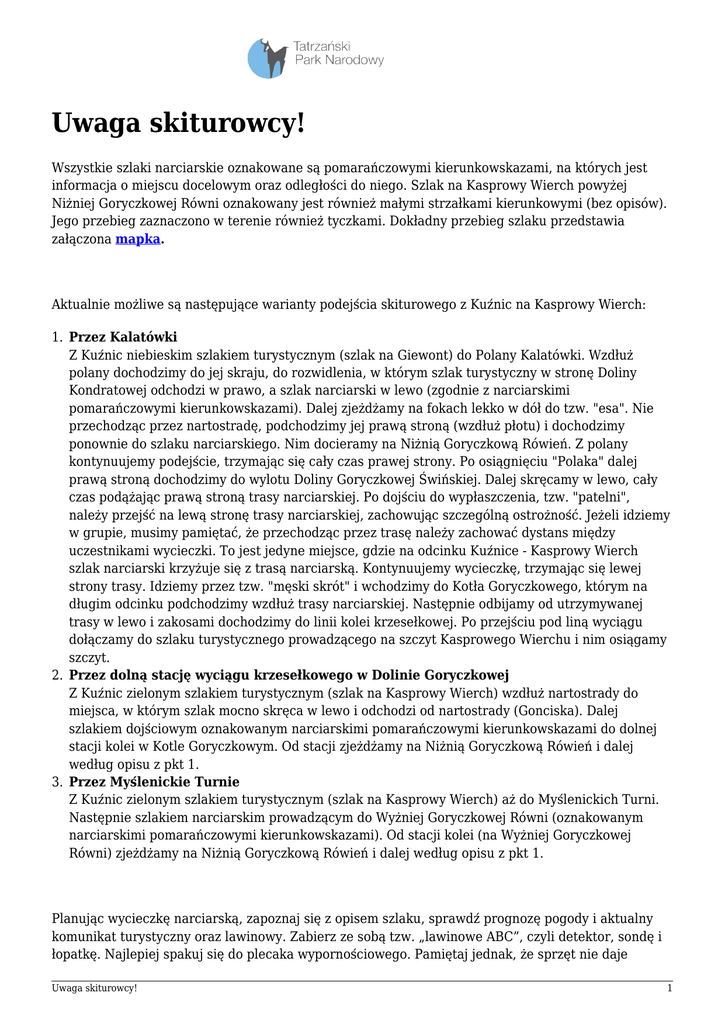 Uwaga skiturowcy! Wszystkie szlaki narciarskie oznakowane są pomarańczowymi kierunkowskazami, na których jest informacja o miejscu docelowym oraz odległości do niego. Szlak na Kasprowy Wierch powyżej Niżniej Goryczkowej Równi oznakowany jest również małymi strzałkami kierunkowymi (bez opisów). Jego przebieg zaznaczono w terenie również tyczkami. Dokładny przebieg szlaku przedstawia załączona mapka. Aktualnie możliwe są następujące warianty podejścia skiturowego z Kuźnic na Kasprowy Wierch: 1. Przez Kalatówki Z Kuźnic niebieskim szlakiem turystycznym (szlak na Giewont) do Polany Kalatówki. Wzdłuż polany dochodzimy do jej skraju, do rozwidlenia, w którym szlak turystyczny w stronę Doliny Kondratowej odchodzi w prawo, a szlak narciarski w lewo (zgodnie z narciarskimi pomarańczowymi kierunkowskazami). Dalej zjeżdżamy na fokach lekko w dół do tzw. "esa". Nie przechodząc przez nartostradę, podchodzimy jej prawą stroną (wzdłuż płotu) i dochodzimy ponownie do szlaku narciarskiego. Nim docieramy na Niżnią Goryczkową Rówień. Z polany kontynuujemy podejście, trzymając się cały czas prawej strony. Po osiągnięciu "Polaka" dalej prawą stroną dochodzimy do wylotu Doliny Goryczkowej Świńskiej. Dalej skręcamy w lewo, cały czas podążając prawą stroną trasy narciarskiej. Po dojściu do wypłaszczenia, tzw. "patelni", należy przejść na lewą stronę trasy narciarskiej, zachowując szczególną ostrożność. Jeżeli idziemy w grupie, musimy pamiętać, że przechodząc przez trasę należy zachować dystans między uczestnikami wycieczki. To jest jedyne miejsce, gdzie na odcinku Kuźnice - Kasprowy Wierch szlak narciarski krzyżuje się z trasą narciarską. Kontynuujemy wycieczkę, trzymając się lewej strony trasy. Idziemy przez tzw. "męski skrót" i wchodzimy do Kotła Goryczkowego, którym na długim odcinku podchodzimy wzdłuż trasy narciarskiej. Następnie odbijamy od utrzymywanej trasy w lewo i zakosami dochodzimy do linii kolei krzesełkowej. Po przejściu pod liną wyciągu dołączamy do szlaku turystycznego prowadzącego na szczyt Kasprowego Wierchu i nim osiągamy szczyt. 2. Przez dolną stację wyciągu krzesełkowego w Dolinie Goryczkowej Z Kuźnic zielonym szlakiem turystycznym (szlak na Kasprowy Wierch) wzdłuż nartostrady do miejsca, w którym szlak mocno skręca w lewo i odchodzi od nartostrady (Gonciska). Dalej szlakiem dojściowym oznakowanym narciarskimi pomarańczowymi kierunkowskazami do dolnej stacji kolei w Kotle Goryczkowym. Od stacji zjeżdżamy na Niżnią Goryczkową Rówień i dalej według opisu z pkt 1. 3. Przez Myślenickie Turnie Z Kuźnic zielonym szlakiem turystycznym (szlak na Kasprowy Wierch) aż do Myślenickich Turni. Następnie szlakiem narciarskim prowadzącym do Wyżniej Goryczkowej Równi (oznakowanym narciarskimi pomarańczowymi kierunkowskazami). Od stacji kolei (na Wyżniej Goryczkowej Równi) zjeżdżamy na Niżnią Goryczkową Rówień i dalej według opisu z pkt 1. Planując wycieczkę narciarską, zapoznaj się z opisem szlaku, sprawdź prognozę pogody i aktualny komunikat turystyczny oraz lawinowy. Zabierz ze sobą tzw. „lawinowe ABC”, czyli detektor, sondę i łopatkę. Najlepiej spakuj się do plecaka wypornościowego. Pamiętaj jednak, że sprzęt nie daje Uwaga skiturowcy! 1 gwarancji bezpieczeństwa, zależy ono głównie od Twoich decyzji. Informacje o warunkach na szlakach i aktualnym zagrożeniu lawinowym uzyskasz w Punkcie Informacji turystycznej TPN, ul. Chałubińskiego 44 w Zakopanem lub pod telefonem: (+48) 18 20 23 300. Więcej informacji znajdziesz w książce "Tatry na nartach. Przewodnik skiturowy" Wojciecha Szatkowskiego, która ukazała się w ubiegłym roku nakładem Wydawnictw Tatrzańskiego Parku Narodowego. Regulacje wprowadziliśmy w trosce o dobro przyrody i bezpieczeństwo narciarzy. Prosimy o ich respektowanie. Życzymy udanej i bezpiecznej wyprawy! Uwaga skiturowcy! 2