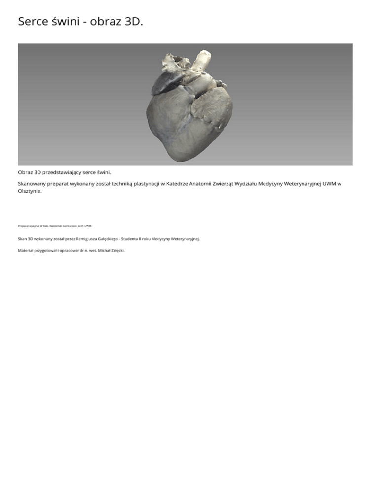 Serce świni - obraz 3D. Obraz 3D przedstawiający serce świni. Skanowany preparat wykonany został techniką plastynacji w Katedrze Anatomii Zwierząt Wydziału Medycyny Weterynaryjnej UWM w Olsztynie. Preparat wykonał dr hab. Waldemar Sienkiewicz, prof. UWM. Skan 3D wykonany został przez Remigiusza Gałęckiego - Studenta II roku Medycyny Weterynaryjnej. Materiał przygotował i opracował dr n. wet. Michał Załęcki.