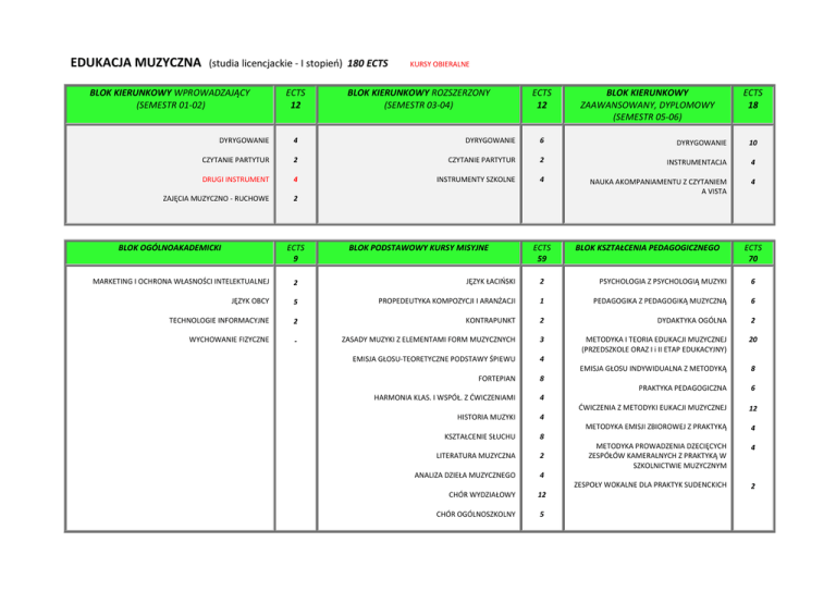 EDUKACJA MUZYCZNA (studia licencjackie - I stopień) 180 ECTS BLOK KIERUNKOWY WPROWADZAJĄCY (SEMESTR 01-02) ECTS 12 KURSY OBIERALNE BLOK KIERUNKOWY ROZSZERZONY (SEMESTR 03-04) ECTS 12 BLOK KIERUNKOWY ZAAWANSOWANY, DYPLOMOWY (SEMESTR 05-06) ECTS 18 DYRYGOWANIE 4 DYRYGOWANIE 6 DYRYGOWANIE 10 CZYTANIE PARTYTUR 2 CZYTANIE PARTYTUR 2 INSTRUMENTACJA 4 DRUGI INSTRUMENT 4 INSTRUMENTY SZKOLNE 4 4 ZAJĘCIA MUZYCZNO - RUCHOWE 2 NAUKA AKOMPANIAMENTU Z CZYTANIEM A VISTA BLOK OGÓLNOAKADEMICKI ECTS 9 BLOK PODSTAWOWY KURSY MISYJNE ECTS 59 BLOK KSZTAŁCENIA PEDAGOGICZNEGO ECTS 70 MARKETING I OCHRONA WŁASNOŚCI INTELEKTUALNEJ 2 JĘZYK ŁACIŃSKI 2 PSYCHOLOGIA Z PSYCHOLOGIĄ MUZYKI 6 JĘZYK OBCY 5 PROPEDEUTYKA KOMPOZYCJI I ARANŻACJI 1 PEDAGOGIKA Z PEDAGOGIKĄ MUZYCZNĄ 6 TECHNOLOGIE INFORMACYJNE 2 KONTRAPUNKT 2 DYDAKTYKA OGÓLNA 2 WYCHOWANIE FIZYCZNE - ZASADY MUZYKI Z ELEMENTAMI FORM MUZYCZNYCH 3 METODYKA I TEORIA EDUKACJI MUZYCZNEJ (PRZEDSZKOLE ORAZ I i II ETAP EDUKACYJNY) 20 EMISJA GŁOSU-TEORETYCZNE PODSTAWY ŚPIEWU 4 EMISJA GŁOSU INDYWIDUALNA Z METODYKĄ 8 FORTEPIAN 8 PRAKTYKA PEDAGOGICZNA 6 HARMONIA KLAS. I WSPÓŁ. Z ĆWICZENIAMI 4 ĆWICZENIA Z METODYKI EUKACJI MUZYCZNEJ 12 HISTORIA MUZYKI 4 METODYKA EMISJI ZBIOROWEJ Z PRAKTYKĄ 4 KSZTAŁCENIE SŁUCHU 8 2 METODYKA PROWADZENIA DZECIĘCYCH ZESPÓŁÓW KAMERALNYCH Z PRAKTYKĄ W SZKOLNICTWIE MUZYCZNYM 4 LITERATURA MUZYCZNA ANALIZA DZIEŁA MUZYCZNEGO 4 ZESPOŁY WOKALNE DLA PRAKTYK SUDENCKICH 2 CHÓR WYDZIAŁOWY 12 CHÓR OGÓLNOSZKOLNY 5 PRZEDMIOTY FAKULTATYWNE ECTS 10 METODYKA KSZTAŁCENIA SŁUCHU Z PRAKTYKĄ W PODSTAWOWEJ SZKOLE MUZYCZNEJ 2 METODYKA PROWADZENIA ZAJĘĆ Z AUDYCJI MUZYCZNYCH Z PRAKTYKĄ W PODSTAWOWEJ SZKOLE MUZYCZNEJ 2 CHÓR KAMERALNY 6 DYRYGENTURA CHÓRALNA ECTS 12 DYRYGOWANIE 4 CZYTANIE PARTYTUR 2 EMISJA GŁOSU INDYWIDUALNA Z METODYKĄ 2 PRAKTYKA CHÓRALNA 4 MUZYKA KOŚCIELNA ECTS 11 WOKALISTYKA JAZZOWA ECTS 19 ORGANY (od 1 do 4 semestru jako drugi instrument) 2 ŚPIEW JAZZOWY Z IMPROWIZACJĄ GŁOSU I RUCHEM 6 LITURGIKA 1 HARMONIA JAZZOWA 2 MUZYKA W LITURGII 1 JAZZOWY ZESPÓŁ WOKALNY 4 IMPROWIZACJA ORGANOWA Z PRAKTYKĄ LITURGICZNĄ 2 PRACA Z KOREPETYTOREM 6 2 TECHNIKA PRACY W STUDIO I ELEMENTY NAGŁOŚNIENIA 1 PRAWO KOŚCIELNE I POKREWNE HARMONIA PRAKTYCZNA 1 AKOMPANIAMENT LITURGICZNY Z HARMONIĄ MODALNĄ 2