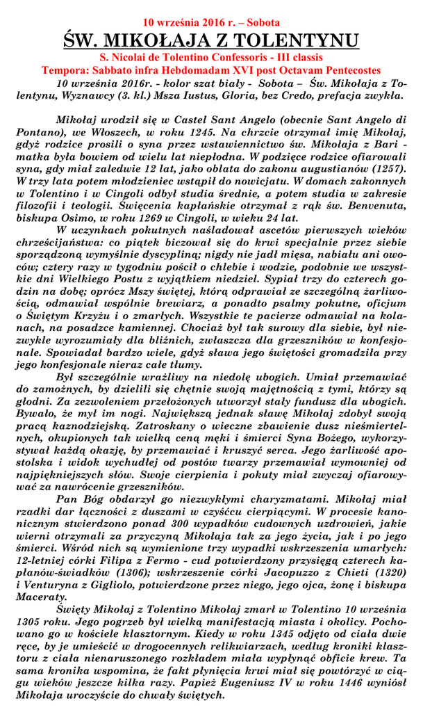 10 września 2016 r. – Sobota ŚW. MIKOŁAJA Z TOLENTYNU S. Nicolai de Tolentino Confessoris - III classis Tempora: Sabbato infra Hebdomadam XVI post Octavam Pentecostes 10 września 2016r. - kolor szat biały - Sobota – Św. Mikołaja z Tolentynu, Wyznawcy (3. kl.) Msza Iustus, Gloria, bez Credo, prefacja zwykła. Mikołaj urodził się w Castel Sant Angelo (obecnie Sant Angelo di Pontano), we Włoszech, w roku 1245. Na chrzcie otrzymał imię Mikołaj, gdyż rodzice prosili o syna przez wstawiennictwo św. Mikołaja z Bari matka była bowiem od wielu lat niepłodna. W podzięce rodzice ofiarowali syna, gdy miał zaledwie 12 lat, jako oblata do zakonu augustianów (1257). W trzy lata potem młodzieniec wstąpił do nowicjatu. W domach zakonnych w Tolentino i w Cingoli odbył studia średnie, a potem studia w zakresie filozofii i teologii. Święcenia kapłańskie otrzymał z rąk św. Benvenuta, biskupa Osimo, w roku 1269 w Cingoli, w wieku 24 lat. W uczynkach pokutnych naśladował ascetów pierwszych wieków chrześcijaństwa: co piątek biczował się do krwi specjalnie przez siebie sporządzoną wymyślnie dyscypliną; nigdy nie jadł mięsa, nabiału ani owoców; cztery razy w tygodniu pościł o chlebie i wodzie, podobnie we wszystkie dni Wielkiego Postu z wyjątkiem niedziel. Sypiał trzy do czterech godzin na dobę; oprócz Mszy świętej, którą odprawiał ze szczególną żarliwością, odmawiał wspólnie brewiarz, a ponadto psalmy pokutne, oficjum o Świętym Krzyżu i o zmarłych. Wszystkie te pacierze odmawiał na kolanach, na posadzce kamiennej. Chociaż był tak surowy dla siebie, był niezwykle wyrozumiały dla bliźnich, zwłaszcza dla grzeszników w konfesjonale. Spowiadał bardzo wiele, gdyż sława jego świętości gromadziła przy jego konfesjonale nieraz całe tłumy. Był szczególnie wrażliwy na niedolę ubogich. Umiał przemawiać do zamożnych, by dzielili się chętnie swoją majętnością z tymi, którzy są głodni. Za zezwoleniem przełożonych utworzył stały fundusz dla ubogich. Bywało, że mył im nogi. Największą jednak sławę Mikołaj zdobył swoją pracą kaznodziejską. Zatroskany o wieczne zbawienie dusz nieśmiertelnych, okupionych tak wielką ceną męki i śmierci Syna Bożego, wykorzystywał każdą okazję, by przemawiać i kruszyć serca. Jego żarliwość apostolska i widok wychudłej od postów twarzy przemawiał wymowniej od najpiękniejszych słów. Swoje cierpienia i pokuty miał zwyczaj ofiarowywać za nawrócenie grzeszników. Pan Bóg obdarzył go niezwykłymi charyzmatami. Mikołaj miał rzadki dar łączności z duszami w czyśćcu cierpiącymi. W procesie kanonicznym stwierdzono ponad 300 wypadków cudownych uzdrowień, jakie wierni otrzymali za przyczyną Mikołaja tak za jego życia, jak i po jego śmierci. Wśród nich są wymienione trzy wypadki wskrzeszenia umarłych: 12-letniej córki Filipa z Fermo - cud potwierdzony przysięgą czterech kapłanów-świadków (1306); wskrzeszenie córki Jacopuzzo z Chieti (1320) i Venturyna z Gigliolo, potwierdzone przez niego, jego ojca, żonę i biskupa Maceraty. Święty Mikołaj z Tolentino Mikołaj zmarł w Tolentino 10 września 1305 roku. Jego pogrzeb był wielką manifestacją miasta i okolicy. Pochowano go w kościele klasztornym. Kiedy w roku 1345 odjęto od ciała dwie ręce, by je umieścić w drogocennych relikwiarzach, według kroniki klasztoru z ciała nienaruszonego rozkładem miała wypłynąć obficie krew. Ta sama kronika wspomina, że fakt płynięcia krwi miał się powtórzyć w ciągu wieków jeszcze kilka razy. Papież Eugeniusz IV w roku 1446 wyniósł Mikołaja uroczyście do chwały świętych. 3 klasy Szaty białe Ps 91,13-14 Iustus ut palma florébit: sicut cedrus Líbani multiplicábitur: plantátus in domo Dómini: in átriis domus Dei nostri. Ps 91,2 Bonum est confitéri Dómino: Ps. Dobrze jest wysławiać Pana et psállere nómini tuo, Ali śpiewać imieniu Twemu, tíssime. V. Glória Patri. o Najwyższy. V. Chwała Ojcu. ORATIO: Przychyl się Panie ku prośbom Adesto Domine supplicationaszym, które zanosimy w uro- nibus nostris quas in beati czystość świętego Mikołaja, Two- Nicolai Confessoris tui sojego Wyznawcy, a skoro nie ufa- lemnitate deferimus: ut qui my własnej sprawiedliwości, nostrae iustitiae fiduciam niech nas wspierają zasługi tego, non habemus, eius qui tibi który się Tobie podobał. Przez placuit, precibus adiuvemur. Pana. Per Dominum. INTROITUS: Sprawiedliwy zakwitnie jak palma, rozrośnie się jak cedr na Libanie, zasadzony w domu Pańskim, w przedsionkach Boga naszego. LECTIO: Bracia: Wydaje mi się bowiem, że Bóg nas, apostołów, wyznaczył jako ostatnich, jakby na śmierć skazanych. Staliśmy się bowiem widowiskiem światu, aniołom i ludziom; my głupi dla Chrystusa, wy mądrzy w Chrystusie, my niemocni, wy mocni; wy doznajecie szacunku, a my wzgardy. Aż do tej chwili łakniemy i cierpimy pragnienie, brak nam odzieży, jesteśmy policzkowani i skazani na tułaczkę, i utrudzeni pracą rąk własnych. Błogosławimy, gdy nam złorzeczą, znosimy, gdy nas prześladują; dobrym słowem odpowiadamy, gdy nas spotwarzają. Staliśmy się jakby śmie- 1 Kor 4,9-14 Fratres: Spectáculum facti sumus mundo et Angelis et homínibus. Nos stulti propter Christum, vos autem prudéntes in Christo: nos infírmi, vos autem fortes: vos nóbiles, nos autem ignóbiles. Usque in hanc horam et esurímus, et sitímus, et nudi sumus, et cólaphis caedimur, et instábiles sumus, et laborámus operántes mánibus nostris: maledícimur, et benedícimus: persecutiónem pátimur, et sustinémus: blasphemámur, et obsecrámus: tamquam purgaménta huius mundi facti sumus, ómnium peripséma usque adhuc. Non ut confúndant vos, hæc scribo, sed ut fílios meos caríssimos ciem tego świata i odrazą dla móneo: in Christo wszystkich aż do tej chwili. Nie Dómino nostro. piszę tego, żeby was zawstydzić, lecz aby was napomnieć - jako 