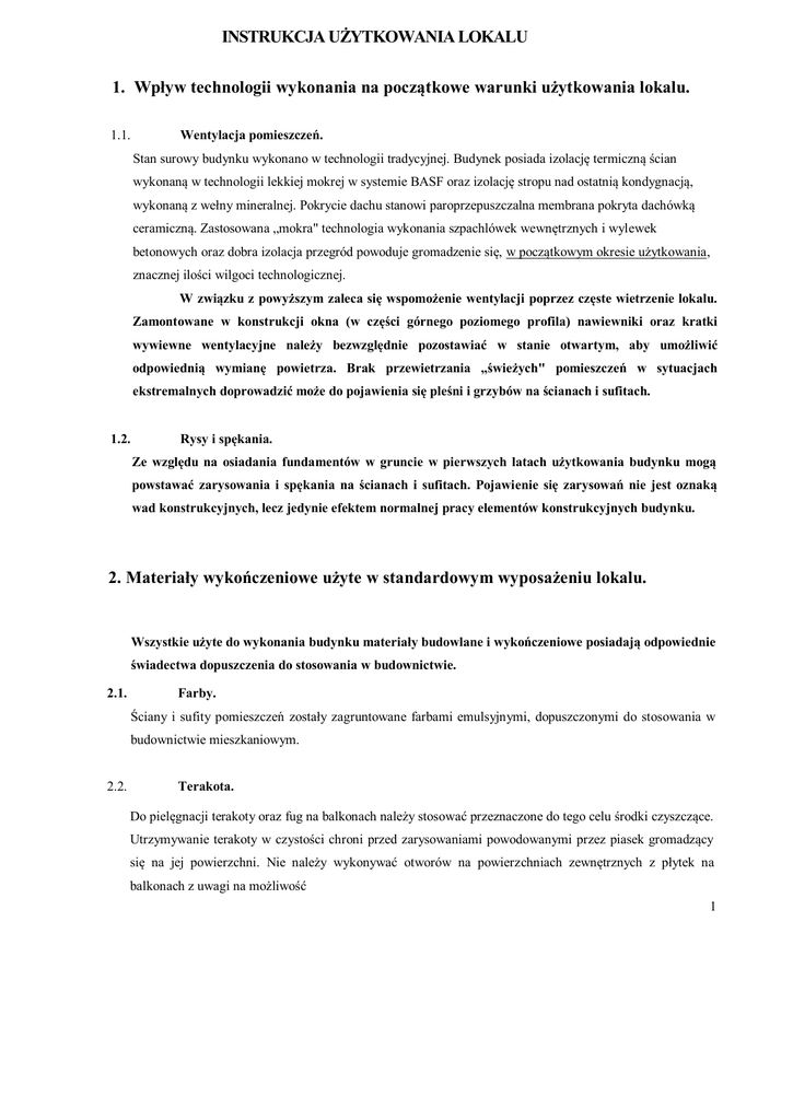 INSTRUKCJA UŻYTKOWANIA LOKALU 1. Wpływ technologii wykonania na początkowe warunki użytkowania lokalu. 1.1. Wentylacja pomieszczeń. Stan surowy budynku wykonano w technologii tradycyjnej. Budynek posiada izolację termiczną ścian wykonaną w technologii lekkiej mokrej w systemie BASF oraz izolację stropu nad ostatnią kondygnacją, wykonaną z wełny mineralnej. Pokrycie dachu stanowi paroprzepuszczalna membrana pokryta dachówką ceramiczną. Zastosowana „mokra" technologia wykonania szpachlówek wewnętrznych i wylewek betonowych oraz dobra izolacja przegród powoduje gromadzenie się, w początkowym okresie użytkowania, znacznej ilości wilgoci technologicznej. W związku z powyższym zaleca się wspomożenie wentylacji poprzez częste wietrzenie lokalu. Zamontowane w konstrukcji okna (w części górnego poziomego profila) nawiewniki oraz kratki wywiewne wentylacyjne należy bezwzględnie pozostawiać w stanie otwartym, aby umożliwić odpowiednią wymianę powietrza. Brak przewietrzania „świeżych" pomieszczeń w sytuacjach ekstremalnych doprowadzić może do pojawienia się pleśni i grzybów na ścianach i sufitach. 1.2. Rysy i spękania. Ze względu na osiadania fundamentów w gruncie w pierwszych latach użytkowania budynku mogą powstawać zarysowania i spękania na ścianach i sufitach. Pojawienie się zarysowań nie jest oznaką wad konstrukcyjnych, lecz jedynie efektem normalnej pracy elementów konstrukcyjnych budynku. 2. Materiały wykończeniowe użyte w standardowym wyposażeniu lokalu. Wszystkie użyte do wykonania budynku materiały budowlane i wykończeniowe posiadają odpowiednie świadectwa dopuszczenia do stosowania w budownictwie. 2.1. Farby. Ściany i sufity pomieszczeń zostały zagruntowane farbami emulsyjnymi, dopuszczonymi do stosowania w budownictwie mieszkaniowym. 2.2. Terakota. Do pielęgnacji terakoty oraz fug na balkonach należy stosować przeznaczone do tego celu środki czyszczące. Utrzymywanie terakoty w czystości chroni przed zarysowaniami powodowanymi przez piasek gromadzący się na jej powierzchni. Nie należy wykonywać otworów na powierzchniach zewnętrznych z płytek na balkonach z uwagi na możliwość 1 naruszenia izolacji powłokowych tych powierzchni. UWAGA: Posadzki w łazienkach posiadają izolację przeciwwodną. W pomieszczeniu mokrym jakim jest łazienka przed położeniem płytek można dodatkowo wykonać powłokową izolację przeciwwodną posadzek. W przypadku montażu brodzika powyższa izolacja powinna być wykonana na ścianach w obrębie brodzika. 2.3. Drzwi wejściowe do lokalu. Do lokali mieszkalnych zamontowano drzwi zewnętrzne typu Gerda. Docelowe kodowane klucze do drzwi przekazuje dla właścicieli bezpośrednio przedstawiciel firmy Gerda. 2.4. Stolarka okienna Wbudowana stolarka okienna wykonana jest z w systemie PCV, zaopatrzona w okucia obwiedniowe i oszklenie zespolone złożone z dwóch tafli szkła, o grubości 4mm każda, z przestrzenią międzyszybową o szerokości 16 mm. Ze względu na konieczność odpowiedniego przewietrzania pomieszczeń, szczególnie w początkowym okresie eksploatacji i zapewnienia poprawnej wentylacji, w oknach zostanie zainstalowany nawiewnik, którego zaklejanie lub innego typu ograniczanie przepływu powietrza jest bezwzględnie zabronione. Należy również bezwzględnie unikać obciążania skrzydła w pozycji rozwartej. Obsługa i użytkowanie okna: Okno jest zamknięte, gdy klamka znajduje się w pozycji pionowej, a gryf klamki skierowany jest do dołu. Rozwarcie okna następuje poprzez przekręcenie klamki o 90 stopni do pozycji poziomej, gdzie gryf skierowany jest w kierunku zawiasów. Możliwe jest uchylenie okna poprzez przekręcenie klamki: o 180 stopni (gryf skierowany do góry) w stosunku do pozycji „zamknięte". Zastosowane okucia umożliwiają również rozszczelnienie okna ( poprzez zwolnienie docisku uszczelek), powodujące powolne wentylowanie pomieszczenia. Rozszczelnienie następuje poprzez przekręcenie klamki o 135 stopni do pozycji ukośnej, gdzie gryf skierowany jest w kierunku zawiasów. Dla prawidłowego działania wentylacji grawitacyjnej zamontowano w profilach części okien nawiewniki. W przypadku stwierdzenia w pierwszym okresie eksploatacji lokalu nadmiernej wilgoci lub nieprzyjemnego zapachu materiałów wykończeniowych, należy poprzez okna zapewnić należyty dopływ świeżego powietrza np. poprzez uchylenie chociażby jednego okna, albo rozszczelnienie okien w mieszkaniu ( zamknięcie okna przy pozostawieniu klamki w pozycji ukośnej). Czyszczenie: Zabrudzenia od deszczu, kurzu itp. można usuwać miękką ścierką lub szczotką i gumową ściągaczką z zastosowaniem łagodnych środków myjących do mycia szyb. Niedopuszczalne jest stosowanie do usuwania zabrudzeń z szyb i profili środków szorujących i rozpuszczalników ( alkohole, aceton, nitro, rozpuszczalniki celulozowe itp.), które mogą spowodować zmatowienie powierzchni szkła oraz profili okiennych. Stolarkę należy chronić przed kontaktem z gorącymi przedmiotami oraz bezwzględnie unikać 2 silnych zabrudzeń. Należy pamiętać, że szczególnie wrażliwym elementem stolarki jest okucie, należy chronić przed zabrudzeniami materiałami ziarnistymi które lub powodującymi korozję elementów metalowych. Konserwacja Zaleca się, co najmniej raz do roku: - sprawdzić czy zawiasy są prawidłowo i mocno osadzone (przykręcone) oraz przesmarować (olejem maszynowym lub wazeliną techniczną) wszystkie ruchome elementy okuć ( zawiasy, żłobki pod zaczepy) , skontrolować stan uszczelek. Uszczelki w dobrym stanie technicznym przetrzeć ściereczką nasączoną gliceryną. Sprawdzić stan techniczny zewnętrznych otworów drenowych w dolnej części ramy okiennej. Usunąć wszelkie zanieczyszczenia utrudniające ruch wody. Parapety wewnętrzne wykonane są z konglomeratu w kolorze białym. Drobne zabrudzenia należy usuwać miękką ściereczką z zastosowaniem ła