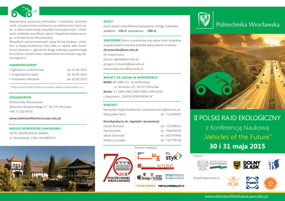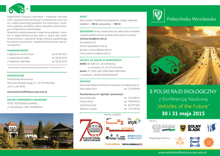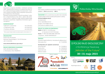 zapewniamy przyjazną atmosferę i możliwość wymiany myśli, niezapomniane przeżycia na malowniczej trasie rajdu, a także prezentację pojazdów futurystycznych i możliwość osobistej weryfikacji jakości biopaliwa wytworzonego na Politechnice Wrocławskiej. Wszystkich zainteresowanych nową formą edukacji i udziałem w Rajdo-Konferencji (lub tylko w rajdzie albo konferencji) prosimy o zgłoszenie drogą mailową wypełnionego formularza uczestnictwa i dopełnienie formalności wg harmonogramu1. HARMONOGRAM* zgłoszenie uczestnictwa Uregulowanie opłat Przesłanie referatów 1 do 25.04.2015 do 30.04.2015 do 20.05.2015 Pełny program Rajdo-Konferencji podany będzie w Komunikacie nr 2 ORGANIZATOR Politechnika Wrocławska Wybrzeże Wyspiańskiego 27, 50-370 Wrocław +48 71 320 49 65 www.vehiclesofthefuture.pwr.edu.pl mIEJSCE KONFERENCJI NAUKOWEJ hotel RestaURacJa MaRia, ul. Wrocławska 134b, WałBRzych KOSZt Koszt udziału w Konferencji (wyżywienie, nocleg, materiały): studenci – 150 zł, pracownicy – 300 zł. ZGłOSZENIE formy uczestnictwa oraz pełne treści artykułów w języku polskim prosimy przesłać jednocześnie na adresy: [email protected] do wiadomości: [email protected] [email protected] [email protected] WPłAtY ZA UDZIAł W KONFERENCJI BANK: Bz WBK s.a. 16 o/Wrocław ul. norwida 1/3, 50-373 Wrocław Konto: 37 1090 2402 0000 0006 1000 0434 z dopiskiem: „RaJdo-KonFeRencJa” KONtAKt Komandor Rajdo-Konferencji: [email protected] Mieczysław struś tel. 713204965 Koordynatorzy ds. logistyki i prezentacji: daniel Brandyk tel. 723338512 Paulina Klink tel. 794979070 Jakub dominiak tel. 663797693 Mateusz łysejko tel. 725778756 II POLSKI RAJD EKOLOGICZNY z Konferencją Naukową „Vehicles of the Future” 30 i 31 maja 2015 Patroni medialni Patroni Współorganizatorzy www.vehiclesofthefuture.pwr.edu.pl RAJDO-KONFERENCJA II POLSKI RAJD EKOLOGICZNY z KONFERENCJĄ NAUKOWĄ W odpowiedzi na rosnące zainteresowanie tematyką pojazdów przyszłości i rozwoju motoryzacji, a także podtrzymując dobre doświadczenia zeszłorocznej edycji, mamy zaszczyt zaprosić Państwa do uczestnictwa w kolejnej Rajdo-Konferencji. Wymiana myśli i doświadczeń odbędzie się natomiast drugiego dnia Rajdo-Konferencji w Hotelu Maria w Wałbrzychu. Celem konferencji jest możliwość zaprezentowania wyników swoich prac badawczych i konstrukcyjnych, wymiana doświadczeń oraz integracja środowiska studentów, doktorantów i młodych naukowców. II POLSKI RAJD EKOLOGICZNY z KONFERENCJĄ NAUKOWĄ „Vehicles of the Future” organizowany w dniach 30 i 31 maja 2015 r. przez Politechnikę Wrocławską, Wydział Mechaniczno-energetyczny przy współpracy Przemysłowego Instytutu Motoryzacji w Warszawie Pod patronatem Wicepremiera, Ministra Gospodarki Rzeczypospolitej Polskiej Janusza Piechocińskiego Wicemarszałka Województwa Dolnośląskiego dr. Tadeusza Samborskiego J.M. Rektora Politechniki Wrocławskiej prof. dr. hab. inż. Tadeusza Więckowskiego Prorektora Politechniki Wrocławskiej dr. hab. inż. Zbigniewa Sroki prof. PWr Dziekana Wydziału Mechaniczno-Energetycznego prof. dr. hab. inż. Zbigniewa Gnutka Dyrektora Instytutu Transportu Samochodowego w Warszawie dr. hab. inż. Marcina Ślęzaka Przedsięwzięcie jest syntezą klasycznej konferencji naukowej oraz pokazu alternatywnych konstrukcji pojazdów, a także efektywności jazdy rajdowej pojazdów użytkowych, zasilanych biopaliwami i innymi alternatywnymi zespołami napędowymi. „Vehicles of the Future” Komitet organizacyjny Rajdo-Konferencja organizowana jest w 70. rocznicę zakończenia II wojny światowej i roku jubileuszowym 70-lecia Politechniki Wrocławskiej. Dla upamiętnienia tamtych wydarzeń w jej trakcie odbędzie się m.in. uroczyste złożenie wieńców i zniczy pod Pomnikiem Losów Ojczyzny w Oławie, Pomnikiem Golgoty Wschodu w Oleśnicy, a także pod Pomnikiem Pomordowanych Profesorów Lwowskich we Wrocławiu. Rajdo-Konferencja rozpocznie się na terenie Politechniki Wrocławskiej bezpłatnym tankowaniem biopaliwa jednośladów i wielośladów. Prezentacja pojazdów i oficjalne otwarcie imprezy odbędzie się na Rynku we Wrocławiu. Trasa rajdu: Wrocław – Oleśnica – Oława – Strzelin – Świdnica – Wałbrzych. Komitet naukowy prof. dr hab. inż. Zbigniew Gnutek prof. dr hab. inż. Maria Jędrusik płk dr hab. inż. Mieczysław Struś dr hab. inż. Zbigniew Sroka prof. PWr dr hab. inż. Jacek Kasperski prof. PWr prof. dr hab. inż. Maciej Chorowski prof. dr hab. inż. Piotr Dudziński prof. dr hab. inż. Marek Gawliński prof. dr hab. inż. Wacław Kollek prof. dr hab. inż. Lech Sitnik doc. dr inż. Andrzej Figiel dr hab. inż. Marcin Ślęzak dr inż. Jacek Lamperski dr inż. Andrzej Muszyński dr inż. Janusz Rogula dr inż. Grzegorz Romanik dr inż. Janusz Skrzypacz dr inż. Janusz Wach płk dr hab. inż. Mieczysław Struś – Komandor Rajdo-Konferencji dr inż. Stefan Gołąbek – Honorowy Komandor dr inż. Janusz Rogula – Wicekomandor dr inż. Jacek Lamperski – Wicekomandor dr inż. Grzegorz Romanik – Wicekomandor inż. Daniel Brandyk – koordynator ds. logistyki inż. Paulina Klink – koordynator ds.konferencji Tematyka konferencji naukowej I Efektywność energetyczna pojazdów Konstrukcje silników Układy hybrydowe Rozwiązania o większej sprawności energetycznej Aerodynamika pojazdów II Napędy alternatywne Konstrukcje minimalizujące zużycie energii Ekologia w motoryzacji Eksploatacja pojazdów Napędy niekonwencjonalne III Konstrukcje przyszłości Budowa pojazdów Analiza elementów konstrukcyjnych Pojazdy bezzałogowe P rojektowanie wspomagane komputerowo Treść referatów będzie recenzowana przez członków Komitetu Naukowego. Autorzy najlepszych referatów otrzymają nagrody, a ich artykuły, po spełnieniu wymogów redakcyjnych, będą opublikowane w wydawnictwie zwartym lub w czasopismach naukowych.