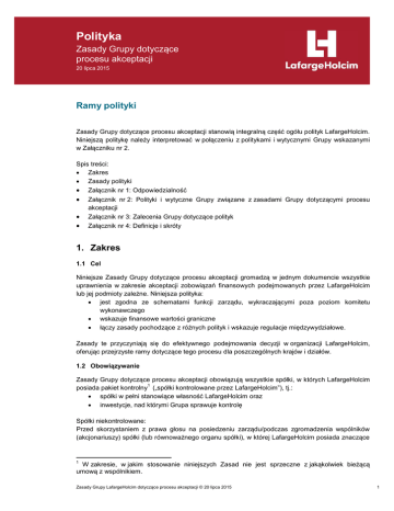 Polityka Zasady Grupy dotyczące procesu akceptacji 20 lipca 2015 Ramy polityki Zasady Grupy dotyczące procesu akceptacji stanowią integralną część ogółu polityk LafargeHolcim. Niniejszą politykę należy interpretować w połączeniu z politykami i wytycznymi Grupy wskazanymi w Załączniku nr 2. Spis treści: Zakres Zasady polityki Załącznik nr 1: Odpowiedzialność Załącznik nr 3: Zalecenia Grupy dotyczące polityk Załącznik nr 2: Polityki i wytyczne Grupy związane z zasadami Grupy dotyczącymi procesu akceptacji Załącznik nr 4: Definicje i skróty 1. Zakres 1.1 Cel Niniejsze Zasady Grupy dotyczące procesu akceptacji gromadzą w jednym dokumencie wszystkie uprawnienia w zakresie akceptacji zobowiązań finansowych podejmowanych przez LafargeHolcim lub jej podmioty zależne. Niniejsza polityka: jest zgodna ze schematami funkcji zarządu, wykraczającymi poza poziom komitetu wykonawczego wskazuje finansowe wartości graniczne łączy zasady pochodzące z różnych polityk i wskazuje regulacje międzywydziałowe. Zasady te przyczyniają się do efektywnego podejmowania decyzji w organizacji LafargeHolcim, oferując przejrzyste ramy dotyczące tego procesu dla poszczególnych krajów i działów. 1.2 Obowiązywanie Zasady Grupy dotyczące procesu akceptacji obowiązują wszystkie spółki, w których LafargeHolcim 1 posiada pakiet kontrolny („spółki kontrolowane przez LafargeHolcim”), tj.: spółki w pełni stanowiące własność LafargeHolcim oraz inwestycje, nad którymi Grupa sprawuje kontrolę Spółki niekontrolowane: Przed skorzystaniem z prawa głosu na posiedzeniu zarządu/podczas zgromadzenia wspólników (akcjonariuszy) spółki (lub równoważnego organu spółki), w której LafargeHolcim posiada znaczące 1 W zakresie, w jakim stosowanie niniejszych Zasad nie jest sprzeczne z jakąkolwiek bieżącą umową z wspólnikiem. Zasady Grupy LafargeHolcim dotyczące procesu akceptacji © 20 lipca 2015 1 Zasady Grupy dotyczące procesu akceptacji 2 wpływy, ale nad którą nie sprawuje kontroli („spółki niekontrolowane”) członkowie zarządu/udziałowcy/akcjonariusze reprezentujący Grupę LafargeHolcim muszą zastosować się do niniejszych Zasad (tj. przewidzieć i zapewnić uzyskanie niezbędnych akceptacji) w związku z wszelkimi zobowiązaniami finansowymi, gwarancjami oraz/lub dopłatami do kapitału popieranymi przez spółkę kontrolowaną przez LafargeHolcim, posiadającą udział w takiej spółce niekontrolowanej. 1.3 Schemat funkcji zarządu Termin BoD • Articles of incorporation • Organizational rules Functions Diagram • Committee charters ExCo Policy landscape Policies for functions and managerial processes Group Approval Rules Financial • Authorization thresholds, other rules Organizational • ExCo governance • Governance between Group, regions, countries (reporting lines, councils, …) Tłumaczenie Zarząd • Umowa spółki • Regulamin organizacyjny Schemat funkcji • Statuty komitetów Komitet wykonawczy Ogół polityk Polityki dotyczące działów i procesów kierowniczych Zasady Grupy dotyczące procesu akceptacji Aspekt finansowy • Wartości graniczne uprawnień, inne zasady Aspekt organizacyjny • Struktura komitetu wykonawczego • Struktura zarządzania między Grupą, regionami, krajami (podległości służbowe, rady, ...) 1.4 Zakres Zasady Grupy dotyczące procesu akceptacji obejmują swym zakresem: wydatki CAPEX – patrz polityka Grupy w zakresie wydatków CAPEX umowy handlowe – patrz pkt. 2.1 umowy kupna i najmu/dzierżawy – patrz 2.2 2 Posiadanie 20% lub więcej praw głosów (bezpośrednio lub za pośrednictwem spółek zależnych) będzie oznaczało istotny wpływ, chyba że można wyraźnie wykazać, że tak nie jest. Zasady Grupy LafargeHolcim dotyczące procesu akceptacji © 20 lipca 2015 2 Zasady Grupy dotyczące procesu akceptacji finanse i gospodarkę pieniężną – patrz 2.3 Dodatkowe dziedziny (jak ład korporacyjny, zasoby ludzkie i inne umowy szczególne, dotyczące m.in. lobbowania, sponsoringu, datków, pośrednictwa, rozwoju biznesowego oraz ugody) są uwzględniane w miarę konieczności. 2. Zasady polityki Wszystkie wartości graniczne i kwoty w poniższych tabelach są wyrażone w milionach CHF. 2.1 Umowy handlowe Wartość graniczna zobowiązania (lub inne kryteria) (1) Dyrektor generalny na kraj Dyrektor działu (2) Dyrektor regionu(3) Członek komitetu wykonawczego ds. wzrostu i Innowacji Dyrektor generalny Grupy Umowy sprzedaży i o świadczenie usług (a) < 25 mln (niezależnie od okresu obowiązywania umowy) Akceptuje < 25 - < 50 mln (niezależnie od okresu obowiązywania umowy) Opiniuje > 50 mln (niezależnie od okresu obowiązywania umowy) Opiniuje Umowy ramowe obejmujące kilka krajów (z kluczowymi klientami) Akceptuje (4) Zostaje poinformowany Opiniuje Opiniuje Akceptuje (b) < 50 mln Opiniuje Zostaje poinformowany Akceptuje > 50 mln Opiniuje Opiniuje Opiniuje Akceptuje Globalne/obejmujące kilka krajów umowy sprzedaży i o świadczenie usług dotyczące ropy i gazu Brak wartości granicznej Opiniuje Opiniuje Akceptuje Lokalne umowy sprzedaży i o świadczenie usług dotyczące ropy i gazu z kluczowymi klientami globalnymi/obejmującymi kilka krajów Brak wartości granicznej Akceptuje Opiniuje Lokalne umowy sprzedaży i o świadczenie usług dotyczące ropy i gazu z klientami lokalnymi (klienci niekluczowi) Brak wartości granicznej Akceptuje Zostaje poinformowany Umowy franczyzowe i licencyjne obejmujące prawa własności intelektualnej Lafarge-Holcim (patenty, marki, znaki towarowe, know-how) Brak wartości granicznej Opiniuje Opiniuje Komunikacja Akceptuje, jeżeli ma związek z daną branżą Akceptuje (a) Umowy dotyczące produktu Ductal wymagają akceptacji dyrektora działu ds. Ductal (b) Porozumienia o współpracy z grupami międzynarodowymi (pozostające bez bezpośredniego wpływu na sprzedaż lub ceny) podlegają akceptacji członka komitetu wykonawczego ds