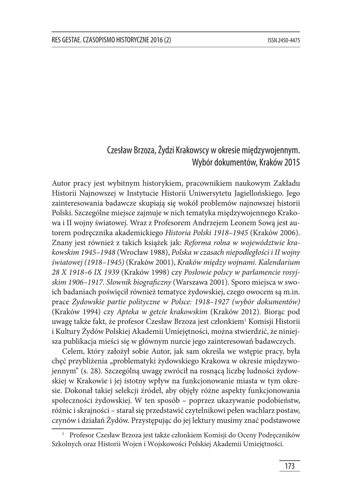 RES GESTAE. CZASOPISMO HISTORYCZNE 2016 (2) ISSN 2450-4475 Czesław Brzoza, Żydzi Krakowscy w okresie międzywojennym. Wybór dokumentów, Kraków 2015 Autor pracy jest wybitnym historykiem, pracownikiem naukowym Zakładu Historii Najnowszej w Instytucie Historii Uniwersytetu Jagiellońskiego. Jego zainteresowania badawcze skupiają się wokół problemów najnowszej historii Polski. Szczególne miejsce zajmuje w nich tematyka międzywojennego Krakowa i II wojny światowej. Wraz z Profesorem Andrzejem Leonem Sową jest autorem podręcznika akademickiego Historia Polski 1918–1945 (Kraków 2006). Znany jest również z takich książek jak: Reforma rolna w województwie krakowskim 1945–1948 (Wrocław 1988), Polska w czasach niepodległości i II wojny światowej (1918–1945) (Kraków 2001), Kraków między wojnami. Kalendarium 28 X 1918–6 IX 1939 (Kraków 1998) czy Posłowie polscy w parlamencie rosyjskim 1906–1917. Słownik biograficzny (Warszawa 2001). Sporo miejsca w swoich badaniach poświęcił również tematyce żydowskiej, czego owocem są m.in. prace Żydowskie partie polityczne w Polsce: 1918–1927 (wybór dokumentów) (Kraków 1994) czy Apteka w getcie krakowskim (Kraków 2012). Biorąc pod uwagę także fakt, że profesor Czesław Brzoza jest członkiem1 Komisji Historii i Kultury Żydów Polskiej Akademii Umiejętności, można stwierdzić, że niniejsza publikacja mieści się w głównym nurcie jego zainteresowań badawczych. Celem, który założył sobie Autor, jak sam określa we wstępie pracy, była chęć przybliżenia „problematyki żydowskiego Krakowa w okresie międzywojennym” (s. 28). Szczególną uwagę zwrócił na rosnącą liczbę ludności żydowskiej w Krakowie i jej istotny wpływ na funkcjonowanie miasta w tym okresie. Dokonał takiej selekcji źródeł, aby objęły różne aspekty funkcjonowania społeczności żydowskiej. W ten sposób – poprzez ukazywanie podobieństw, różnic i skrajności – starał się przedstawić czytelnikowi pełen wachlarz postaw, czynów i działań Żydów. Przystępując do jej lektury musimy znać podstawowe Profesor Czesław Brzoza jest także członkiem Komisji do Oceny Podręczników Szkolnych oraz Historii Wojen i Wojskowości Polskiej Akademii Umiejętności. 1 173 RECENZJE RES GESTAE 2016 (2) pojęcia, orientować się we wcześniejszej historii i zdawać sobie sprawę z wagi poszczególnych spraw czy występujących na stronach książki nazwisk. Dla amatora, który sięga po tę lekturę, szczegółowa analiza tematu i niektórych dokumentów może być nieco skomplikowana. Przy korzystaniu z tego rodzaju publikacji, jakim jest zbiór dokumentów, niezbędna jest bowiem ogólna wiedza pozaźródłowa dotycząca tematu. Jak sama nazwa wskazuje, publikacja stanowi zbiór dokumentów. Jej tytuł nastawia odbiorcę na historię tego narodu w międzywojennym Krakowie, lecz nie podkreśla ważności któregoś zagadnienia. Można przypuszczać, że praca ma na celu przybliżenie ogólnej wiedzy na temat wydarzeń lokalnych, krajowych i międzynarodowych. Tytuł określa również ramy geograficzne. Można je rozpatrywać w różnych aspektach. Pytanie, czy jest to wybór dokumentów o Żydach z zastrzeżeniem, że dokumenty te niekoniecznie w Krakowie musiały powstać, czy zbiór zamknięty i odnoszący się tylko i wyłącznie do Krakowa, zarówno tematem jak i miejscem powstania źródła? Możemy iść dalej i zadać kolejne pytanie – czy zebrane dokumenty prezentują charakterystykę tylko Żydów na poziomie lokalnym lub międzynarodowym czy owi Żydzi z Krakowa są także autorami tekstów o wydarzeniach politycznych, gospodarczych czy kulturalnych? Wydaje się, że bardzo ogólnie sformułowany tytuł może być mylący lub mało czytelny dla osób poszukujących konkretnych informacji. Cezury chronologiczne Autor uściśla używając sformułowania „okres międzywojenny”, a więc wiemy, że omawiany temat mieścił się będzie w przedziale czasowym 1918–1939. Autor odchodzi od tej zasady tylko na początku pracy. Trzy pierwsze dokumenty: Statut Gminy Izraelickiej w Krakowie, Statut Izraelickiej Gminy Wyznaniowej w Podgórzu oraz Regulamin i ordynacja wyborcza dla bożnic własnością Gminy Izraelickiej w Krakowie będących, odnoszą się do przełomu XIX i XX. Zabieg ten tłumaczy koniecznością zaznajomienia czytelnika z zawartymi w nich przepisami, ponieważ z drobnymi modyfikacjami obowiązywały również w analizowanym w pracy okresie. Zbiór zamieszczony w książce ilustruje wydarzenia na poziomie lokalnym, ogólnopolskim i międzynarodowym. Do tych ostatnich możemy zaliczyć teksty mówiące o problemie palestyńskim. Uderzająca jest liczba dokumentów poświęcona syjonizmowi. W dwudziestoleciu międzywojennym nurt ten przeżywał swój rozkwit, a wielu głównych działaczy syjonistycznych pochodziło właśnie z Krakowa, m.in. rabin Abraham Ojzasz Thon. Nic dziwnego, że autor zwrócił na to szczególną uwagę. Inne teksty ukazują ważne wydarzenia w życiu lokalnej społeczności. Możemy do nich zaliczyć reportaże o obchodach świąt religijnych, o obrazie życia Żydów, i panujących na Kazimierzu warunkach sanitarnych, ceremoniach pogrzebowych wybitnych działaczy żydowskich. Ważne miejsce w zbiorze zajmują teksty odnoszące się do funkcjonowania 174 RES GESTAE 2016 (2) RECENZJE różnych instytucji i organizacji. Wśród nich znalazły się takie stowarzyszenia, jak ŻKS „Makkabi”, organizacje akademickie czy komitety dobroczynności. Dominują jednak teksty o charakterze politycznym. W szczególności mamy do czynienia z dokumentami odnoszącymi się do akcji przedwyborczych na różnych szczeblach życia politycznego – do parlamentu, rady miejskiej, kahału czy na kongresy syjonistyczne, a wśród nich przemówienia żydowskich osobistości, poradniki wyborcze, obszerne listy kandydatów, opisy toczonych polemik i przebiegu wyborów. Osobne miejsce