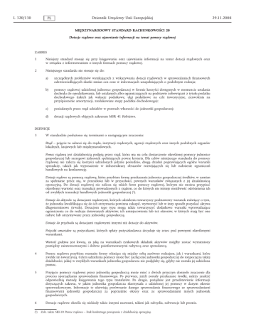L 320/130 PL Dziennik Urzędowy Unii Europejskiej MIĘDZYNARODOWY STANDARD RACHUNKOWOŚCI 20 Dotacje rządowe oraz ujawnianie informacji na temat pomocy rządowej ZAKRES 1 Niniejszy standard stosuje się przy księgowaniu oraz ujawnianiu informacji na temat dotacji rządowych oraz w związku z informowaniem o innych formach pomocy rządowej. 2 Niniejszego standardu nie stosuje się do: a) szczególnych problemów wynikających z wykazywania dotacji rządowych w sprawozdaniach finansowych odzwierciedlających skutki zmian cen oraz w informacjach uzupełniających o podobnym rodzaju; b) pomocy rządowej udzielonej jednostce gospodarczej w formie korzyści dostępnych w momencie ustalania dochodu do opodatkowania, lub ustalanych albo ograniczających na podstawie zobowiązań z tytułu podatku dochodowego (takich jak wakacje podatkowe, ulgi podatkowe na cele inwestycyjne, zezwolenia na przyśpieszenie amortyzacji, zredukowane stopy podatku dochodowego); c) posiadanych przez rząd udziałów w prawach własności do jednostki gospodarczej; d) dotacji rządowych objętych zakresem MSR 41 Rolnictwo. DEFINICJE 3 W standardzie posłużono się terminami o następującym znaczeniu: Rząd – pojęcie to odnosi się do rządu, instytucji rządowych, agencji rządowych oraz innych podobnych organów lokalnych, krajowych lub międzynarodowych. Pomoc rządowa jest działalnością podjętą przez rząd, która ma na celu dostarczenie określonej pomocy jednostce gospodarczej lub szeregowi jednostek spełniających pewne kryteria. Dla celów niniejszego standardu do pomocy rządowej nie zalicza się korzyści udzielonych jedynie pośrednio, drogą działań poprawiających ogólne warunki sprzedaży, takich jak wyposażenie w infrastrukturę obszarów rozwijających się lub nałożenie ograniczeń handlowych na konkurencję. Dotacje rządowe są pomocą rządową, która przybiera formę przekazania jednostce gospodarczej środków, w zamian za spełnianie przez nią, w przeszłości lub w przyszłości, pewnych warunków związanych z jej działalnością operacyjną. Do dotacji rządowej nie zalicza się takich form pomocy rządowej, którym nie można przypisać określonej wartości oraz transakcji prowadzonych z rządem, co do których nie istnieje możliwość odróżnienia ich od zwykłych transakcji handlowych jednostki gospodarczej (1). Dotacje do aktywów są dotacjami rządowymi, których udzieleniu towarzyszy podstawowy warunek mówiący o tym, że jednostka kwalifikująca się do ich otrzymania powinna zakupić, wytworzyć lub w inny sposób pozyskać aktywa długoterminowe (trwałe). Dotacjom tego typu mogą także towarzyszyć dodatkowe warunki wprowadzające ograniczenia co do rodzaju dotowanych aktywów, ich umiejscowienia lub też okresów, w których mają być one nabyte lub utrzymywane przez jednostkę gospodarczą. Dotacje do przychodu są dotacjami rządowymi innymi niż dotacje do aktywów. Pożyczki umarzalne są pożyczkami, których spłaty pożyczkodawca decyduje się zrzec pod pewnymi określonymi warunkami. Wartość godziwa jest kwotą, za jaką na warunkach rynkowych składnik aktywów mógłby zostać wymieniony pomiędzy zainteresowanymi i dobrze poinformowanymi nabywcą oraz sprzedawcą. 4 Pomoc rządowa przybiera rozmaite formy różniące się między sobą zarówno rodzajem, jak i warunkami, które zwykle im towarzyszą. Celem udzielenia pomocy może być zachęcenie jednostki gospodarczej do rozpoczęcia takiej działalności, jakiej w zwykłych warunkach jednostka gospodarcza nie podjęłaby się, gdyby nie została jej udzielona pomoc. 5 Przyjęcie pomocy rządowej przez jednostkę gospodarczą może mieć z dwóch przyczyn doniosłe znaczenie dla procesu sporządzania sprawozdania finansowego. Po pierwsze, jeżeli zostały przekazane środki, należy znaleźć odpowiednią metodę księgowania tego typu transferów. Po drugie, pożądane jest przedstawienie informacji dotyczących zakresu, w jakim jednostka gospodarcza skorzystała z udzielonej jej pomocy w danym okresie sprawozdawczym. Informacje te ułatwiają porównanie danego sprawozdania finansowego ze sprawozdaniami finansowymi jednostki gospodarczej za poprzednie okresy oraz ze sprawozdaniami innych jednostek gospodarczych. 6 Dotacje rządowe określa się niekiedy także innymi nazwami, takimi jak subsydia, subwencje lub premie. (1) Zob. także SKI-10 Pomoc rządowa – brak konkretnego powiązania z działalnością operacyjną. 29.11.2008 29.11.2008 Dziennik Urzędowy Unii Europejskiej PL DOTACJE RZĄDOWE 7 Dotacji rządowych, łącznie z niepieniężnymi dotacjami wykazywanymi w wartości godziwej, nie ujmuje się, dopóki nie istnieje wystarczająca pewność, iż: a) jednostka gospodarcza spełni warunki związane z dotacjami; oraz b) dotacje będą otrzymane. 8 Dotacji rządowej nie ujmuje się aż do momentu, w którym istnieje uzasadnione przekonanie, że jednostka gospodarcza spełni warunki związane z dotacją oraz że dotacja zostanie otrzymana. Fakt, iż jednostka gospodarcza otrzymała dotacje, nie stanowi sam w sobie przekonującego dowodu na to, że związane z dotacją warunki zostały lub będą spełnione. 9 Sposób, w jaki dotacja została otrzymana, nie wpływa na metodę księgową, którą należy przyjąć w stosunku do dotacji. Dlatego też dotacja jest księgowana w ten sam sposób niezależnie od tego, czy została ona otrzymana w formie środków pieniężnych, czy też przybrała formę redukcji zobowiązań wobec rządu. 10 Rządową pożyczkę umarzalną traktuje się jako dotację rządową, o ile istnieje wystarczająca pewność, że jednostka gospodarcza sprosta wymaganiom związanym z umorzeniem pożyczki. 11 Od momentu ujęcia dotacji rządowej w sprawozdaniu do wszystkich powiązanych z nią zobowiązań lub aktywów warunkowych stosuje się MSR 37 Rezerwy, zobowiązania warunkowe i aktywa warunkowe. 12 Dotacje rządowe ujmuje się w systematyczny sposób jako pr