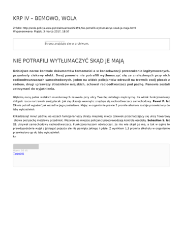 KRP IV – BEMOWO, WOLA Źródło: http://wola.policja.waw.pl/r4/aktualnosci/2359,Nie-potrafili-wytlumaczyc-skad-je-maja.html Wygenerowano: Piątek, 3 marca 2017, 18:57 Strona znajduje się w archiwum. NIE POTRAFILI WYTŁUMACZYĆ SKĄD JE MAJĄ Dzisiejsze nocne kontrole dokumentów tożsamości a w konsekwencji przeszukanie legitymowanych, przyniosły ciekawy efekt. Dwaj panowie nie potrafili wytłumaczyć się ze znalezionych przy nich radioodtwarzaczach samochodowych. Jeden na widok policjantów odrzucił na trawnik swój plecak z radiem, drugi ujrzawszy strażników miejskich, schował radioodtwarzacz pod pachę. Panowie zostali zatrzymani do wyjaśnienia. Głęboką nocą patrol wolskich mundurowych zauważa przy ulicy Twardej młodego mężczyznę. Na widok funkcjonariuszy chłopak rzuca na trawnik swój plecak. Jak się okazuje wewnątrz znajduje się radioodtwarzacz samochodowy. Paweł P. lat 24 nie potrafi wyjaśnić jak wszedł w jego posiadanie. Mając w organizmie prawie 2 promile alkoholu zostaje przewieziony do izby wytrzeźwień. Kilkadziesiąt minut później na oczach funkcjonariuszy straży miejskiej młody człowiek przechadzający się ulicą Towarową chowa pod pachę metalowy przedmiot. Wezwani na miejsce policjanci przeprowadzają kontrolę osobistą. Sebastian S. lat 21 ukrywał samochodowy radioodtwarzacz. Funkcjonariuszom oświadczył, że nie wie skąd go ma, a tak w ogóle to prawdopodobnie wyjął z jakiegoś pojazdu ale nie pamięta jakiego i gdzie. Z wynikiem 1,3 promila alkoholu w organizmie przewieziono go do izby wytrzeźwień. kn Ocena: 0/5 (0) Tweetnij