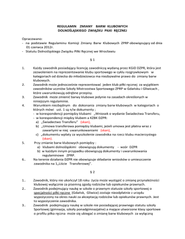 REGULAMIN ZMIANY BARW KLUBOWYCH DOLNOŚLĄSKIEGO ZWIĄZKU PIŁKI RĘCZNEJ Opracowano: - na podstawie Regulaminu Komisji Zmiany Barw Klubowych ZPRP obowiązujący od dnia 01 czerwca 2012r. - Statutu Dolnośląskiego Związku Piłki Ręcznej we Wrocławiu §1 1. 2. 3. 4. 5. 6.. Każdy zawodnik posiadający licencję zawodniczą wydaną przez KGiD DZPR, która jest zezwoleniem na reprezentowanie klubu sportowego w cyklu rozgrywkowym w kategoriach od dziecka do młodzieżowca ma niezbywalne prawo do zmiany barw klubowych. Zawodnik może jednocześnie reprezentować jeden klub piłki ręcznej za wyjątkiem zawodników uczniów Szkoły Mistrzostwa Sportowego ZPRP w Gdańsku i Gliwicach , które uwarunkowują odrębne przepisy. Zawodnik może zmienić barwy klubowe jedynie na zasadach określonych w niniejszym regulaminie. Warunkiem niezbędnym do dokonania zmiany barw klubowych w kategoriach o których mówi ust. 1 są n/w dokumenty ; - w korespondencji pomiędzy klubami „Wniosek o wydanie Świadectwa Transferu, - w korespondencji między klubem a KZBK DZPR: a) „Świadectwo Transferu” (skan), b) „Umowa transferowa pomiędzy klubami, jeżeli umowa jest płatna wraz z zawartymi w niej uwarunkowaniami (skan), c) „dokumentu wpłaty za wyszkolenie zawodnika na rzecz klubu macierzystego (skan). Przy zmianie barw klubowych pomiędzy : a) klubami dolnośląskimi obowiązują dokumenty - wzór DZPR b) w każdym innym przypadku obowiązują dokumenty i uwarunkowania regulaminowe ZPRP. Na terenie działania DZPR nie obowiązuje składanie wniosków o umieszczenie zawodnika na 1„Liście Transferowej”. §2 1.. 2.. 3.. Zawodnik, który nie ukończył 18 roku życia może wystąpić o zmianę przynależności klubowej wyłącznie za pisemną zgodą rodziców lub opiekunów prawnych. Zawodnik podejmujący naukę w szkole o prawnym statusie szkoły sportowej o specjalności piłki ręczne (Gdańsk, Gliwice) zostaje nieodpłatnie z urzędu wypożyczony na okres nauki za akceptacją rodziców lub opiekunów prawnych. Jest to wypożyczenie zawodnika. Zawodnik podejmujący naukę w szkole nie posiadającej prawnego statutu szkoły Sportowej (gimnazja, szkoły ponadgimnazjalne) a mające utworzone klasy sportowe o profilu piłka ręczna może się ubiegać o zmianę barw klubowych za wyłączną 2 4.. 5.. 6.. 7.. 8.. 9. 10. akceptacją na piśmie rodziców lub opiekunów prawnych wraz z powiadomieniem klubu macierzystego. Jest to wypożyczenie zawodnika. Zawodnik kontynuujący naukę o którym mówi ust. 3 został przyjęty do szkoły o którym mówi ust. 2 staje się automatycznie zawodnikiem klubu macierzystego. Po zakończeniu nauki o którym mówią ust. 2 i 3 zawodnik pozostaje automatycznie członkiem klubu macierzystego. Jeżeli w trakcie wypożyczenia zawodnika klub macierzysty przestał istnieć, to zawodnik ten automatycznie staje się członkiem klubu do którego został skierowany. Jeżeli w trakcie wypożyczenia zawodnika klub zmienił nazwę lub doszło do fuzji dwóch klubów zawodnik pozostaje członkiem tego klubu, nawet, jeżeli nie podpisze licencji zawodniczej i listy zgłoszenia do rozgrywek danego cyklu, jest zawodnikiem nowego klubu i przez okres 1 roku zachowuje status zawodniczy, który posiadał w momencie połączenia. - takie same zasady obowiązują w przypadku przekazania drużyny do innego klubu, - połączenie bądź przekazanie sekcji albo drużyny może nastąpić wyłącznie na terenie jednego województwa. Ekwiwalent za wyszkolenie przysługuje klubom za juniora młodszego po ukończeniu 16 roku życia, juniora oraz zawodnika nie posiadającego kontraktu do końca sezonu w którym kończy 20 lat. Klubowi macierzystemu, który ma podpisany kontrakt z zawodnikiem do 16 roku życia należy się ekwiwalent za wyszkolenie. Ekwiwalent za wyszkolenie klubowi macierzystemu nie przysługuje za zawodnika nie posiadającego kontraktu w wieku poniżej 16 lat. (Regulamin KZBK ZPRP § 11 ust. 11. 2b). §3 1. 2. 3.. 4.. Nadzór nad procedurą transferów na terenie województwa dolnośląskiego sprawuje Komisja Zmiany Barw Klubowych Dolnośląskiego Związku Piłki Ręcznej. Od decyzji KZBK DZPR służy stronom w I instancji prawo wniesienia odwołania do Zarządu Dolnośląskiego Związku Piłki Ręcznej. Odwołanie wnosi się w terminie 7 dni od daty ogłoszenia lub dostarczenia decyzji (poczta, Internet, fax). Od decyzji Zarządu DZPR służy stronom w II instancji prawo wniesienia odwołania do KZBK ZPRP. Odwołanie należy wnieść w terminie 7 dni od daty doręczenia decyzji Zarządu DZPR (poczta, internet, fax). W sprawach spornych po wniesieniu odwołania w II instancji, decyzję podejmuje Zarząd ZPRP. Decyzje Zarządu są ostateczne. Odwołanie wnosi się w terminie 7 dni od daty doręczenia decyzji KZBK ZPRP. §4 1. Dokumentem potwierdzającym zmianę barw klubowych jest „Świadectwo Transferu”. 3 2. 3. 4. 5. 6.. 7. 8. 9. 10. 11. Pozostałymi dokumentami są: a/ Wniosek o wydanie świadectwa transferu b/ karta zawodnika z klubu macierzystego c/ zgody na piśmie rodziców lub prawnych opiekunów zawodnika na zmianę barw klubowych (niezależnie od podpisania oświadczenia na druku Świadectwa Transferu). d/ oraz kserokopia umowy transferowej z podjętymi uwarunkowaniami pomiędzy klubami winna wpłynąć do KZBK DZPR. e/ kserokopia wpłaty za wyszkolenie na rzecz klubu macierzystego. Wymienione dokumenty w ust. 2 a – e wymagane są w sprawach spornych. Po podjętej decyzji przez KZBK DZPR, oba kluby otrzymują kserokopię świadectwa transferu zawodnika. Dokumentami oficjalnymi o których mówi ust. 1 i .2. a, b są wyłącznie oficjalne dokumenty DZPR, które należy stosować dla zawodników kontraktowych jak i niekontraktowych. Dokumenty ZPRP nie będą honorowane. Klub pragnący przejąć zawodnika występuje do klubu macierzystego zawodnika o Wydanie Świadectwa Transferu. Klub zwalniający zawodnika wystawia Świadectwo Transferu podpisane przez uprawnioną o