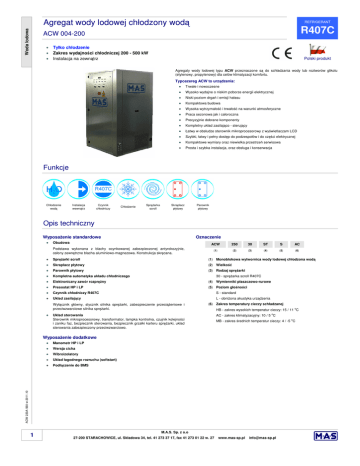 Woda lodowa Agregat wody lodowej chłodzony wodą REFRIGERANT R407C ACW 004-200 ● ● ● Tylko chłodzenie Zakres wydajności chłodniczej 200 - 500 kW Instalacja na zewnątrz Polski produkt Agregaty wody lodowej typu ACW przeznaczone są do schładzania wody lub roztworów glikolu (etylenowy, propylenowy) dla celów klimatyzacji komfortu. Typoszereg ACW to urządzenia: ● Trwałe i nowoczesne ● Wysoko wydajne o niskim poborze energii elektrycznej ● Niski poziom drgań i emisji hałasu ● Kompaktowa budowa ● Wysoka wytrzymałość i trwałość na warunki atmosferyczne ● Praca sezonowa jak i całoroczna ● Precyzyjnie dobrane komponenty ● Kompletny układ zasilająco - sterujący ● Łatwy w obsłudze sterownik mikroprocesorowy z wyświetlaczam LCD ● Szybki, łatwy i pełny dostęp do podzespołów i do części elektrycznej ● Kompaktowe wymiary oraz niewielka przestrzeń serwisowa ● Prosta i szybka instalacja, oraz obsługa i konserwacja Funkcje Chłodzenie wodą Instalacja wewnątrz Czynnik chłodniczy Chłodzenie Sprężarka scroll Skraplacz płytowy Parownik płytowy Opis techniczny Wyposażenie standardowe ● Oznaczenie Obudowa Podstawa wykonana z blachy ocynkowanej zabezpieczonej antyrokozyjnie, osłony zewnętrzne blacha aluminiowo-magnezowa. Konstrukcja skręcana. ACW 250 30 ST S AC (1) (2) (3) (4) (5) (6) ● Sprężarki scroll (1) Monoblokowa wytwornica wody lodowej chłodzona wodą ● Skraplacz płytowy (2) Wielkość ● Parownik płytowy (3) Rodzaj sprężarki ● Kompletna automatyka układu chłodniczego ● Elektroniczny zawór rozprężny (4) Wymienniki płaszczowo-rurowe ● Presostat HP i LP (5) Poziom głośności ● Czynnik chłodniczy R407C ● Układ zasilający ● 30 - sprężarka scroll R407C S - standard L - obniżona akustyka urządzenia Wyłącznik główny, stycznik silnika sprężarki, zabezpieczenie przeciążeniowe i przeciwzwarciowe silnika sprężarki. (6) Zakres temperatury cieczy schładzanej Układ sterowania Sterownik mikroprocesorowy, transformator, lampka kontrolna, czujnik kolejności i zaniku faz, bezpiecznik sterowania, bezpiecznik grzałki karteru sprężarki, układ sterowania zabezpieczony przeciwzwarciowo. AC - zakres klimatyzacyjny: 10 / 5 C HB - zakres wysokich temperatur cieczy: 15 / 11 oC o MB - zakres średnich temperatur cieczy: 4 / -5 oC Wyposażenie dodatkowe Manometr HP i LP ● Wersja cicha ● Wibroizolatory ● Układ łagodnego rozruchu (softstart) ● Podłączenie do BMS ACW 220A-560 w-2011.10 ● 1 M.A.S. Sp. z o.o 27-200 STARACHOWICE, ul. Składowa 34, tel. 41 273 37 17, fax 41 273 01 22 w. 27 www.mas-sp.pl [email protected] 220A Wydajność chłodnicza (1) Nominalny pobór mocy (1) Ciepło skraplania (1) Klasa energetyczna 260 260A 290 320 360 430 540 kW 216 236 262 268 287 322 357 431 535 kW 52,2 57,4 63,2 64,2 69,0 77,1 85,0 102,9 126,9 kW 266 292 324 330 355 398 440 533 660 D D D D D D D D D 4,13 4,12 4,14 4,17 4,16 4,18 4,20 4,19 4,22 (1) EER (1) ESEER (1) Ciśnienie akustyczne - S / L (2) 240 5,63 5,50 5,46 5,49 5,51 5,51 5,52 5,79 5,77 dB(A) 71 / 68 70 / 67 71 / 68 71 / 68 71 / 68 71 / 68 72 / 69 72 / 69 75 / 73 Woda lodowa ACW Dane fizyczne Dane elektryczne Zasilanie ph/V/Hz 3/400/50 3/400/50 3/400/50 3/400/50 3/400/50 3/400/50 3/400/50 3/400/50 3/400/50 Maksymalny pobór mocy (3) kW 94 102 114 113 125 138 150 187 225 Maksymalny pobór prądu (3) A 160 173 194 192 213 234 256 319 383 Maksymalny prąd rozruchu (3) A 376 344 362 443 426 443 443 530 622 SCROLL SCROLL SCROLL SCROLL SCROLL SCROLL SCROLL SCROLL SCROLL 3/1 4/2 4/2 3/1 4/2 4/2 4/2 6/2 6/2 Sprężarka Rodzaj sprężarki Ilość sztuk / ilość obiegów Podłączenie Skraplacz inch 4" 4" 4" 4" 5" 5" 5" 5" 6" Parownik inch 4" 4" 4" 4" 4" 5" 5" 5" 6" (1) Warunki EUROVENT: temperatura wody na skraplaczu 30/35°C, temperatura wody na parowniku 12/7°C. (2) Pomiar wg. normy ISO 3744, odległość 1m od zewnętrznej powierzchni urządzenia pracującego z pełnym obciążeniem przy warunkach EUROVENT w wolnej przestrzeni. (3) Pełne obciążenie dla maksymalnych dopuszczalnych warunków pracy. Wielkość 220A 240 260 260A 290 320 360 430 540 mm 3100 3100 3100 3100 3100 3100 3100 3500 3500 Szerokość (B) mm 1500 1500 1500 1500 1500 1500 1500 1700 1700 Wysokość (C) mm 1700 1700 1700 1700 1700 1700 1700 1750 1750 Przestrzeń serwisowa (A1) mm 1000 1000 1000 1000 1000 1000 1000 1000 1000 Przestrzeń serwisowa (B1) mm 1000 1000 1000 1000 1000 1000 1000 1000 1000 kg 1140 1190 1385 1275 1435 1515 1695 2115 2360 Ciężar netto ACW 220A-560 w-2011.10 Długość (A) M•A•S zastrzega sobie prawo do zmiany parametrów technicznych urządzeń bez wcześniejszego powiadomienia, wynikające z ich modernizacji i ulepszeń technicznych. M.A.S. Sp. z o.o 27-200 STARACHOWICE, ul. Składowa 34, tel. 41 273 37 17, fax 41 273 01 22 w. 27 www.mas-sp.pl [email protected] 2