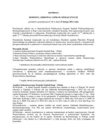 KOMISJA RODZINY, ZDROWIA I SPRAW SPOŁECZNYCH protokół z posiedzenia 4 / 11 w dniu 21 lutego 2011 roku Posiedzenie odbyło się w Samodzielnym Publicznym Zespole Szpitali PulmonologicznoReumatologicznych w Kup. Lista obecności członków Komisji, lista zaproszonych gości oraz wnioski z posiedzenia w załączeniu. Posiedzenie rozpoczęło się o godz 14 00 zakończyło o godz 17 30. Obrady prowadził Przewodniczący Komisji Marek Szymkowicz. Posiedzenie Komisji rozpoczęło się od zwiedzania, Dyrektor szpitala Mirosław Wójciak oprowadzając po jednostce zapoznał radnych ze stanem prac inwestycyjnych i remontowych przeprowadzonych w jednostce w minionych latach oraz tych, które są aktualnie realizowane. Porządek obrad: 1.Analiza funkcjonowania Zespołu Szpitali Kup – Pokój. 2.Starania Gminy Pokój o uzyskanie statusu uzdrowiska. 3.Stan realizacji inwestycji w ochronie zdrowia na terenie województwa opolskiego. 4.Apel Sejmiku Województwa Opolskiego w sprawie zmiany planu finansowego Narodowego Funduszu Zdrowia na 2011 rok – opinia Komisji. * dodatkowo do porządku obrad Komisji wprowadzono punkt: 5.Zaopiniowanie projektu uchwały w sprawie określenia zadań z zakresu rehabilitacji zawodowej i społecznej osób niepełnosprawnych i wysokości środków PFRON przeznaczonych na te zadania, przypadających według algorytmu w 2011 roku dla Województwa Opolskiego. * rządek obrad został przyjęty jednogłośnie. Analiza funkcjonowania Zespołu Szpitali Kup – Pokój. M.Wójciak – w skład Zespołu Szpitali wchodzą dwa szpitale w Kup i w Pokoju. W chwili obecnej w Szpitalu w Pokoju nie ma Oddziału Reumatologicznego i NFZ nie wie jak rozliczyć kontrakt. Szpital zatrudnia 215 lekarzy, 5 lekarzy na kontraktach, 100 pielęgniarek, szpital dysponuje 275 łóŜkami ( wcześniej 300 ). Szpital przyjmuje w ciągu roku 11 tyś – Kup i 3 tyś. Pokój, w sumie w roku 14 tyś pacjentów. Z rehabilitacji dziennej w Pokoju korzysta 360 osób. Kontrakt z NFZ w ciągu ostatnich lat wynosił: w 2006 roku 14,4 mln zł, w 2008 18 mln zł, w 2009 19,6 mln zł w 2010 20,1 mln zł i w 2011 roku 21 mln zł ( 16,6 mln Kup, 4,4 mln Pokój). M.Szymkowicz – ostatnio głośno zrobiło się wokół sprawy Oddziału Rehabilitacyjno_ Reumatologicznego. Czy Pan ma zamiar likwidować reumatologię, wyprowadzić poza szpital, jakie są plany. M.Wójciak – umowy kontraktowe w zakresie reumatologii są bardzo rygorystyczne. Zarząd Województwa zwrócił się do Prezesa Paszkiewicza o poluzowanie kryteriów, ale przypuszczam, Ŝe nie będzie na to zgody. Kontrakt na Reumatologie w Pokoju został odrzucony i nie chodzi tu o laboratorium i o izbę przyjęć, które nie były wymagane do kontraktu. M. Bunio – problemem jest pracownia RTG, urządzenie RTG z Dopplerem, do badań, których w Pokoju nie wykonujemy. Nie jest naszą wolą zlikwidować Reumatologię w Pokoju. Jeśli wolą Zarządu Województwa będzie zainwestowanie w pracownie RTG z Dopplerem i inne niezbędne do wyposaŜenia tej pracowni urządzenia wtedy będzie w Pokoju oddział. M.Wójciak – prowadziliśmy z NFZ rozmowy na ten temat, był konkurs warunkowy, ale kolejnego konkursu warunkowego juŜ być nie moŜe, moŜe być konkurs warunkowy rozstrzygnięty.. Jeśli nie będzie dostosowania w Pokoju oddziału reumatologicznego, to nie będzie kontraktu. Marszałek J. Szebesta zobowiązał mnie i Wicemarszałka Kolka do opracowania propozycji rozwiązania problemu. Jest od kilku lat propagowana teoria, Ŝe w Pokoju musi być oddział reumatologiczny / jest klimat, kadra, tradycja itd. / Większość pacjentów będzie leczona w trybie kolejkowym, a pacjenci reumatologiczni według wskazań. Gmina rozpoczęła zbiórkę pieniędzy na zakup aparatu RTG, ale to przecieŜ nie chodzi tylko o aparat, musi być specjalne pomieszczenie, odpowiednie warunki i specjalistyczną kadrę, będą to duŜe koszty. Zakup RTG i jego utrzymanie z ekonomicznego punktu widzenia jest nieuzasadnione. W Kup mamy aparat RTG i to nam wystarcza, w Pokoju ma być tylko rehabilitacja. R.Kolek – wymogi Ministerstwa są wyśrubowane, logika idzie w przeciwnym kierunku. Tu chodzi o sprzęt, o personel, odbyło się spotkanie Towarzystwem Milenium, nie ma medycznego uzasadnienia, aby pacjenci, którzy są rehabilitowani mieli całodobowy dostęp do lekarza i drogiej aparatury. Myślenie w kategoriach szyldu dla szpitala jest niewaŜne. Nacisk Towarzystwa na istnienie oddziały rehabilitacyjnego moŜe mieć związek z naciskiem lekarzy, którzy chcą dostępu do łatwych dyŜurów. M.Wójciak – nie róbmy czegoś, co nie jest uzasadnione medycznie, co nie jest potrzebne. W Pokoju kolejka pacjentów to 400 osób, w Kup kolejka to 50 osób. J.Ptaszek – w całej tej sprawie proszę o rozwagę i ekonomiczne podejście do tematu. R.JaŜdŜ – Zaleska – o co chodzi w całej tej sprawie, pewnie o to, Ŝe społeczeństwo tego terenu przyzwyczaiło się do dwóch odrębnych szpitali. Musimy brać pod uwagę równieŜ to, Ŝe czasy się zmieniły. Od 1 stycznia 2012 wejdą w Ŝycie przepisy nieco łagodzące wymogi dla szpitali, ale nie na tyle, Ŝe złagodzą wszystkie wymogi. Trzeba brać pod uwagę, fakt, kto za to zapłaci, nie jest sztuką zadłuŜyć jednostkę. Dlaczego pacjenci chcą się leczyć w Pokoju, bo się tam przyzwyczaili? Zakup sprzętu, 4 lekarzy do obsługi, dodatkowo stałe dyŜury to koszt 550 tyś zł do tego koszty obsługi, są to bardzo duŜe pieniądze. Uzdrowisko – to jest przyszłość i trzeba tam kierować siły i środki. R.Kolek – kiedy odbywa się spotkanie i rozmawiamy jest pełne porozumienie, takŜe pacjenci powinni zrozumieć pewne uwarunkowania. Historyczne podejście do pacjenta w Pokoju musi odejść, czas to zmienić. Pacjent, który czeka w długiej kolejce, podczas, gdy obok jest ta kolejka znacznie krótsza, występuje tu zjawisko patologii, która mówi, Ŝe tam moŜna dostać się na rehabilitacje przez gabinet prywatn