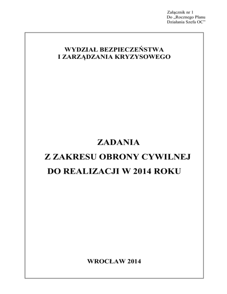 Załącznik nr 1 Do „Rocznego Planu Działania Szefa OC” WYDZIAŁ BEZPIECZEŃSTWA I ZARZĄDZANIA KRYZYSOWEGO ZADANIA Z ZAKRESU OBRONY CYWILNEJ DO REALIZACJI W 2014 ROKU WROCŁAW 2014 ZASADNICZYM CELEM DZIAŁANIA OBRONY CYWILNEJ W 2014 ROKU BĘDZIE: Wzmacnianie zdolności struktur obrony cywilnej w sferze ochrony ludności przed niebezpieczeństwami wynikającymi z działań zbrojnych lub klęsk żywiołowych oraz przezwyciężanie ich bezpośrednich następstw poprzez dostosowanie istniejących rozwiązań w dziedzinie ochrony ludności do aktualnych potrzeb w zakresie bezpieczeństwa, ze szczególnym uwzględnieniem zagadnień związanych z planowaniem, realizacją szkoleń i ćwiczeń oraz wyposażenia formacji obrony cywilnej. Podejmowanie działań integrujących działalność organów administracji publicznej w realizacji zadań obrony cywilnej w ramach istniejących rozwiązań prawnych i organizacyjnych w tym zakresie, ze szczególnym uwzględnieniem współdziałania w zakresie monitorowaia i powiadamiania o zagrożeniach, ostrzegania i alarmowania oraz planowania obrony cywilnej. Główny wysiłek realizacji zadań obrony cywilnej w 2014 roku skoncentrowany będzie na: 1) Kontynuowaniu procesu dostosowywania istniejących rozwiązań w dziedzinie obrony cywilnej do aktualnych potrzeb w zakresie bezpieczeństwa ludności cywilnej. 2) Analizowaniu i opracowaniu rozwiązań usprawniających realizację zadań obrony cywilnej w istniejącym stanie prawnym. 3) Utrzymywaniu współpracy z jednostkami Państwowej Straży Pożarnej, Policji i Sił Zbrojnych RP oraz społecznych organizacji ratowniczych na rzecz ochrony ludności. 4) Upowszechnianiu zadań z zakresu ochrony ludności i obrony cywilnej poprzez realizację szkoleń z zakresu powszechnej samoobrony. 5) Zapewnieniu warunków do szkolenia personelu obrony cywilnej. 6) Realizacji zadań z zakresu zaopatrywania organów i formacji obrony cywilnej w sprzęt niezbędny do wykonywania zadań. 7) Udziale w wypracowaniu koncepcji kierunków działań w zakresie budownictwa ochronnego. 2 Na podstawie § 4 pkt 4) rozporządzenia Rady Ministrów z dnia 25 czerwca 2002 r. w sprawie szczegółowego działania Szefa Obrony Cywilnej Kraju, szefów obrony cywilnej województw, powiatów i gmin (Dz. U. z 2002 r. Nr 96, poz. 850), Programu Doskonalenia Obrony Cywilnej województwa dolnośląskiego na lata 2009-2018, Wytycznych Szefa Obrony Cywilnej Województwa Dolnośląskiego z dnia 11 stycznia 2013 r. do działalności w dziedzinie obrony cywilnej w 2014 roku., określam zadania dla szefów obrony cywilnej instytucji, przedsiębiorstw, społecznych organizacji ratowniczych i innych jednostkach organizacyjnych działających na obszarze Wrocławia: 1. W zakresie organizacyjno – prawnym: 1) Kontynuować współpracę na wszystkich szczeblach w zakresie funkcjonowania systemów obserwacji, pomiarów, analiz prognozowania i powiadamiania o skażeniach i innych zagrożeniach dla ludzi. 2) Dążyć do zapewnienia spójności procesów planowania obrony cywilnej i zarządzania kryzysowego. 3) Na bieżąco śledzić zmiany aktów prawnych w zakresie obrony cywilnej i ochrony ludności, bezpieczeństwa, zarządzania kryzysowego, ratownictwa medycznego i terminowo wdrażać je w życie. 4) Doskonalić współpracę na poszczególnych szczeblach administracji, a szczególnie z organami Państwowej Straży Pożarnej, Policji Państwowej i Sił Zbrojnych RP w zakresie wzajemnego przepływu informacji. 5) Kontynuować współpracę z organizacjami pozarządowymi na rzecz realizacji zadań obrony cywilnej. 6) Przestrzegać terminów składania sprawozdań oraz informacji (wg obowiązujących lub doraźnie podanych wzorów) o realizacji zadań z zakresu obrony cywilnej. 2. W zakresie planowania i ratownictwa: 1) Opracować roczny plan działania obrony cywilnej na 2014 r., który zgodnie z § 5. ust. 1 rozporządzenia Rady Ministrów z dnia 25 czerwca 2002 r. w sprawie szczegółowego zakresu działania Szefa Obrony Cywilnej Kraju, szefów obrony cywilnej województw, powiatów i gmin (Dz. U. z 2002 r. Nr 96, poz.850) podlega uzgodnieniu z właściwym terenowo organem obrony cywilnej) i przedłożyć do uzgodnienia w Wydziale Bezpieczeństwa i Zarządzania Kryzysowego do dnia 31 marca 2014 r. (wieloletni plan działania obrony cywilnej – co cztery lata). 3 2) Dokonać szczegółowego przeglądu formacji obrony cywilnej oraz przedstawić ocenę faktycznych możliwości ich wykorzystania: a) dokonać analizy zagrożeń i ich skali; b) określić potrzeby funkcjonowania terenowych formacji obrony cywilnej; c) dokonać kontroli funkcjonujących formacji obrony cywilnej; d) stosownie do potrzeb i możliwości zreorganizować istniejące struktury formacji obrony cywilnej. 3) Plan Ochrony Zabytków uaktualnić w terminie do 31 marca 2014 r. 4) Plany Obrony Cywilnej aktualizować na bieżąco. 3. W zakresie wykrywania zagrożeń, ostrzegania i alarmowania: 1) Utrzymywać w stałej sprawności system alarmowania ludności oraz system zarządzania poprzez łączność telefoniczną i radiotelefoniczną. 2) Kontynuować doskonalenie procedur powiadamiania, ostrzegania i alarmowania na wypadek zagrożeń. 3) Prowadzić monitoring możliwości wystąpienia zagrożeń. 4) Podczas ćwiczeń i treningów prowadzić przedsięwzięcia szkoleniowe formacji obrony cywilnej systemu wykrywania i alarmowania (SWA) mające na celu utrzymanie gotowości systemu do realizacji przewidzianych zadań. 5) Podczas ćwiczeń i treningów rozpowszechniać wśród społeczeństwa aktualne rodzaje alarmów, sygnały alarmowe i komunikaty ostrzegawcze zgodnie z załącznikiem do rozporządzenia Rady Ministrów z dnia 7 stycznia 2013 r. (poz. 96). 6) Dążyć do podniesienia wiedzy na temat lokalnych zagrożeń oraz sposobów zachowania się na wypadek ich wystąpienia. 7) Zapewnić uczestnictwo właściwej liczby osób i jednostek organizacyjnych SWA biorących udział w ćwiczeni