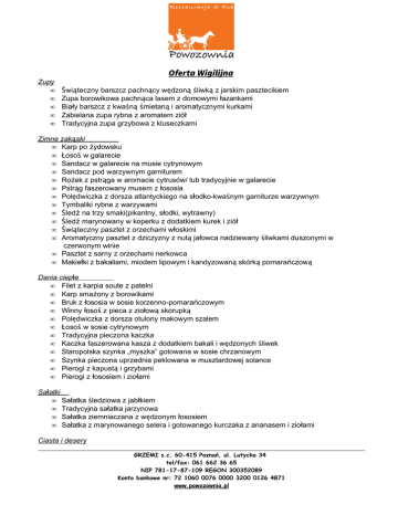Oferta Wigilijna Zupy • • • • • Świąteczny barszcz pachnący wędzoną śliwką z jarskim pasztecikiem Zupa borowikowa pachnąca lasem z domowymi łazankami Biały barszcz z kwaśną śmietaną i aromatycznymi kurkami Zabielana zupa rybna z aromatem ziół Tradycyjna zupa grzybowa z kluseczkami Zimne zakąski • Karp po żydowsku • Łosoś w galarecie • Sandacz w galarecie na musie cytrynowym • Sandacz pod warzywnym garniturem • Rożek z pstrąga w aromacie cytrusów/ lub tradycyjnie w galarecie • Pstrąg faszerowany musem z łososia • Polędwiczka z dorsza atlantyckiego na słodko-kwaśnym garniturze warzywnym • Tymbaliki rybne z warzywami • Śledź na trzy smaki(pikantny, słodki, wytrawny) • Śledź marynowany w koperku z dodatkiem kurek i ziół • Świąteczny pasztet z orzechami włoskimi • Aromatyczny pasztet z dziczyzny z nutą jałowca nadziewany śliwkami duszonymi w czerwonym winie • Pasztet z sarny z orzechami nerkowca • Makiełki z bakaliami, miodem lipowym i kandyzowaną skórką pomarańczową Dania ciepłe • Filet z karpia soute z patelni • Karp smażony z borowikami • Bruk z łososia w sosie korzenno-pomarańczowym • Winny łosoś z pieca z ziołową skorupką • Polędwiczka z dorsza otulony makowym szalem • Łosoś w sosie cytrynowym • Tradycyjna pieczona kaczka • Kaczka faszerowana kasza z dodatkiem bakali i wędzonych śliwek • Staropolska szynka „myszka” gotowana w sosie chrzanowym • Szynka pieczona uprzednia peklowana w musztardowej solance • Pierogi z kapustą i grzybami • Pierogi z łososiem i ziołami Sałatki • Sałatka śledziowa z jabłkiem • Tradycyjna sałatka jarzynowa • Sałatka ziemniaczana z wędzonym łososiem • Sałatka z marynowanego selera i gotowanego kurczaka z ananasem i ziołami Ciasta i desery GRZEMI s.c. 60-415 Poznań, ul. Lutycka 34 tel/fax: 061 662 36 65 NIP 781-17-87-109 REGON 300352089 Konto bankowe nr: 72 1060 0076 0000 3200 0126 4871 www.powozownia.pl • • • • • • • • • Domowy sernik z brzoskwiniami Zawijany makowiec po poznańsku Jabłecznik tradycyjny Piernik świąteczny Świąteczna babka bakaliowa Keks świąteczny Strudel z jabłkami Miodownik Tiramisu • Panna Cotta • Deser jabłkowo- limonkowy • Deser cappucino z konfiturą z czarnej porzeczki Bufet kawowo- herbaciany • Kawa serwowana według życzenia z cukrem lub ze słodzikiem i cytryną • Herbata serwowana według życzenia z cukrem lub ze słodzikiem • Soki: pomarańczowy, jabłkowy, z czarnej porzeczki - 0,5l/ osobę • Woda niegazowana i gazowana – 0,5l / osobę Atrakcje kulinarne • Pieczona szynka wieprzowa podawane z tradycyjnym farszem z kaszy i podrobów GRZEMI s.c. 60-415 Poznań, ul. Lutycka 34 tel/fax: 061 662 36 65 NIP 781-17-87-109 REGON 300352089 Konto bankowe nr: 72 1060 0076 0000 3200 0126 4871 www.powozownia.pl