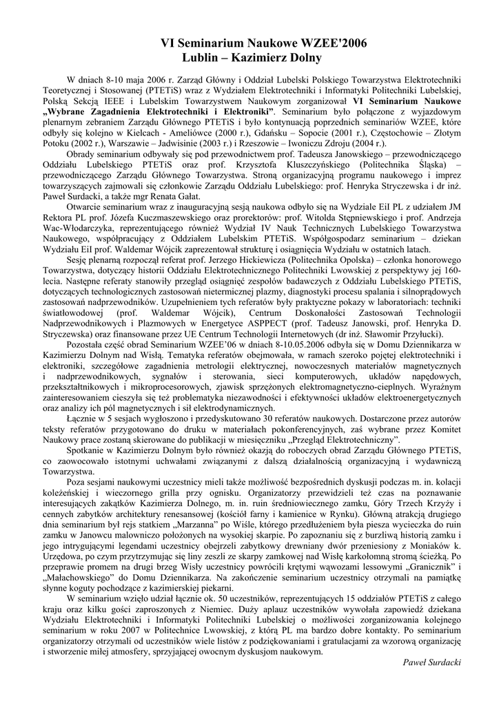 VI Seminarium Naukowe WZEE'2006 Lublin – Kazimierz Dolny W dniach 8-10 maja 2006 r. Zarząd Główny i Oddział Lubelski Polskiego Towarzystwa Elektrotechniki Teoretycznej i Stosowanej (PTETiS) wraz z Wydziałem Elektrotechniki i Informatyki Politechniki Lubelskiej, Polską Sekcją IEEE i Lubelskim Towarzystwem Naukowym zorganizował VI Seminarium Naukowe „Wybrane Zagadnienia Elektrotechniki i Elektroniki”. Seminarium było połączone z wyjazdowym plenarnym zebraniem Zarządu Głównego PTETiS i było kontynuacją poprzednich seminariów WZEE, które odbyły się kolejno w Kielcach - Ameliówce (2000 r.), Gdańsku – Sopocie (2001 r.), Częstochowie – Złotym Potoku (2002 r.), Warszawie – Jadwisinie (2003 r.) i Rzeszowie – Iwoniczu Zdroju (2004 r.). Obrady seminarium odbywały się pod przewodnictwem prof. Tadeusza Janowskiego – przewodniczącego Oddziału Lubelskiego PTETiS oraz prof. Krzysztofa Kluszczyńskiego (Politechnika Śląska) – przewodniczącego Zarządu Głównego Towarzystwa. Stroną organizacyjną programu naukowego i imprez towarzyszących zajmowali się członkowie Zarządu Oddziału Lubelskiego: prof. Henryka Stryczewska i dr inż. Paweł Surdacki, a także mgr Renata Gałat. Otwarcie seminarium wraz z inauguracyjną sesją naukowa odbyło się na Wydziale EiI PL z udziałem JM Rektora PL prof. Józefa Kuczmaszewskiego oraz prorektorów: prof. Witolda Stępniewskiego i prof. Andrzeja Wac-Włodarczyka, reprezentującego również Wydział IV Nauk Technicznych Lubelskiego Towarzystwa Naukowego, współpracujący z Oddziałem Lubelskim PTETiS. Współgospodarz seminarium – dziekan Wydziału EiI prof. Waldemar Wójcik zaprezentował strukturę i osiągnięcia Wydziału w ostatnich latach. Sesję plenarną rozpoczął referat prof. Jerzego Hickiewicza (Politechnika Opolska) – członka honorowego Towarzystwa, dotyczący historii Oddziału Elektrotechnicznego Politechniki Lwowskiej z perspektywy jej 160lecia. Następne referaty stanowiły przegląd osiągnięć zespołów badawczych z Oddziału Lubelskiego PTETiS, dotyczących technologicznych zastosowań nietermicznej plazmy, diagnostyki procesu spalania i silnoprądowych zastosowań nadprzewodników. Uzupełnieniem tych referatów były praktyczne pokazy w laboratoriach: techniki światłowodowej (prof. Waldemar Wójcik), Centrum Doskonałości Zastosowań Technologii Nadprzewodnikowych i Plazmowych w Energetyce ASPPECT (prof. Tadeusz Janowski, prof. Henryka D. Stryczewska) oraz finansowane przez UE Centrum Technologii Internetowych (dr inż. Sławomir Przyłucki). Pozostała część obrad Seminarium WZEE’06 w dniach 8-10.05.2006 odbyła się w Domu Dziennikarza w Kazimierzu Dolnym nad Wisłą. Tematyka referatów obejmowała, w ramach szeroko pojętej elektrotechniki i elektroniki, szczegółowe zagadnienia metrologii elektrycznej, nowoczesnych materiałów magnetycznych i nadprzewodnikowych, sygnałów i sterowania, sieci komputerowych, układów napędowych, przekształtnikowych i mikroprocesorowych, zjawisk sprzężonych elektromagnetyczno-cieplnych. Wyraźnym zainteresowaniem cieszyła się też problematyka niezawodności i efektywności układów elektroenergetycznych oraz analizy ich pól magnetycznych i sił elektrodynamicznych. Łącznie w 5 sesjach wygłoszono i przedyskutowano 30 referatów naukowych. Dostarczone przez autorów teksty referatów przygotowano do druku w materiałach pokonferencyjnych, zaś wybrane przez Komitet Naukowy prace zostaną skierowane do publikacji w miesięczniku „Przegląd Elektrotechniczny”. Spotkanie w Kazimierzu Dolnym było również okazją do roboczych obrad Zarządu Głównego PTETiS, co zaowocowało istotnymi uchwałami związanymi z dalszą działalnością organizacyjną i wydawniczą Towarzystwa. Poza sesjami naukowymi uczestnicy mieli także możliwość bezpośrednich dyskusji podczas m. in. kolacji koleżeńskiej i wieczornego grilla przy ognisku. Organizatorzy przewidzieli też czas na poznawanie interesujących zakątków Kazimierza Dolnego, m. in. ruin średniowiecznego zamku, Góry Trzech Krzyży i cennych zabytków architektury renesansowej (kościół farny i kamienice w Rynku). Główną atrakcją drugiego dnia seminarium był rejs statkiem „Marzanna” po Wiśle, którego przedłużeniem była piesza wycieczka do ruin zamku w Janowcu malowniczo położonych na wysokiej skarpie. Po zapoznaniu się z burzliwą historią zamku i jego intrygującymi legendami uczestnicy obejrzeli zabytkowy drewniany dwór przeniesiony z Moniaków k. Urzędowa, po czym przytrzymując się liny zeszli ze skarpy zamkowej nad Wisłę karkołomną stromą ścieżką. Po przeprawie promem na drugi brzeg Wisły uczestnicy powrócili krętymi wąwozami lessowymi „Granicznik” i „Małachowskiego” do Domu Dziennikarza. Na zakończenie seminarium uczestnicy otrzymali na pamiątkę słynne koguty pochodzące z kazimierskiej piekarni. W seminarium wzięło udział łącznie ok. 50 uczestników, reprezentujących 15 oddziałów PTETiS z całego kraju oraz kilku gości zaproszonych z Niemiec. Duży aplauz uczestników wywołała zapowiedź dziekana Wydziału Elektrotechniki i Informatyki Politechniki Lubelskiej o możliwości zorganizowania kolejnego seminarium w roku 2007 w Politechnice Lwowskiej, z którą PL ma bardzo dobre kontakty. Po seminarium organizatorzy otrzymali od uczestników wiele listów z podziękowaniami i gratulacjami za wzorową organizację i stworzenie miłej atmosfery, sprzyjającej owocnym dyskusjom naukowym. Paweł Surdacki Seminarium WZEE’2006 Fot. 1. Uczestnicy Seminarium WZEE’2006 na Górze Trzech Krzyży Fot. 2. Sesje inauguracyjną Seminarium WZEE prowadził prof. T. Janowski. Po lewej: rektor PL prof. J. Kuczmaszewski i przewodniczący ZG PTETiS prof. K. Kluszczyński. Po prawej: prorektor PL prof. A. Wac-Włodarczyk i dziekan WEiI prof. W. Wójcik. Fot. 3. Pokazy lewitacji nadprzewodnikowej w Centrum Doskonałości ASPPECT Fot.