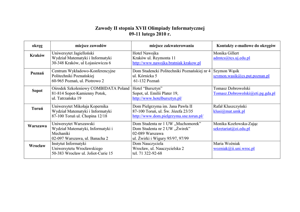 Zawody II stopnia XVII Olimpiady Informatycznej 09-11 lutego 2010 r. okręg Kraków Poznań Sopot Toruń Warszawa Wrocław miejsce zawodów miejsce zakwaterowania Kontakty e-mailowe do okręgów Uniwersytet Jagielloński Wydział Matematyki i Informatyki 30-348 Kraków, ul Łojasiewicza 6 Hotel Nawojka Kraków ul. Reymonta 11 http://www.nawojka.bratniak.krakow.pl Centrum Wykładowo-Konferencyjne Politechniki Poznańskiej 60-965 Poznań, ul. Piotrowo 2 Dom Studencki Politechniki Poznańskiej nr 4 Szymon Wąsik ul. Kórnicka 5 [email protected] 61-132 Poznań Monika Gillert [email protected] Ośrodek Szkoleniowy COMBIDATA Poland Hotel “Bursztyn” 81-814 Sopot-Kamienny Potok, Sopot, ul. Emilii Plater 19, ul. Tatrzańska 19 http://www.hotelbursztyn.pl/ Tomasz Dobrowolski [email protected] Uniwersytet Mikołaja Kopernika Wydział Matematyki i Informatyki 87-100 Toruń ul. Chopina 12/18 Dom Pielgrzyma im. Jana Pawła II 87-100 Toruń, ul. Św. Józefa 23/35 http://www.dom.pielgrzyma.sne.torun.pl/ Rafał Kluszczyński [email protected] Uniwersytet Warszawski Wydział Matematyki, Informatyki i Mechaniki 02-097 Warszawa, ul. Banacha 2 Instytut Informatyki Uniwersytetu Wrocławskiego 50-383 Wrocław ul. Joliot-Curie 15 Dom Studenta nr 1 UW „Muchomorek” Dom Studenta nr 2 UW „Żwirek” 02-089 Warszawa ul. Żwirki i Wigury 95/97, 97/99 Dom Nauczyciela Wrocław, ul. Nauczycielska 2 tel. 71 322-92-68 Monika Kozłowska-Zając [email protected] Maria Woźniak [email protected]