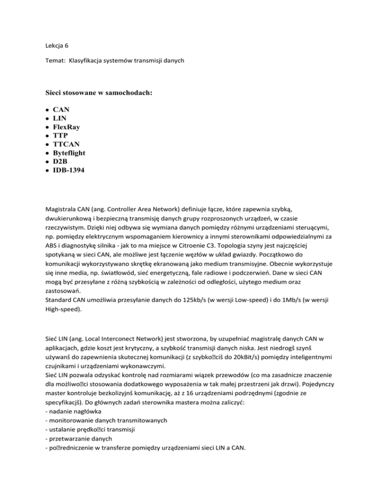 Lekcja 6 Temat: Klasyfikacja systemów transmisji danych Sieci stosowane w samochodach: CAN LIN FlexRay TTP TTCAN Byteflight D2B IDB-1394 Magistrala CAN (ang. Controller Area Network) definiuje łącze, które zapewnia szybką, dwukierunkową i bezpieczną transmisję danych grupy rozproszonych urządzeń, w czasie rzeczywistym. Dzięki niej odbywa się wymiana danych pomiędzy różnymi urządzeniami steruącymi, np. pomiędzy elektrycznym wspomaganiem kierownicy a innymi sterownikami odpowiedzialnymi za ABS i diagnostykę silnika - jak to ma miejsce w Citroenie C3. Topologia szyny jest najczęściej spotykaną w sieci CAN, ale możliwe jest łączenie węzłów w układ gwiazdy. Początkowo do komunikacji wykorzystywano skrętkę ekranowaną jako medium transmisyjne. Obecnie wykorzystuje się inne media, np. światłowód, sieć energetyczną, fale radiowe i podczerwień. Dane w sieci CAN mogą być przesyłane z różną szybkością w zależności od odległości, użytego medium oraz zastosowań. Standard CAN umożliwia przesyłanie danych do 125kb/s (w wersji Low-speed) i do 1Mb/s (w wersji High-speed). Sieć LIN (ang. Local Interconect Network) jest stworzona, by uzupełniać magistralę danych CAN w aplikacjach, gdzie koszt jest krytyczny, a szybkość transmisji danych niska. Jest niedrogš szynš używanš do zapewnienia skutecznej komunikacji (z szybkociš do 20kBit/s) pomiędzy inteligentnymi czujnikami i urządzeniami wykonawczymi. Sieć LIN pozwala odzyskać kontrolę nad rozmiarami wiązek przewodów (co ma zasadnicze znaczenie dla możliwoci stosowania dodatkowego wyposażenia w tak małej przestrzeni jak drzwi). Pojedynczy master kontroluje bezkolizyjnš komunikację, aż z 16 urządzeniami podrzędnymi (zgodnie ze specyfikacjš). Do głównych zadań sterownika mastera można zaliczyć: - nadanie nagłówka - monitorowanie danych transmitowanych - ustalanie prędkoci transmisji - przetwarzanie danych - poredniczenie w transferze pomiędzy urządzeniami sieci LIN a CAN. Sieć FlexRay jest zaprojektowana aby uzupełnić istniejące sieci CAN, LIN i MOST. Stosowana ma być do aplikacji typu steer-by-wire i brake-by-wire. Jest szyną używającą połączeń punkt-punkt w topologii gwiazdy, z szybkością transmisji od 500kb/s do 10Mb/s przez skrętkę nieekranowaną UTP (ang. Unshielded Twisted Pair), skrętkę ekranowaną STP (ang. Shielded Twisted Pair) albo plastikowy światłowód. Technologia FlexRay używa synchronicznej i asynchronicznej transmisji danych. Synchroniczna transmisja danych umożliwia komunikację time-tiggered. Ma ona gwarantowane minimum opóźnienia wiadomości i jitter (zmienność opóźnienia). FlexRay został stworzony przez BMW i DaimlerChrysler, którzy połšczyli się z Philipsem i Motorolą we wrzeniu 2000 roku, by utworzyć konsorcjum FlexRay. Od tego czasu, do tej grupy dołączyło jeszcze trzech partnerów: Bosch, General Motors i Volkswagen. W 2006 roku BMW planuje zastosować technologię FlexRay w produkcj Protokół TTP (ang. Time-Triggerd Protocol) skupia się na bezpieczeństwie krytycznych i szybkich zastosowań. Używa on architektury time-tiggered (TTA). Kontroler magistrali podczas pierwotnie zdefiniowanej szczeliny czasowej komunikuje się z uczestnikami sieci - punktami węzłowymi. W technologii TTP, nie ma w zasadzie żadnego ograniczenia dotyczącego szybkości transmisji i długości ramki, która może zostać wybrana indywidualnie, zgodnie z wymaganiami aplikacji. Szczeliny czasowe także nie muszą mieć takiej samej długości. Przykładem jest ramka aktualnie dostępnego sterownika komunikacji AS8202NF. Ma ona elastyczną długość dochodzącą do 244 bajtów (z 240 bajtami przeznaczonymi na dane). Pasmo wynosi do 5Mb/s w asynchronicznym trybie oraz 25Mb/s w synchronicznym trybie. Następny projekt systemu TTP ma być przygotowany do transmisji z szybkością 1Gb/s. Jest on obecnie na etapie badań laboratoryjnych Time-Tiggered CAN jest rozszerzonym standardem opartym na CAN ( np.: posiada identyczny format ramki). Komunikacja oparta jest na czasowym wysyłaniu wiadomości (gdzie urządzenie czasowe ustala odpowiedni czas odniesienia). Zaletą jego jest możliwość przesyłania informacji powodowanej wystąpieniem zdarzenia w zadanym oknie czasowym. TTCAN posiada warstwę sesji, której brakowało w standardzie CAN, służšcš do zapewnienia poprawnoci transmisji. Znajduje się ona nad istniejącymi warstwami łącza danych i fizycznej. Magistrali tej używa się głównie w systemach zarządzania silnika, transmisji i kontroli podwozia, dla aplikacji x-by-wire