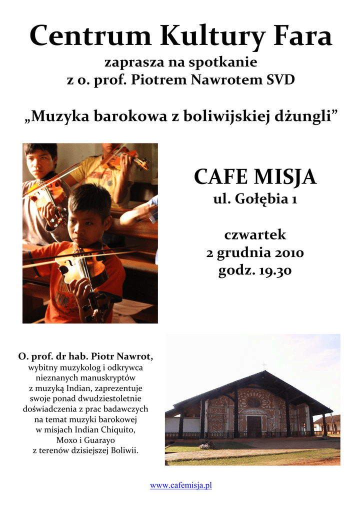 Centrum Kultury Fara zaprasza na spotkanie z o. prof. Piotrem Nawrotem SVD „Muzyka barokowa z boliwijskiej dżungli” CAFE MISJA ul. Gołębia 1 czwartek 2 grudnia 2010 godz. 19.30 O. prof. dr hab. Piotr Nawrot, wybitny muzykolog i odkrywca nieznanych manuskryptów z muzyką Indian, zaprezentuje swoje ponad dwudziestoletnie doświadczenia z prac badawczych na temat muzyki barokowej w misjach Indian Chiquito, Moxo i Guarayo z terenów dzisiejszej Boliwii. www.cafemisja.pl
