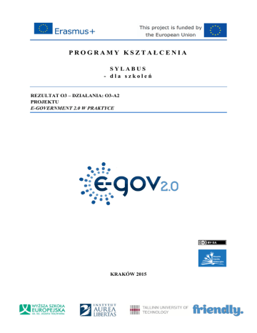 PROGRAMY KSZTAŁCENIA SYLABUS - dla szkoleń REZULTAT O3 – DZIAŁANIA: O3-A2 PROJEKTU E-GOVERNMENT 2.0 W PRAKTYCE KRAKÓW 2015 1 Spis treści NARZĘDZIA WEB 2.0 W SEKTORZE PUBLICZNYM – SZKOLENIE 48H ..............................................................................2 BADANIA OPINII SPOŁECZNEJ - METODOLOGIA – SZKOLENIE 24H ................................................................................4 TRENING UMIEJĘTNOŚCI KOMUNIKACYJNYCH – SZKOLENIE 16H ..................................................................................6 1 Narzędzia web 2.0 w sektorze publicznym – szkolenie 48h Adresaci szkolenia Szkolenie dedykowane jest osobom, które pracują w administracji publicznej lub interesują się wykorzystywaniem nowoczesnych narzędzi internetowych w szeroko pojętym sektorze publicznym: specjaliści ds. marketingu, informatycy, kierownicy i pracownicy JST trenerzy, doradcy i konsultanci zaangażowani w działania JST organizacje pozarządowe Opis szkolenia Szkolenie składa się z sześciu 8-godzinnych dni szkoleniowych. Podczas szkolenia uczestnicy dowiedzą się czym jest e-government 2.0 oraz w jakich obszarach ma zastosowania. Zostaną przedstawione zarówno dobre jak i złe praktyki wdrożeń. Uczestnicy dowiedzą się jakie korzyści wynikają z crowdsourcingu oraz dlaczego ważne jest udostępnianie informacji publicznych do ich ponownego wykorzystania. Zostanie im zaprezentowane jedno z najbardziej przydatnych narzędzi do zarządzania treścią w Internecie: Wordpress. Uczestnicy nauczą się wykorzystywać je w zakresie podstawowych funkcjonalności niezbędnych do zarządzania stroną internetową. Kluczowym elementem szkolenia będzie blok poświęcony warsztatom IT z wirtualnego laboratorium e-Government 2.0. Aplikacja umożliwia uczestnictwo w warsztatach online symulujących procesy konsultacji społecznych online, crowdsourcingu, audytu obywatelskiego itp. Zaprezentowane narzędzie może być wykorzystywane w realnej pracy zawodowej w administracji publicznej lub sektorze NGO. Na zakończenie odbędzie się podsumowanie szkolenia. Efekty kształcenia realizowane podczas szkolenia Poznanie możliwości i różnych zastosowań systemu WordPress Poznanie wytycznych dotyczących dostępności stron internetowych oraz związanych z prawami autorskimi zasad wykorzystywania zasobów Znajomość kluczowych projektów z obszaru e-administracji, w tym rozwiązań IT powstałych lub powstających w ramach tych projektów 2 Znajomość systemów IT wykorzystywanych do wspierania pracy urzędów administracji publicznej Zrozumienie zmian związanych z rozwojem eGov 2.0 Świadomość znaczenia włączania obywateli w proces partycypacji, transparentności procesu konsultacji społecznych Świadomość celów przejrzystości działania organów państwowych, angażowania obywateli w procesy podejmowania decyzji dotyczących państwa i otwartości instytucji publicznych 3 Badania opinii społecznej - metodologia – szkolenie 24h Adresaci szkolenia Szkolenie adresowane jest do pracowników administracji publicznej, pracowników sektora organizacji pozarządowych jak również do pracowników biznesu i innych instytucji, które planują organizację i realizację procesu konsultacji społecznych lub chcą poznać opinię mieszkańców swojej gminy, miasta, dzielnicy czy osiedla na temat planowanych inwestycji, przedsięwzięć. W szczególności szkolenie skierowane jest do: Kierowników i pracowników działów odpowiedzialnych za m.in. konsultacje społeczne, budżet obywatelski Konsultantów, facylitatorów i moderatorów zaangażowanych w procesy konsultacji społecznych, budżetowania obywatelskiego etc. Pracowników organizacji pozarządowych i innych instytucji zaangażowanych w procesy konsultacji społecznych, budżetowania obywatelskiego etc. Opis szkolenia Szkolenie składa się z trzech 8-godzinnych dni szkoleniowych. Podczas szkolenia uczestnicy poznają podstawy metodologii badań społecznych oraz etapy procesu badawczego. Dowiedzą się jakie znaczenie ma poprawne stawianie problemów, pytań i hipotez badawczych, jak realizować etap konceptualizacji badania (definiowanie badanych pojęć i zakresu badania) oraz operacjonalizacji badania (dobór zmiennych i wskaźników do badania). Następnie poznają zasady doboru próby badawczej (czym jest populacja badania, próba badawcza, operat, metody doboru próby badawczej, dobór losowy i celowy do badania) a także podstawowe wskazówki przygotowywania narzędzi badawczych (kwestionariuszy ankiet, przewodników do wywiadów). W dalszej kolejności szkolenia uczestnicy poznają ilościowe i jakościowe metody badawcze oraz towarzyszące im techniki badawcze (wywiad indywidualny, wywiad grupowy, ankieta internetowa, obserwacja etc.). Uczestnicy zostaną zapoznani z zasadami analizy danych oraz raportowania wyników badania. Jednym z kluczowych elementów szkolenie będzie pozyskanie wiedzy, na podstawie praktycznych ćwiczeń i symulacji (case studies), na temat organizacji badania terenowego, przygotowywania harmonogramu i budżetu badania. Dodatkowo badani nabędą wiedzę i umiejętności związane ze zlecaniem badania – jak sporządzić ofertę 4 badawczą, w jaki sposób współpracować z wykonawcom, jak monitorować proces realizacji badania etc. Na zakończenie odbędzie się podsumowanie szkolenia. Efekty kształcenia realizowane podczas szkolenia Poznanie podstawowych zasad poprawnej realizacji badań społecznych, metodologii badawczej, etapów procesów badawczych Nabycie umiejętności zaplanowania i zrealizowania prostego badania ilościowego lub jakościowego, analizy jego wyników i przygotowania raportu Nabycie umiejętności przygotowania oferty na realizację badania społecznego, harmonogramu i budżetu badania oraz planu monitorowania prac wykonawców Nabycie umiejętności wykorzystania pozyskanych w trakcie badania informacji w realizowanych przedsięwzięciach, in
