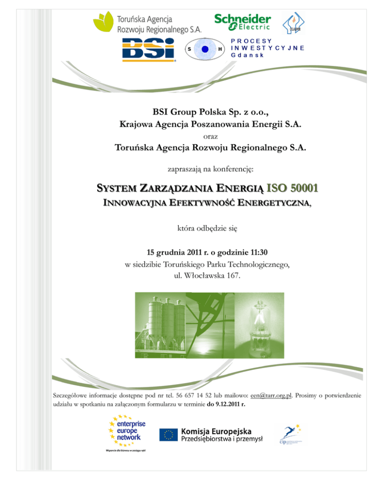 BSI Group Polska Sp. z o.o., Krajowa Agencja Poszanowania Energii S.A. oraz Toruńska Agencja Rozwoju Regionalnego S.A. zapraszają na konferencję: SYSTEM ZARZĄDZANIA ENERGIĄ ISO 50001 INNOWACYJNA EFEKTYWNOŚĆ ENERGETYCZNA, która odbędzie się 15 grudnia 2011 r. o godzinie 11:30 w siedzibie Toruńskiego Parku Technologicznego, ul. Włocławska 167. Szczegółowe informacje dostępne pod nr tel. 56 657 14 52 lub mailowo: [email protected]. Prosimy o potwierdzenie udziału w spotkaniu na załączonym formularzu w terminie do 9.12.2011 r.