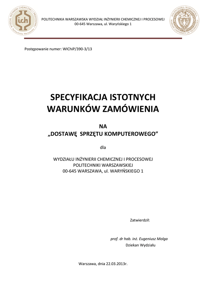POLITECHNIKA WARSZAWSKA WYDZIAŁ INŻYNIERII CHEMICZNEJ I PROCESOWEJ 00-645 Warszawa, ul. Waryńskiego 1 Postępowanie numer: WIChiP/390-3/13 SPECYFIKACJA ISTOTNYCH WARUNKÓW ZAMÓWIENIA NA „DOSTAWĘ SPRZĘTU KOMPUTEROWEGO” dla WYDZIAŁU INŻYNIERII CHEMICZNEJ I PROCESOWEJ POLITECHNIKI WARSZAWSKIEJ 00-645 WARSZAWA, ul. WARYŃSKIEGO 1 Zatwierdził: prof. dr hab. inż. Eugeniusz Molga Dziekan Wydziału Warszawa, dnia 22.03.2013r. Dokumentacja przetargowa Wydział Inżynierii Chemicznej i Procesowej Politechniki Warszawskiej ul. Waryńskiego 1, 00-645 Warszawa, reprezentowany przez: prof. dr hab. inż. Eugeniusza Molgę - Dziekana Wydziału, działającego na podstawie nominacji Rektora Politechniki Warszawskiej. oraz działając w oparciu o Ustawę z dnia 29 stycznia 2004 r. „Prawo Zamówień Publicznych” (Dz. U. Nr 19, poz. 177 z późniejszymi zmianami) zaprasza do złożenia oferty w „przetargu nieograniczonym” na: dostawę sprzętu komputerowego wyszczególnionego w Załączniku Nr 1. Specyfikacja Istotnych Warunków Zamówienia zawiera: ROZDZIAŁ I - Instrukcja dla Wykonawców 1. Zamawiający: Politechnika Warszawska, Wydział Inżynierii Chemicznej i Procesowej, 00-645 Warszawa, ul. Waryńskiego 1. 2. Tryb udzielenia zamówienia: Zamówienie prowadzone jest w trybie przetargu nieograniczonego zgodnie z art. 39 ustawy z dnia 29 stycznia 2004r. „Prawo Zamówień Publicznych” (Dz. U. Nr 19, poz. 177 z późniejszymi zmianami ) 3. Opis przedmiotu zamówienia: Przedmiotem niniejszego zamówienia jest dostawa sprzętu komputerowego określonego w specyfikacji technicznej podanej szczegółowo w załączniku nr 1. i musi spełniać wymagania techniczne określone w /w załączniku. Wg CPV: - Komputery osobiste - Komputery przenośne - Monitory - Drukarki laserowe - Drukarki atramentowe - Akcesoria zasilające - 30.21.30.00-5 - 30.21.31.00-6 - 30.23.13.00-0 - 30.23.21.10-8 - 30.23.21.50-0 - 30.23.72.80-5 2|Strona Szczególne wymagania dotyczące przedmiotu zamówienia: -Ilekroć w specyfikacji przedmiot zamówienia jest opisany ze wskazaniem znaków towarowych, patentów lub pochodzenia, to przyjmuje się, że wskazaniom takim towarzyszą wyrazy „lub równoważne” -Zamawiający przewiduje podział zamówienia na części. -Sprzęt powinien być produktem wysokiej jakości, musi być fabrycznie nowy, wolny od wad materiałowych i prawnych. -Sprzęt oraz jego wyposażenie są oznakowane w taki sposób, aby możliwa była identyfikacja zarówno produktu jak i producenta. -Dostarczony sprzęt musi zawierać wszystkie niezbędne elementy umożliwiające rozpoczęcie pracy takie jak oprogramowanie, sterowniki, itp. -Oferowane urządzenia, oprogramowanie i licencje muszą pochodzić z oficjalnego kanału dystrybucji zgodnie z wymaganiami ich odpowiednich producentów. -Serwis gwarancyjny powinien być prowadzony przez serwis Wykonawcy autoryzowany przez producenta. W przypadku, gdy Wykonawca nie posiada autoryzowanego serwisu gwarancyjnego oferowanego sprzętu, Zamawiający dopuszcza, aby Wykonawca serwisu gwarancyjnego korzystał z pomocy producenta oferowanego sprzętu lub jego przedstawiciela, prowadzącego serwis techniczny w wymaganym zakresie. Każda autoryzacja dla serwisu Wykonawcy oraz deklaracja wspierania serwisu przez producenta lub jego przedstawiciela musi mieć formę oświadczenia producenta lub jego przedstawiciela. -Sprzęt musi spełniać wymagania wynikające z przepisów bezpieczeństwa i higieny pracy oraz wymagania i normy określone w opisach technicznych. -Wykonawca załączy do oferty szczegółowe specyfikacje techniczne sprzętu w języku polskim. Specyfikacje te powinny potwierdzać każdy z wymienionych w opisie przedmiotu zamówienia SIWZ parametrów technicznych oraz inne wymagania stawiane przez zamawiającego. -Zamawiający może wymagać, by na niektóre pozycje wchodzące w skład zadania dostawca wystawił osobne faktury, oraz by wskazane urządzenia/podzespoły były na fakturze wyszczególnione jako osobne pozycje. -Przedmiot zamówienia musi być dostarczony do siedziby Zamawiającego tj.: Politechnika Warszawska, Wydział Inżynierii Chemicznej i Procesowej, ul. Waryńskiego 1. 00-645 Warszawa, pokój nr. 177. Wymagania dotyczące gwarancji i serwisu: -Na dostarczony sprzęt Wykonawca udzieli gwarancji 24 miesięcy od daty dostawy. -Czas reakcji serwisu do 48 godzin. -W przypadku stwierdzenia wad w wykonanym przedmiocie umowy Wykonawca zobowiązuje się do ich nieodpłatnej wymiany lub usunięcia wad w terminie do 7 dni od daty zgłoszenia. -Wykonawca musi zapewnić autoryzowany przez producenta serwis gwarancyjny i pogwarancyjny. W czasie trwania gwarancji podczas dokonywania napraw gwarancyjnych Wykonawca zobowiązuje się odebrać i dostarczyć przedmiot zamówienia do siedziby Zamawiającego (jeśli naprawa nie jest możliwa w siedzibie Zamawiającego). 3|Strona 4. Termin wykonania zamówienia: Termin realizacji: 7 dni licząc od momentu dostarczenia Wykonawcy przez Zamawiającego kompletu dokumentów (zaświadczeń z Ministerstwa Nauki i Szkolnictwa Wyższego) upoważniającego Wykonawcę do przyjęcia 0% stawki VAT na sprzęt komputerowy objęty taką zniżką i 14 dni od momentu podpisania umowy na pozostały sprzęt nie zwolniony od podatku VAT. Komputery stacjonarne, monitory, i drukarki są objęte stawką podatku VAT w wysokości 0%- zgodnie z ustawą z dn. 11.03.2004r. o podatku od towarów i usług (Dz. U. nr 54 z dn. 5.04.2004r., poz. 535), art. 83, ust. 1, pkt. 26a. Zamawiający dostarczy wraz z zamówieniem odpowiednie poświadczenie, będące podstawą do wystawienia faktury z zerową stawką VAT. 5. 5.1 5.2 5.3 5.4 5.5 5.6 Opis warunków udziału w postępowaniu: O udział w postępowaniu mogą ubiegać się Wykonawcy, którzy spełniają warunki: - posiadania uprawnień do wykonywania określonej działalności lub czynności, jeżeli przepisy prawa nakładają obowiązek ich posiadania; - posiadania wiedzy i doświadcz