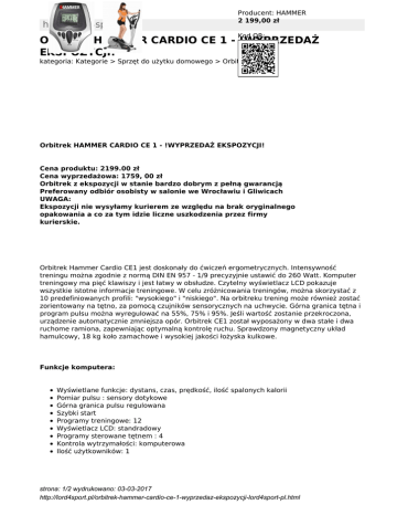 http://lord4sport.pl Producent: HAMMER 2 199,00 zł Kod QR: Orbitrek HAMMER CARDIO CE 1 - !WYPRZEDAŻ EKSPOZYCJI! kategoria: Kategorie > Sprzęt do użytku domowego > Orbitreki Orbitrek HAMMER CARDIO CE 1 - !WYPRZEDAŻ EKSPOZYCJI! Cena produktu: 2199.00 zł Cena wyprzedażowa: 1759, 00 zł Orbitrek z ekspozycji w stanie bardzo dobrym z pełną gwarancją Preferowany odbiór osobisty w salonie we Wrocławiu i Gliwicach UWAGA: Ekspozycji nie wysyłamy kurierem ze względu na brak oryginalnego opakowania a co za tym idzie liczne uszkodzenia przez firmy kurierskie. Orbitrek Hammer Cardio CE1 jest doskonały do ćwiczeń ergometrycznych. Intensywność treningu można zgodnie z normą DIN EN 957 - 1/9 precyzyjnie ustawić do 260 Watt. Komputer treningowy ma pięć klawiszy i jest łatwy w obsłudze. Czytelny wyświetlacz LCD pokazuje wszystkie istotne informacje treningowe. W celu zróżnicowania treningów, można skorzystać z 10 predefiniowanych profili: "wysokiego" i "niskiego". Na orbitreku trening może również zostać zorientowany na tętno, za pomocą czujników sensorycznych na uchwycie. Górna granica tętna i program pulsu można wyregulować na 55%, 75% i 95%. Jeśli wartość zostanie przekroczona, urządzenie automatycznie zmniejsza opór. Orbitrek CE1 został wyposażony w dwa stałe i dwa ruchome ramiona, zapewniając optymalną kontrolę ruchu. Sprawdzony magnetyczny układ hamulcowy, 18 kg koło zamachowe i wysokiej jakości łożyska kulkowe. Funkcje komputera: Wyświetlane funkcje: dystans, czas, prędkość, ilość spalonych kalorii Pomiar pulsu : sensory dotykowe Górna granica pulsu regulowana Szybki start Programy treningowe: 12 Wyświetlacz LCD: standradowy Programy sterowane tętnem : 4 Kontrola wytrzymałości: komputerowa Ilość użytkowników: 1 strona: 1/2 wydrukowano: 03-03-2017 http://lord4sport.pl/orbitrek-hammer-cardio-ce-1-wyprzedaz-ekspozycji-lord4sport-pl.html Dane techniczne: Regulowana stopka Rolki transportowe System hamowania: magnetyczny System napędu: pas klinowy Przełożenie: 1:8 Waga koła zamachowego: 18 kg Długość kroku: 36 cm Kontrola obciążenia: niezależna Zasilanie: 230 V, 50 Hz Max.waga użytkownika: 130 kg Waga orbitreka: 45 kg Wymiary: 145 x 62 x 166 cm Pozostałe informacje: Gwarancja 36 miesięcy Paragon lub faktura vat Numer katalogowy: 4195 UWAGA!!! Klienci, którzy zamierzają odwiedzić nasze salony w celu przetestowania prosimy o to,żeby przed przyjazdem sprawdzić telefonicznie czy dany model znajduje się aktualnie na ekspozycji danego salonu. strona: 2/2 wydrukowano: 03-03-2017 http://lord4sport.pl/orbitrek-hammer-cardio-ce-1-wyprzedaz-ekspozycji-lord4sport-pl.html