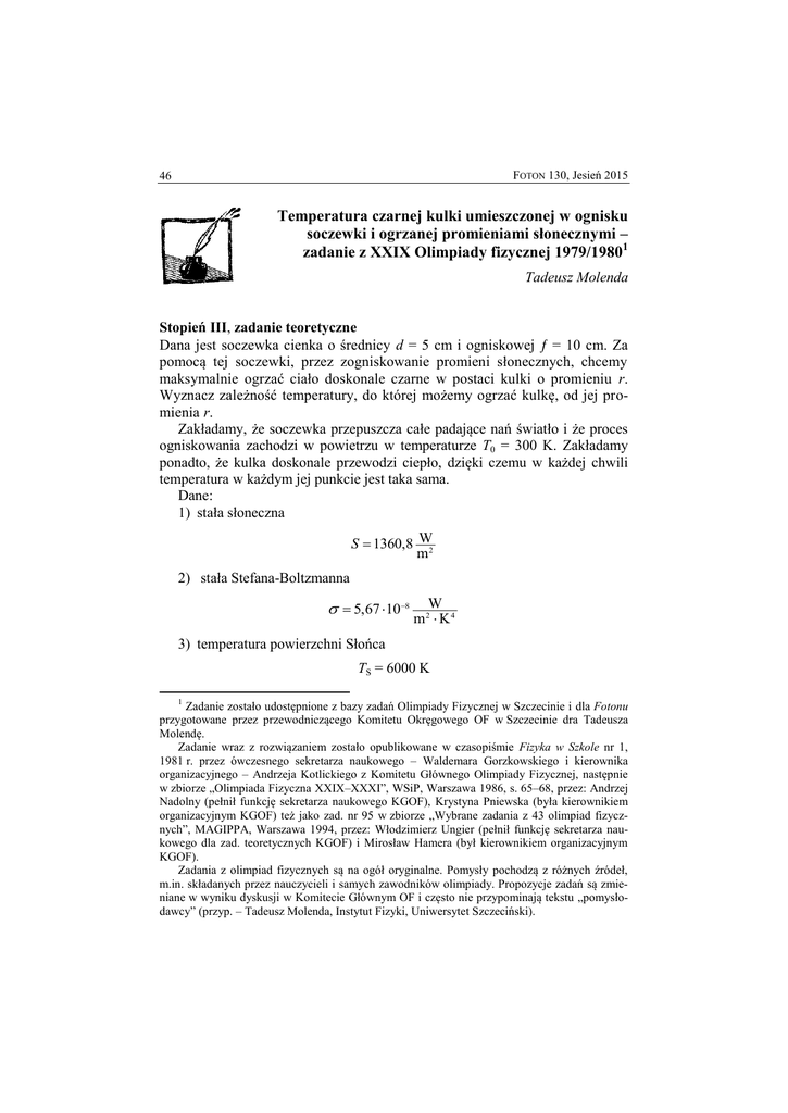 FOTON 130, Jesień 2015 46 Temperatura czarnej kulki umieszczonej w ognisku soczewki i ogrzanej promieniami słonecznymi – zadanie z XXIX Olimpiady fizycznej 1979/19801 Tadeusz Molenda Stopień III, zadanie teoretyczne Dana jest soczewka cienka o średnicy d = 5 cm i ogniskowej = 10 cm. Za pomocą tej soczewki, przez zogniskowanie promieni słonecznych, chcemy maksymalnie ogrzać ciało doskonale czarne w postaci kulki o promieniu r. Wyznacz zależność temperatury, do której możemy ogrzać kulkę, od jej promienia r. Zakładamy, że soczewka przepuszcza całe padające nań światło i że proces ogniskowania zachodzi w powietrzu w temperaturze T0 = 300 K. Zakładamy ponadto, że kulka doskonale przewodzi ciepło, dzięki czemu w każdej chwili temperatura w każdym jej punkcie jest taka sama. Dane: 1) stała słoneczna S 1360,8 W2 m 2) stała Stefana-Boltzmanna 5,67 108 W m2 K 4 3) temperatura powierzchni Słońca TS = 6000 K 1 Zadanie zostało udostępnione z bazy zadań Olimpiady Fizycznej w Szczecinie i dla Fotonu przygotowane przez przewodniczącego Komitetu Okręgowego OF w Szczecinie dra Tadeusza Molendę. Zadanie wraz z rozwiązaniem zostało opublikowane w czasopiśmie Fizyka w Szkole nr 1, 1981 r. przez ówczesnego sekretarza naukowego – Waldemara Gorzkowskiego i kierownika organizacyjnego – Andrzeja Kotlickiego z Komitetu Głównego Olimpiady Fizycznej, następnie w zbiorze „Olimpiada Fizyczna XXIX–XXXI”, WSiP, Warszawa 1986, s. 65–68, przez: Andrzej Nadolny (pełnił funkcję sekretarza naukowego KGOF), Krystyna Pniewska (była kierownikiem organizacyjnym KGOF) też jako zad. nr 95 w zbiorze „Wybrane zadania z 43 olimpiad fizycznych”, MAGIPPA, Warszawa 1994, przez: Włodzimierz Ungier (pełnił funkcję sekretarza naukowego dla zad. teoretycznych KGOF) i Mirosław Hamera (był kierownikiem organizacyjnym KGOF). Zadania z olimpiad fizycznych są na ogół oryginalne. Pomysły pochodzą z różnych źródeł, m.in. składanych przez nauczycieli i samych zawodników olimpiady. Propozycje zadań są zmieniane w wyniku dyskusji w Komitecie Głównym OF i często nie przypominają tekstu „pomysłodawcy” (przyp. – Tadeusz Molenda, Instytut Fizyki, Uniwersytet Szczeciński). FOTON 130, Jesień 2015 47 Uwaga: Całkowita energia wypromieniowania w ciągu 1 s przez 1 m2 powierzchni ciała doskonale czarnego, zgodnie z prawem Stefana-Boltzmanna, wynosi T 4, gdzie oznacza stałą Stefana-Boltzmanna, a T – temperaturę bezwzględną ciała. Rozwiązanie Obrazem Słońca, który powstaje dokładnie w płaszczyźnie ogniskowej soczewki (rys. 1), jest koło o promieniu r0 takim, że: r0 tg , f (1) gdzie oznacza promień kątowy Słońca widzianego z Ziemi. Ponieważ kąt jest mały, można z dobrym przybliżeniem przyjąć, że tg , a zatem: r0 f . Rys. 1. Kiedy na kulkę doskonale czarną nie pada światło słoneczne, wówczas pozostaje ona w równowadze termicznej z otoczeniem, tzn. wypromieniowuje ona w jednostce czasu tyle energii, ile jej pochłania z otoczenia. Szybkość wypromieniowania tej energii (moc) zgodnie z prawem Stefana-Boltzmanna wynosi: dEp 4π r 2 T04 , dt (2) gdzie T0 jest temperaturą w stanie równowagi termicznej. Gdy na kulkę skierujemy wiązkę światła słonecznego, wtedy pochłania ona energię tego światła. Jeżeli promień kulki r jest większy niż r0, wówczas cała ogniskowana energia jest pochłaniana przez kulkę. Energia tego promieniowania dochodząca w ciągu jednej sekundy wynosi 1 π d 2 S . Oprócz tego 4 kulka absorbuje, tak jak poprzednio, promieniowanie termiczne z otoczenia. FOTON 130, Jesień 2015 48 Odpowiadający temu dopływ energii w ciągu jednej sekundy zgodnie z (2) wynosi 4πr 2 T04 . Z drugiej strony kulka mając temperaturę T, wypromieniowuje w czasie jednej sekundy energię 4πr 2 T 4 . Ponieważ kulka doskonale czarna w stanie ustalonej temperatury emituje tyle energii, ile jej pochłania, bilans energii można więc zapisać w postaci: 4π r 2 T 4 4π r 2 T04 1 π Sd 2 , r f . 4 Stąd (3) 2 T 4 T04 S d . 4r (4) Jeżeli promień kulki jest mniejszy od r0 = f, to będzie padać na nią tylko część energii skupianej przez soczewkę, która wynosi: 2 r 1 2 r 4 π Sd , 0 czyli 2 1 r π Sd 2 . 4 f Bilans energii w tym przypadku jest następujący: 2 4π r T 4π r T 1 π Sd 2 r , r f . 4 f 2 2 2 4 0 (5) Stąd 2 T T S d Tgr . 4 f 4 4 0 (6) Zauważmy, że temperatura ta jest stała i dalsze zmniejszanie rozmiarów kulki nie zwiększa T. Jest to temperatura graniczna Tgr. Wykres zależności T(r) podany jest na rys. 2. Dyskusję przypadku, gdy średnica kulki przekracza średnicę soczewki pozostawiamy Czytelnikowi. Oszacujmy temperaturę graniczną Tgr. Zauważmy, że Słońce z bardzo dobrym przybliżeniem możemy traktować jako ciało doskonale czarne i wówczas zgodnie z prawem Stefana-Boltzmanna energia wypromieniowana przez powierzchnię Słońca w ciągu jednej sekundy zgodnie z (2) wynosi dEs 4π Rs2 Ts4 . dt (7) FOTON 130, Jesień 2015 49 Rys. 2 Stała słoneczna to energia, jaką promieniowanie słoneczne przenosi w ciągu jednej sekundy przez powierzchnię 1 m2 ustawioną prostopadle do kierunku Ziemia–Słońce, w odległości od Słońca równej odległości Ziemia–Słońce, stąd możemy zapisać S 4π Rs2 Ts4 , 2 4π Rzs (8) gdzie TS – temperatura powierzchni Słońca, RS – promień Słońca, RZS – odległość Ziemia–Słońce. Ponieważ promień kątowy Słońca wynosi RS , RZS stąd otrzymany związek: S T 4. S 2 (9) Po podstawieniu (9) do (6), otrzymujemy wzór na temperaturę graniczną kulki w postaci: 2 Tgr T d TS4 Ts d . 4 f 4f 4 4 0 (10) Do tego samego rozwiązania, gdy promień kulki jest mniejszy od r0 = f, można dojść stosując odmienną metodę. Zauważmy, że powierzchnię Słońca z kulki widać wewnątrz stożka o kącie rozwarcia 2, gdzie: tg d 2f tzn. w kącie bryłowym 1 2π(1 cos ), zaś otoczenie o temperaturze T0 widać w kącie bryłowym 2 2π(1 cos ). FO