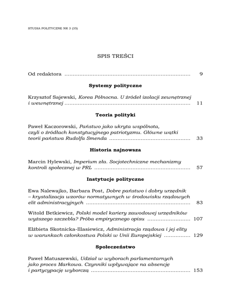 STUDIA POLITYCZNE NR 3 (35) SPIS TREŚCI Od redaktora ............................................................................ 9 Systemy polityczne Krzysztof Sajewski, Korea Północna. U źródeł izolacji zewnętrznej i wewnętrznej ............................................................................ 11 Teoria polityki Paweł Kaczorowski, Państwo jako ukryta wspólnota, czyli o źródłach konstytucyjnego patriotyzmu. Główne wątki teorii państwa Rudolfa Smenda ................................................. 33 Historia najnowsza Marcin Hylewski, Imperium zła. Socjotechniczne mechanizmy kontroli społecznej w PRL .......................................................... 57 Instytucje polityczne Ewa Nalewajko, Barbara Post, Dobre państwo i dobry urzędnik – krystalizacja wzorów normatywnych w środowisku rządowych elit administracyjnych ............................................................... 83 Witold Betkiewicz, Polski model kariery zawodowej urzędników wyższego szczebla? Próba empirycznego opisu .......................... 107 Elżbieta Skotnicka-Illasiewicz, Administracja rządowa i jej elity w warunkach członkostwa Polski w Unii Europejskiej ................ 129 Społeczeństwo Paweł Matuszewski, Udział w wyborach parlamentarnych jako proces Markowa. Czynniki wpływające na absencję i partycypację wyborczą ............................................................ 153 Artykuły recenzyjne, recenzje, omówienia Czy polityka może być dobra? Anna Siwek, Dobro a polityka. Platon i Tischner – dwie filozofie dobra (Paweł Kaczorowski) .. 175 Paweł Kołek, Polityka zagraniczna Holandii w latach 1945–2012 (Ryszard Żelichowski) ........................................................... 177 Noty o książkach Andres Kasekamp, Historia państw bałtyckich (Wojciech Roszkowski) ......................................................... 185 Anand Menon, Europa. Stan unii (Wojciech Roszkowski) ............ 186