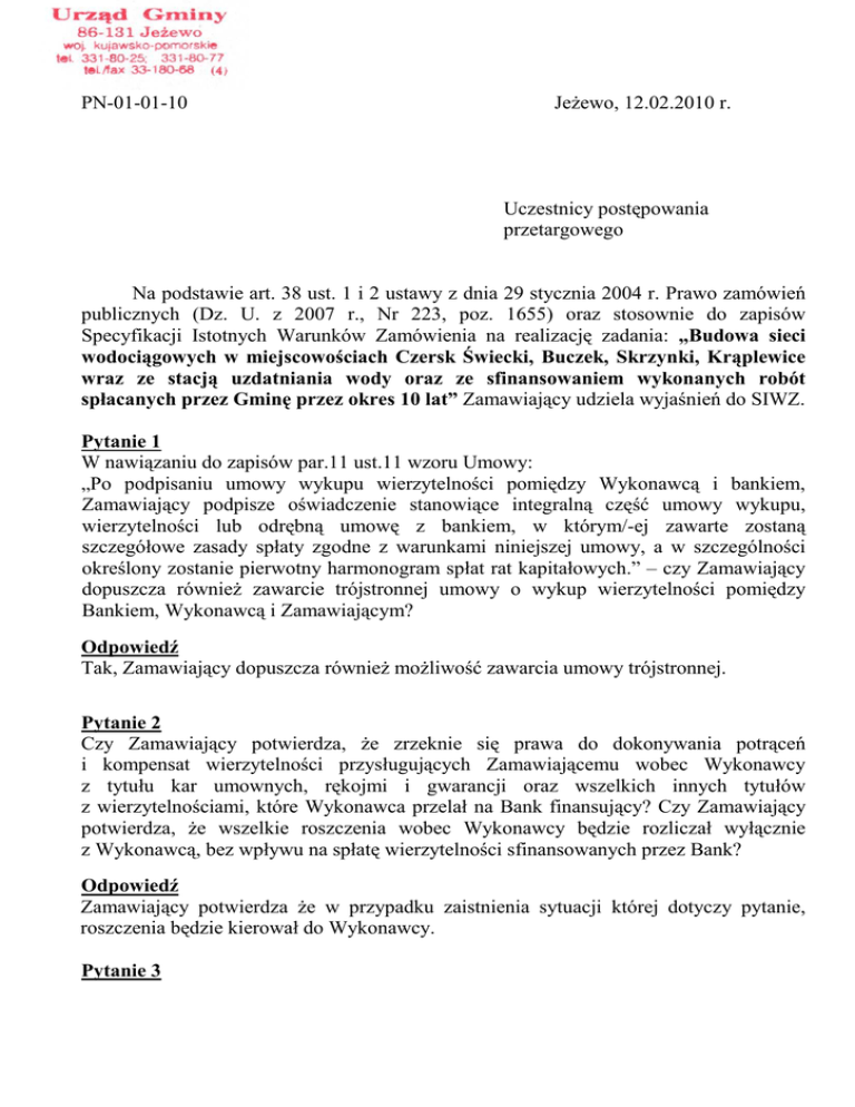PN-01-01-10 JeŜewo, 12.02.2010 r. Uczestnicy postępowania przetargowego Na podstawie art. 38 ust. 1 i 2 ustawy z dnia 29 stycznia 2004 r. Prawo zamówień publicznych (Dz. U. z 2007 r., Nr 223, poz. 1655) oraz stosownie do zapisów Specyfikacji Istotnych Warunków Zamówienia na realizację zadania: „Budowa sieci wodociągowych w miejscowościach Czersk Świecki, Buczek, Skrzynki, Krąplewice wraz ze stacją uzdatniania wody oraz ze sfinansowaniem wykonanych robót spłacanych przez Gminę przez okres 10 lat” Zamawiający udziela wyjaśnień do SIWZ. Pytanie 1 W nawiązaniu do zapisów par.11 ust.11 wzoru Umowy: „Po podpisaniu umowy wykupu wierzytelności pomiędzy Wykonawcą i bankiem, Zamawiający podpisze oświadczenie stanowiące integralną część umowy wykupu, wierzytelności lub odrębną umowę z bankiem, w którym/-ej zawarte zostaną szczegółowe zasady spłaty zgodne z warunkami niniejszej umowy, a w szczególności określony zostanie pierwotny harmonogram spłat rat kapitałowych.” – czy Zamawiający dopuszcza równieŜ zawarcie trójstronnej umowy o wykup wierzytelności pomiędzy Bankiem, Wykonawcą i Zamawiającym? Odpowiedź Tak, Zamawiający dopuszcza równieŜ moŜliwość zawarcia umowy trójstronnej. Pytanie 2 Czy Zamawiający potwierdza, Ŝe zrzeknie się prawa do dokonywania potrąceń i kompensat wierzytelności przysługujących Zamawiającemu wobec Wykonawcy z tytułu kar umownych, rękojmi i gwarancji oraz wszelkich innych tytułów z wierzytelnościami, które Wykonawca przelał na Bank finansujący? Czy Zamawiający potwierdza, Ŝe wszelkie roszczenia wobec Wykonawcy będzie rozliczał wyłącznie z Wykonawcą, bez wpływu na spłatę wierzytelności sfinansowanych przez Bank? Odpowiedź Zamawiający potwierdza Ŝe w przypadku zaistnienia sytuacji której dotyczy pytanie, roszczenia będzie kierował do Wykonawcy. Pytanie 3 W związku z zapisami par. 10 ust.6 wzoru Umowy, czy Zamawiający potwierdza, Ŝe brak potwierdzenia otrzymania przez podwykonawcę wynagrodzenia za wykonane przez niego uprzednio roboty, nie wpłynie na terminową spłatę przez Zamawiającego wierzytelności juŜ sfinansowanych przez Bank? Odpowiedź Wszelkie roszczenia wobec Wykonawcy będą rozliczane tylko z Wykonawcą i nie będą miały wpływu na spłatę wierzytelności. Pytanie 4 Zgodnie z warunkami SIWZ i wzoru Umowy, zabezpieczeniem finansowania będzie weksle własny in blanco oraz oświadczenie o poddaniu się egzekucji w trybie art. 97 ustawy Prawo bankowe. Czy Zamawiający potwierdza, Ŝe weksel własny in blanco, stanowiący zabezpieczenie finansowania, będzie opatrzony kontrasygnatą Skarbnika oraz będzie złoŜony w Banku wraz z deklaracją wekslową? Czy została podjęta uchwała w sprawie ustanowienia zabezpieczenia w formie weksla własnego in blanco? Odpowiedź Zamawiający potwierdza, Ŝe weksel in blanco będzie opatrzony kontrasygnata Skarbnika Gminy. Informujemy iŜ uchwała Nr XXXI/215/2009 Rady Gminy w JeŜewie z dnia 29 grudnia 2009 roku w sprawie zaciągnięcia zobowiązania na wykonanie inwestycji pn: „Budowa stacji uzdatniania wody w Czersku Świeckim, budowa sieci wodociągowej wraz z przyłączami w miejscowości Czersk Świecki, Krąplewice, Buczek, Skrzynki i sposobu jej finansowania „w § 7 precyzuje - „Prawnym zabezpieczeniem spłaty wierzytelności będzie weksel in blanco”. Jednocześnie Zamawiający potwierdza Ŝe osoby reprezentujące Gminę (Zamawiającego) złoŜą oświadczenie o poddaniu się egzekucji w trybie art. 97 ustawy Prawo bankowe. Pytanie 5 Czy Zamawiający potwierdza, Ŝe zapisy par. 11 ust. 16 wzoru Umowy, obowiązują jedynie w przypadku, gdy Zamawiający terminowo wywiązuje się ze zobowiązań wobec Banku z tytułu wierzytelności nabytych przez Bank? Odpowiedź Tak, Zamawiający potwierdza, Ŝe zasady określone tym zapisem będą dotyczyły tylko sytuacji terminowego wywiązywania się ze zobowiązań. Pytanie 6 Czy Zamawiający potwierdza, Ŝe raty kapitałowe oraz odsetki będą płatne w ostatnim dniu kalendarzowym kaŜdego kolejnego miesiąca lub w pierwszym dniu roboczym po tej dacie? Odpowiedź Tak, Zamawiający potwierdza zawarty w pytaniu sposób płatności. Pytanie 7 Czy Zamawiający dopuszcza, aby odsetki za finansowanie wierzytelności, naliczone od kwoty niespłaconego kapitału w danym miesiącu kalendarzowym, stawały się wymagalne na koniec tego miesiąca kalendarzowego (tj. na koniec miesiąca, w którym zostały naliczone) i były płatne przez Zamawiającego na koniec następnego miesiąca kalendarzowego np. odsetki za finansowanie w m-cu styczniu płatne do 28 lutego (lub kolejnego dnia roboczego)? Wówczas ostatnia rata kapitałowa byłaby płatna do dnia 31.08.2020 r., a ostatnia rata odsetkowa do dnia 30.09.2020 r. Odpowiedź Tak, Zamawiający dopuszcza takie rozwiązanie. Pytanie 8 W nawiązaniu do par. 9 ust. 1 wzoru Umowy, zwracamy uwagę Zamawiającemu, iŜ tak sformułowany zapis „Wykonawca otrzyma ryczałtowe wynagrodzenie w kwocie: ........................ zł (brutto), w tym: (…)” jest nieprawidłowy i sprzeczny z ust. 3. Kwota wynagrodzenia ryczałtowego określona w ust 1. nie powinna zawierać lit c) tj. przewidywanego całkowitego kosztu spłaty wykupionej wierzytelności na dzień złoŜenia oferty. Odpowiedź Zgodnie z uwagą Wykonawcy Zamawiający dokonuje zmiany zapisu poprzez wykreślenie z § 9 ust. 1 pkt. c. Dotychczasowy punkt oznaczony literą „d” otrzymuje oznaczenie „c” zachowując dotychczasowe brzmienie. Pytanie 9 W nawiązaniu do zapisów rozdz. 1 pkt. 6.6. SIWZ zwracamy uwagę Zamawiającemu, Ŝe w przypadku wystawienia i wykupu przez Bank jakiejkolwiek faktury przejściowej, odsetki od kapitału liczone od daty wypłaty przez Bank na rzecz Wykonawcy środków z pierwszej faktury przejściowej do terminu spłaty ostatniej raty kapitałowej, tj. 31.08.2020 r., będą naliczone za okres dłuŜszy niŜ 10 lat, powyŜszy zapis SIWZ jest wi