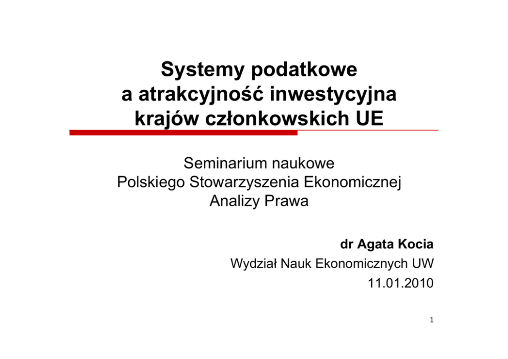 Systemy podatkowe a atrakcyjność inwestycyjna krajów członkowskich UE Seminarium naukowe Polskiego Stowarzyszenia Ekonomicznej Analizy Prawa dr Agata Kocia Wydział Nauk Ekonomicznych UW 11.01.2010 1 Cel pracy Badanie wpływu systemόw podatkowych na wzrost gospodarczy krajόw UE pokazanie że atrakcyjność inwestycyjna zależy od jakości i ilości instytucji podatkowych Publiczna debata w świetle rozszerzenia UE „Code of Business Conduct on Business Taxation” (1997) => ograniczenie konkurencji podatkowej, CIT pominięty Rezolucja Parlamentu Europejski (2005) => harmonizacja bazy podatkowej 2 Systemy podatkowe Unii Europejskiej – analiza porównawcza Spadek nominalnych stawek CIT we wszystkich 15 „starych” krajach UE W latach 1995-2005 stawki nominalne spadły w 11 z 15 krajów UE W badaniu przeprowadzonym przez Bank Światowy i PriceWaterHouseCoopers w roku 2006 przeanalizowano: liczbę podatków płaconych w ciągu roku liczbę godzin potrzebną do przygotowania dokumentów podatkowych podatek jako % dochodów 3 Systemy podatkowe Unii Europejskiej – analiza porównawcza cd. Systemy w UE są bardzo zrόżnicowane Najniższa stawka w Estonii (0%) Najwyższa na Malcie i w Hiszpanii (35%) Dodatkowe podatki m.in.: komunalne, lokalne, za członkowstwo w stowarzyszeniach, od zatrudnienia Ulgi podatkowe m.in.: dla małych i średnich przedsiębiorstw, za zainwestowanie zyskόw, za stworzenie rezerw finansowych 4 Badania – konkurencja instytucjonalna a lokalizacja przedsiębiorstw Grubert i Mutti (2000): 500 korporacji międzynarodowych Efektywne stawki podatkowe -> czynnik przyciągający inwestycje, od ich wielkości zależy ilość inwestowanego kapitału Benassy-Quere, Fontagne, Lahreche-Revil (2004): 11 krajów OECD, w latach 1984-2000 Stawka podatkowa wyższa od średniej może zagrażać wielkości inwestycji 5 Badania – konkurencja instytucjonalna a lokalizacja przedsiębiorstw cd. UNCTAD (2005): 140 krajów świata 70% krajów podjęło w ostatnim roku próbę polepszenia jakości instytucji; podatki reformowane były w największym stopniu Przedmiot badania: Irlandia – McGee (2004) niska stawka CIT - 12,5% - przyczyniła się do rozwoju gospodarczego Irlandii (więcej w studium przypadku) 6 Modele konkurencji podatkowej Tiebout (1956): dostosowuje wpływy budżetowe i dobra publiczne do potrzeb konsumentόw poprzez zmiany miejsca zamieszkania/produkcji Zodrow i Mieszkowski (1986): prowadzi do zbyt niskiego poziomu wpływόw niezbędnego do zapewnienia dόbr publicznych Brennan i Buchanan (1980): ogranicza zapęd państwa do opodatkowania 7 Modele konkurencji instytucjonalnej - D. North (1994, 2006) Instytucje to reguły gry, a organizacje działają w ich ramach dążąc do realizacji własnych celów 3 postulaty: zmiana instytucjonalna jako wynik interakcji instytucji i organizacji organizacje inwestują w zdobywanie wiedzy i umiejętności, by poprawić swoją pozycję konkurencyjną zmiana instytucjonalna jest zależna od ścieżki historycznej 8 Modele konkurencji instytucjonalnej - D. North (1994, 2006) cd. Zmiany instytucjonalne są następstwem działania: czynników egzogenicznych interakcji instytucji z organizacjami Gospodarka rozwija się gdy: istnieje presja konkurencyjna w środowisku zdecentralizowanych organizacji instytucje są efektywne istnieje wysoka efektywność adaptacyjna choć równie ważna jest efektywność alokacyjna Instytucje to niedoceniony element analizy ekonomicznej 9 Modele konkurencji instytucjonalnej - Siebert and Koop (1990) Założenia: alokacja rynkowa jest efektywna mechanizm cenowy prowadzi do efektywności ekonomicznej jednostki zachowują się racjonalnie Rząd, instytucje rządowe, organizacje kreują podaż Obywatele oraz firmy kreują popyt Dobro – instytucje podatkowe Konkurencja podatkowa jest pożądana ponieważ: ogranicza siłę lobbystów pozwala na adaptację najlepszych rozwiązań 10 Badania empiryczne w krajach OECD i EU Model Tiebout Aronson (1974) w 4 miastach Wielkiej Brytanii Rόżnica netto z obciażeń podatkowych a przychόdow z podatkόw w 62% - 89% wpłynęła na migracje między miastami Hipoteza Leviatan Oates (1972) w 57 krajach w latach 60-tych Potwierdził ujemną zależność między stopniem decentralizacji fiskalnej a rozmiarem sektora publicznego 11 Badania empiryczne w krajach OECD i EU cd. Thieβen (2003) Prόba: 21 krajach rozwiniętych w latach 19731998 oraz 26 krajach w latach 1981- 1995 Rezultat: 10% wzrost decentralizacji wydatków powoduje 0,12%-0,15% wzrost PKB na głowę mieszkańca Copenhagen Economics Group (2004) Rezultat: harmonizacja nieznacznie zwiększyła PKB, lecz znacznie zmniejszyła wpływy do budżetu 12 Model ekonometryczny Funkcja produkcji Cobba-Douglasa q = f(l, k, h, d) dane panelowe 18 krajów UE (Belgia, Czechy, Dania, Niemcy, Hiszpania, Francja, Irlandia, Włochy, Litwa, Łotwa, Holandia, Austria, Polska, Portugalia, Słowacja, Finlandia, Szwecja, Wielka Brytania) dane roczne z okresu 1998-2004 panel zbilansowany 13 Opis zmiennych qp: PKB mln euro na osobę d_capital: rόżnica między stawką CIT kraju a uśrednioną stawką państw sąsiednich d_labour: rόżnica między stawką obciążeń społecznych kraju a uśrednioną stawką państw sąsiednich la: zatrudnienie * wydatki na R&D 14 Opis zmiennych cd. h_grad: absolwenci szkόł wyższych k: kapitał stały w mln euro contr_er: obciążenia społeczne pracodawcόw w mln euro contr_es: obciążenia społeczne pracownikόw w mln euro Rόwnanie: lnqpit = β0dit + β1ln(lit*ait) + β2lnhit + β3lnkit + β4iit +εit 15 Wyniki badania ln_qp Coefficient Std. Error t statistic P>|t| d_capital .0031516 .0013731 2.30 d_labour .0038813 .0041508 0.94 ln_la .1773757 .0579093 3.06 *** 0.003 ln_h_grad .2336374 .0414687 5.63 *** 0.000 ln_k .2269642 .0695377 3.26 *** 0.002 ln_contr_er .0809703 .0452306 1.79 * 0.077 ln_contr_es .0926049 .02678 3.46 *** 0.001 _cons -13.77159 .4487645 ** 0.024 0.353 -30.69 0.000 F(7,8