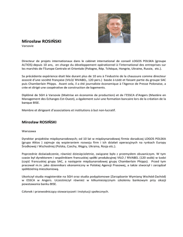 Mirosław ROSIŃSKI Varsovie Directeur de projets internationaux dans le cabinet international de conseil LOGOS POLSKA (groupe ALTIOS) depuis 10 ans, en charge du développement opérationnel à l’international des entreprises sur les marchés de l’Europe Centrale et Orientale (Pologne, Rép. Tchèque, Hongrie, Ukraine, Russie, etc.). Sa précédente expérience était liée durant plus de 10 ans à l’industrie de la chaussure comme directeur associé d’une société française (VILO/ RIVABEL, 120 pers.) basée à Łódż et faisant partie du groupe SAC puis Chamberlain Phipps. Avant cela, il a été journaliste économique à l’Agence de Presse Polonaise, a crée et dirigé une coopérative de construction de logements. Diplômé de SGH à Varsovie (Maitrise en économie de production) et de l’ESSCA d’Angers (Mastère en Management des Echanges Est-Ouest), a également suivi une formation bancaire lors de la création de la banque BISE. Membre et dirigeant d’associations et institutions à but non-lucratif. Mirosław ROSIŃSKI Warszawa Dyrektor projektów międzynarodowych; od 10 lat w międzynarodowej firmie doradczej LOGOS POLSKA (grupa Altios ) zajmuje się wspieraniem rozwoju firm i ich działań operacyjnych na rynkach Europy Środkowej i Wschodniej (Polska, Czechy, Węgry, Ukraina, Rosja etc.). Poprzednie doświadczenie, również dziesięcioletnie, związane było z przemysłem obuwniczym. W tym czasie był dyrektorem i wspólnikiem francuskiej spółki produkcyjnej VILO / RIVABEL (120 osób) w Łodzi (część francuskiej grupy SAC, a następnie międzynarodowej grupy Chamberlain Phipps). Przed tym pracował m.in. jako dziennikarz ekonomiczny w Polskiej Agencji Prasowej, a także stworzył i zarządzał spółdzielnią mieszkaniową. Ukończył studia magisterskie na SGH oraz studia podyplomowe (Zarządzanie Wymianą Wschód-Zachód) w ESSCA w Angers. Uczestniczył również w kilkumiesięcznym szkoleniu bankowym przy okazji powstawania banku BISE. Członek i przewodniczący stowarzyszeń i instytucji społecznych.