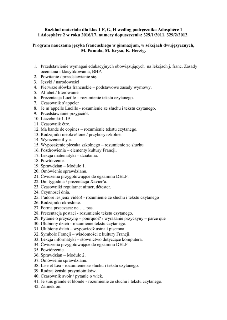 Rozkład materiału dla klas 1 F, G, H według podręcznika Adosphère 1 i Adosphère 2 w roku 2016/17, numery dopuszczenia: 329/1/2011, 329/2/2012. Program nauczania języka francuskiego w gimnazjum, w sekcjach dwujęzycznych, M. Pamuła, M. Krysa, K. Herzig. 1. Przedstawienie wymagań edukacyjnych obowiązujących na lekcjach j. franc. Zasady oceniania i klasyfikowania, BHP. 2. Powitanie / przedstawianie się. 3. Języki / narodowości 4. Pierwsze słówka francuskie – podstawowe zasady wymowy. 5. Alfabet / literowanie 6. Prezentacja Lucille – rozumienie tekstu czytanego. 7. Czasownik s’appeler 8. Je m’appelle Lucille - rozumienie ze słuchu i tekstu czytanego. 9. Przedstawianie przyjaciół. 10. Liczebniki:1-19 11. Czasownik être. 12. Ma bande de copines – rozumienie tekstu czytanego. 13. Rodzajniki nieokreślone / przybory szkolne. 14. Wyrażenie il y a. 15. Wyposażenie plecaka szkolnego – rozumienie ze słuchu. 16. Pozdrowienia – elementy kultury Francji. 17. Lekcja matematyki – działania. 18. Powtórzenie. 19. Sprawdzian – Module 1. 20. Omówienie sprawdzianu. 21. Ćwiczenia przygotowujące do egzaminu DELF. 22. Dni tygodnia / prezentacja Xavier’a. 23. Czasowniki regularne: aimer, détester. 24. Czynności dnia. 25. J’adore les jeux vidéo! - rozumienie ze słuchu i tekstu czytanego 26. Rodzajniki określone. 27. Forma przecząca: ne …. pas. 28. Prezentacja postaci - rozumienie tekstu czytanego. 29. Pytanie o przyczynę – pourquoi? / wyrażanie przyczyny – parce que 30. Ulubiony dzień - rozumienie tekstu czytanego. 31. Ulubiony dzień – wypowiedź ustna i pisemna. 32. Symbole Francji – wiadomości z kultury Francji. 33. Lekcja informatyki – słownictwo dotyczące komputera. 34. Ćwiczenia przygotowujące do egzaminu DELF 35. Powtórzenie. 36. Sprawdzian – Module 2. 37. Omówienie sprawdzianu. 38. Lise et Léa - rozumienie ze słuchu i tekstu czytanego. 39. Rodzaj żeński przymiotników. 40. Czasownik avoir / pytanie o wiek. 41. Je suis grande et blonde - rozumienie ze słuchu i tekstu czytanego. 42. Zaimek on. 43. Liczba mnoga przymiotników. 44. Opis wyglądu zewnętrznego. 45. Kolory. 46. Ubrania – słownictwo. 47. Opis ubrań. 48. Słynni malarze francuscy – wiadomości z kultury Francji. 49. Lekcja plastyki – słownictwo. 50. Ćwiczenia przygotowujące do egzaminu DELF. 51. Powtórzenie. 52. Sprawdzian – Module 3. 53. Omówienie sprawdzianu. 54. Cyfry – 20 – 1000 55. Loïc – rozumienie ze słuchu i tekstu czytanego. Czasowniki faire i jouer. 56. Kolędy francuskie. 57. Dyscypliny sportowe. 58. Tu fais du sport? - rozumienie ze słuchu i tekstu czytanego. 59. Części ciała. 60. Przymiotniki dzierżawcze. 61. Le sport, c’est bon pour le corps! - rozumienie ze słuchu i tekstu czytanego. Przyimek pour. 62. Kolędy francuskie. 63. Pytania typu: co? / czy? – qu’est-ce que …? / est-ce que …? 64. Cyfry – ćwiczenia. Kolędy francuskie. 65. Les Jeux paralympiques - rozumienie ze słuchu i tekstu czytanego 66. Le Tour de France - wiadomości z kultury Francji. 67. Lekcja wychowania fizycznego – słownictwo. 68. Kolędy francuskie. 69. Ćwiczenia przygotowujące do egzaminu DELF. Powtórzenie 70. Kolędy francuskie. 71. Sprawdzian – Module 4. 72. Omówienie sprawdzianu. 73. Kolędy francuskie. 74. Zaimki toniczne. 75. Wskazywanie drogi. 76. C’est où, chez toi? - rozumienie ze słuchu i tekstu czytanego. 77. Rodzajniki określone i nieokreślone. 78. Przyimki – sytuowanie w przestrzeni. 79. Mon quartier - rozumienie ze słuchu i tekstu czytanego. 80. Pytania typu: gdzie?, co?, kiedy? Środki transportu. 81. Kolędy francuskie. 82. Le jeu du code de la route - rozumienie tekstu czytanego. 83. Ważne miejsca w Paryżu - wiadomości z kultury Francji. 84. Kolędy francuskie. 85. Ćwiczenia przygotowujące do egzaminu DELF. 86. Powtórzenie. 87. Sprawdzian – Module 5. 88. Omówienie sprawdzianu. 89. Oscar - rozumienie ze słuchu i tekstu czytanego. 90. Czasownik venir. 91. Określanie godziny. 92. Określanie godziny – c.d. 93. Venez faire la fête! - rozumienie ze słuchu i tekstu czytanego. 94. Czasowniki zwrotne – codzienne czynności. 95. Przymiotniki wskazujące / określanie pory dnia. 96. Une journée spéciale - rozumienie tekstu czytanego. 97. Tryb rozkazujący. 98. Miesiące. 99. Cinq conseils pour organiser une fête – organizacja urodzin / imienin – rady . 100. Organizacja urodzin / imienin – rady – rozumienie ze słuchu i tekstu czytanego – c.d. 101. Święta we Francji - wiadomości z kultury Francji. 102. Lekcja muzyki – instrumenty muzyczne. 103. Ćwiczenia przygotowujące do egzaminu DELF. 104. Powtórzenie. 105. Sprawdzian – Module 6. 106. Omówienie sprawdzianu. 107. Alice - rozumienie ze słuchu i tekstu czytanego. 108. Rodzina – słownictwo. 109. Rozmowa telefoniczna – używane zwroty. 110. Comment va ta famille? - rozumienie ze słuchu i tekstu czytanego. 111. Czasownik aller / przyimki: au, en, aux, à 112. Mon journal de voyage - rozumienie ze słuchu i tekstu czytanego. 113. Państwa. 114. Przyimki – sytuowanie w przestrzeni – c.d. 115. Opis państwa / miasta. 116. Venez au Sénégal - rozumienie ze słuchu i tekstu czytanego. 117. Międzynarodowy Dzień Frankofonii - wiadomości z kultury Francji. 118. Quiz na temat frankofonii - rozumienie tekstu czytanego. 119. Lekcja geografii – słownictwo. 120. Ćwiczenia przygotowujące do egzaminu DELF. 121. Powtórzenie. 122. Sprawdzian – Module 7. 123. Omówienie sprawdzianu. 124. Samuel - rozumienie ze słuchu i tekstu czytanego. 125. Futur proche. 126. Notre camp de vacances - rozumienie ze słuchu i tekstu czytanego. 127. Wypowiedź ustna i pisemna na temat wakacji. 128. Wyrażanie życzenia – je voudrais … 129. Zwierzęta – słownictwo. 130. Mon club nature - rozumienie tekstu czytanego. 131. Przymiotniki pytające: quel?, quelle?, quels?, quelles? 132. Opisy zwierząt - rozumienie tekstu czytanego. 133. Zw