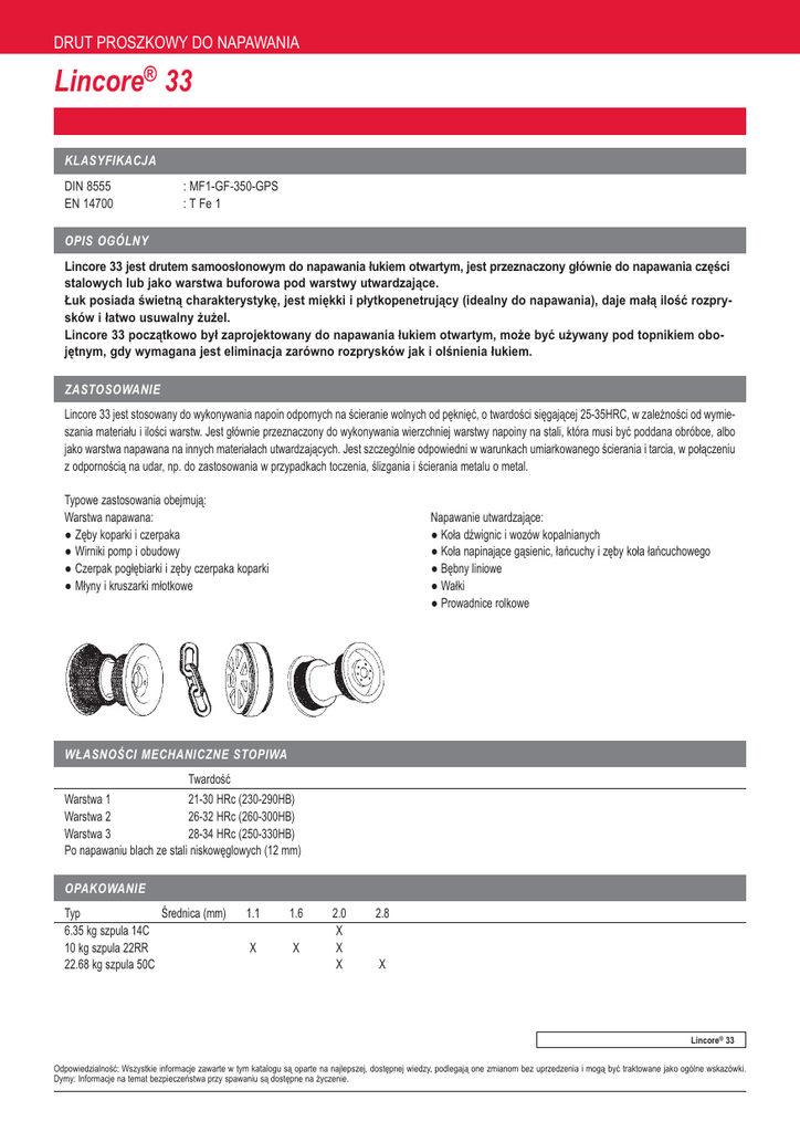 DRUT PROSZKOWY DO NAPAWANIA Lincore® 33 KLASYFIKACJA DIN 8555 EN 14700 : MF1-GF-350-GPS : T Fe 1 OPIS OGÓLNY Lincore 33 jest drutem samoosłonowym do napawania łukiem otwartym, jest przeznaczony głównie do napawania części stalowych lub jako warstwa buforowa pod warstwy utwardzające. Łuk posiada świetną charakterystykę, jest miękki i płytkopenetrujący (idealny do napawania), daje małą ilość rozprysków i łatwo usuwalny żużel. Lincore 33 początkowo był zaprojektowany do napawania łukiem otwartym, może być używany pod topnikiem obojętnym, gdy wymagana jest eliminacja zarówno rozprysków jak i olśnienia łukiem. ZASTOSOWANIE Lincore 33 jest stosowany do wykonywania napoin odpornych na ścieranie wolnych od pęknięć, o twardości sięgającej 25-35HRC, w zależności od wymieszania materiału i ilości warstw. Jest głównie przeznaczony do wykonywania wierzchniej warstwy napoiny na stali, która musi być poddana obróbce, albo jako warstwa napawana na innych materiałach utwardzających. Jest szczególnie odpowiedni w warunkach umiarkowanego ścierania i tarcia, w połączeniu z odpornością na udar, np. do zastosowania w przypadkach toczenia, ślizgania i ścierania metalu o metal. Typowe zastosowania obejmują: Warstwa napawana: ● Zęby koparki i czerpaka ● Wirniki pomp i obudowy ● Czerpak pogłębiarki i zęby czerpaka koparki ● Młyny i kruszarki młotkowe F C AW Napawanie utwardzające: ● Koła dźwignic i wozów kopalnianych ● Koła napinające gąsienic, łańcuchy i zęby koła łańcuchowego ● Bębny liniowe ● Wałki ● Prowadnice rolkowe WŁASNOŚCI MECHANICZNE STOPIWA Twardość Warstwa 1 21-30 HRc (230-290HB) Warstwa 2 26-32 HRc (260-300HB) Warstwa 3 28-34 HRc (250-330HB) Po napawaniu blach ze stali niskowęglowych (12 mm) OPAKOWANIE Typ Średnica (mm) 6.35 kg szpula 14C 10 kg szpula 22RR 22.68 kg szpula 50C 1.1 1.6 X X 2.0 X X X 2.8 X Lincore® 33 570 Odpowiedzialność: Wszystkie informacje zawarte w tym katalogu są oparte na najlepszej, dostępnej wiedzy, podlegają one zmianom bez uprzedzenia i mogą być traktowane jako ogólne wskazówki. Dymy: Informacje na temat bezpieczeństwa przy spawaniu są dostępne na życzenie. DRUT PROSZKOWY DO NAPAWANIA Lincore® 33 INFORMACJE DODATKOWE Warstwy materiału utwardzone przez zgniot powinny być usunięte przed zastosowaniem Lincore 33, celem zapobieżenia kruchości i pękaniu Obróbka cieplna przed i po spawaniu nie jest konieczna dla stali C/Mn, jednak podgrzanie wstępne do 260ºC może być niezbędne dla stali wysokowęglowych albo elementów o złożonych kształtach lub usztywnionych. Napoina może być obrabiana na właściwy wymiar przy użyciu narzędzi z węglików spiekanych lub z zastosowaniem dużych szybkości obróbki Nie ma ograniczenia grubości napoiny wykonanej tym drutem POZYCJE SPAWANIA RODZAJ PRĄDU DC + ISO/ASME PA/1G TYPOWY SKŁAD CHEMICZNY STOPIWA (W %) C 0.15 Mn 2.0 Si 0.7 Cr 2.0 Al 1.6 F C AW STRUKTURA Po spawaniu mikrostruktura składa się głównie z mieszaniny ferrytu i bainitu DANE DO KALKULACJI Średnica (mm) Szybkość podawania drutu (m/min) Prąd (A) Napięcie łuku (V) Uzysk stopiwa (kg/h) Wydajność (%) 1.1 1.6 2.0 5.1 do 12.7 3.8 do 8.9 3.2 do 6.4 80-150 125-225 200-325 25-31 26-32 23-29 1.5-3.9 2.1-5.0 3.1-6.1 80-85 79-84 87-86 PRODUKTY ALTERNATYWNE Produktem alternatywnym jest Wearshield® BU30 571 www.lincolnelectric.eu