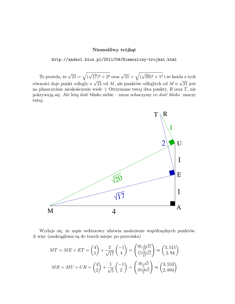 Niemożliwy trójkąt http://andsol.blox.pl/2011/04/Niemozliwy-trojkat.html √ q√ q√ √ ( 17)2 + 22 oraz 21 = ( 20)2 + 12 i że każda z tych √ √ równości daje punkt odległy o 21 od M , ale punktów odległych od M o 21 jest na płaszczyźnie nieskończenie wiele :) Otrzymane tutaj dwa punkty, R oraz T , nie pokrywają się. Ale leżą dość blisko siebie – zaraz zobaczymy co dość blisko znaczy tutaj. To prawda, że 21 = T R 1 2 U 1 20 17 M 4 Ε 1 A Wydaje się, że zapis wektorowy ułatwia znalezienie współrzędnych punktów. A więc (zaokrąglenia są do trzech miejsc po przecinku) √ ! 68−2 17 2 4 −1 3, 515 17√ ≈ M T = M E + ET = +√ = 17+8 17 2, 94 1 17 4 17 √ ! 20− 5 1 −1 4 3, 553 5√ MR = MU + UR = +√ = 10+2 ≈ 5 2 2, 894 5 2 5 Odległość |RT | wynosi w przybliżeniu 0,059 – jeśli jednostka to centymetr, można łatwo zrobić na wykresie błąd rzędu 0,6 milimetra. A ile wynosi rzeczywista długość boku |ER|? Znane ze szkoły twierdzenie cosinusów odpowiada na to pytanie. T R U α E √ 5 Z trójkąta 4M AU mającego przyprostokątne 4 i 2 widać, że cos α = , więc 5 √ √ 2 5 π −2 5 sin α = i stąd cos( + α) = − sin α = , więc twierdzenie cosinusów daje 5 2 5 √ 10 + 4 5 |ER| = 1 + 1 − 2 · 1 · 1 · (− sin α) = ; 5 2 2 2 |ER| ≈ 1, 946 . Nieduża różnica, ale troszkę brakuje tu do liczby 2. Morał. Zaprawdę, dziwne trójkąty napotkasz jeśli grafit twój będzie gruby, a cyrkiel chiński. 2