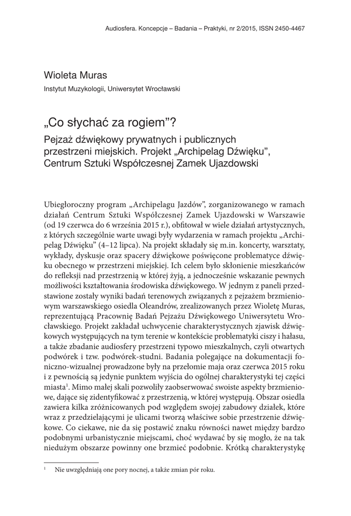 Audiosfera. Koncepcje – Badania – Praktyki, nr 2/2015, ISSN 2450-4467 Wioleta Muras Instytut Muzykologii, Uniwersytet Wrocławski „Co słychać za rogiem”? Pejzaż dźwiękowy prywatnych i publicznych przestrzeni miejskich. Projekt „Archipelag Dźwięku”, Centrum Sztuki Współczesnej Zamek Ujazdowski Ubiegłoroczny program „Archipelagu Jazdów”, zorganizowanego w ramach działań Centrum Sztuki Współczesnej Zamek Ujazdowski w Warszawie (od 19 czerwca do 6 września 2015 r.), obfitował w wiele działań artystycznych, z których szczególnie warte uwagi były wydarzenia w ramach projektu „Archipelag Dźwięku” (4–12 lipca). Na projekt składały się m.in. koncerty, warsztaty, wykłady, dyskusje oraz spacery dźwiękowe poświęcone problematyce dźwięku obecnego w przestrzeni miejskiej. Ich celem było skłonienie mieszkańców do refleksji nad przestrzenią w której żyją, a jednocześnie wskazanie pewnych możliwości kształtowania środowiska dźwiękowego. W jednym z paneli przedstawione zostały wyniki badań terenowych związanych z pejzażem brzmieniowym warszawskiego osiedla Oleandrów, zrealizowanych przez Wioletę Muras, reprezentującą Pracownię Badań Pejzażu Dźwiękowego Uniwersytetu Wrocławskiego. Projekt zakładał uchwycenie charakterystycznych zjawisk dźwiękowych występujących na tym terenie w kontekście problematyki ciszy i hałasu, a także zbadanie audiosfery przestrzeni typowo mieszkalnych, czyli otwartych podwórek i tzw. podwórek-studni. Badania polegające na dokumentacji foniczno-wizualnej prowadzone były na przełomie maja oraz czerwca 2015 roku i z pewnością są jedynie punktem wyjścia do ogólnej charakterystyki tej części miasta1. Mimo małej skali pozwoliły zaobserwować swoiste aspekty brzmieniowe, dające się zidentyfikować z przestrzenią, w której występują. Obszar osiedla zawiera kilka zróżnicowanych pod względem swojej zabudowy działek, które wraz z przedzielającymi je ulicami tworzą właściwe sobie przestrzenie dźwiękowe. Co ciekawe, nie da się postawić znaku równości nawet między bardzo podobnymi urbanistycznie miejscami, choć wydawać by się mogło, że na tak niedużym obszarze powinny one brzmieć podobnie. Krótką charakterystykę 1 Nie uwzględniają one pory nocnej, a także zmian pór roku. 103 Wioleta Muras rozpoczniemy od podwórek otwartych, z których badaniami objęte były cztery: 1) między Aleją Armii Ludowej a ul. Oleandrów, 2) między ul. Marszałkowską a ul. Polną, 3) Skwer Mieczysława Fogga oraz 4) podwórko przy ul. Marszałkowskiej 10/16. Najbardziej różnicującym je zjawiskiem okazało się natężenie szumu komunikacyjnego. Niewątpliwie najbardziej niekorzystnie pod tym względem wypada podwórko nr 1, w którym niemal bez przerwy słychać szum dochodzący z pobliskiej wielopasmowej alei Armii Ludowej. Szum ten jest w zasadzie ciągły i bardzo intensywny dynamicznie, co powoduje, że nawet w tej osłoniętej wysokimi blokami przestrzeni trudno uznać miejsce to za przyjemne brzmieniowo. Audiosfera tego obszaru jest ponadto zdominowana przez dodatkowe szumy w postaci pracy zewnętrznych wentylatorów oraz warkot silników samochodowych. Niemal cały obszar podwórka (nie licząc niedużego skweru z drzewami) służy mieszkańcom jako parking samochodowy, w którym rotacja pojazdów jest dość częsta. Nieco odmiennie prezentuje się przestrzeń dźwiękowa podwórka nr 2. Choć jest ono zabudowane wokół kilkupiętrowymi kamienicami, ciągłość tę przerywają dwa otwarte wjazdy (od ul. Marszałkowskiej i ul. Polnej), a także mniejsze bramy wjazdowe poszczególnych kamienic. Podwórko to jest zdecydowanie bardziej zadrzewione, stąd słychać w nim szum liści oraz liczne odgłosy ptaków (głównie gołębi, kruków, wróbli). W północnej jego części znajduje się plac przeznaczony dla spotkań mieszkańców, co wpływa na sferę dźwiękową tej przestrzeni. Niemal każdego dnia i o każdej porze na podwórku można spotkać mieszkańców przesiadujących na ławeczkach, sporadycznie natomiast pojawiają się osoby ćwiczące na otwartej siłowni. Ze względu na odgłosy komunikacyjne, od poprzedniego podwórka różni je przede wszystkim fakt, iż docierają tu dość intensywnie odgłosy tramwajów. Szum samochodowy jest oczywiście obecny, lecz w mniejszym natężeniu, mimo że dociera z dwóch stron: od ulic Marszałkowskiej i Polnej. Do typowych dla tej przestrzeni odgłosów należą niegłośne trzaski otwieranych i zamykanych szlabanów, które słychać w zasadzie tylko z bliskiej odległości. Spośród podwórek otwartych za najbardziej komfortowe dźwiękowo uznać można podwórko przy ul. T. Boya-Żeleńskiego, będące właściwie małym parkiem. Obszar ten wypełniony jest różnego rodzaju drzewami, przedzielony kilkoma alejkami wzdłuż których umieszczone zostały ławeczki. Tamtejsza audiosfera zdominowana jest przez odgłosy różnych gatunków ptaków, których śpiewy wyróżniają to miejsce i tworzą specyficzny mikroklimat dźwiękowy. Przyjemną aurę zapewnia też nieduży ruch samochodowy z ul. T. Boya-Żeleńskiego. I choć wzdłuż budynków również znajdują się ciągi parkingów samochodowych, ruch pojazdów jest niewielki (zapewne intensywniejszy w porach wyjazdów i powrotów z pracy). Co dosyć zaskakujące, mimo tak przyjemnej aury dźwiękowej aktywność mieszkańców jest tutaj bardzo mała. Najczęściej pojawiają się w tej przestrzeni właściciele wyprowadzający psy na spacer, znacznie rzadziej osoby z dziećmi. 104 „Co słychać za rogiem”? Projekt „Archipelag Dźwięku” Odgłosy rozmów są raczej typowe dla pory wieczornej, przy okazji spotkań kilkuosobowych grup młodzieży lub dorosłych. Ostatnie z badanych podwórek otwartych (nr 4) przestrzennie prezentuje się zdecydowanie niekorzystnie. W zasadzie nie przypomina podwórka, lecz alejki parkingowe dla samochodów, „wciś