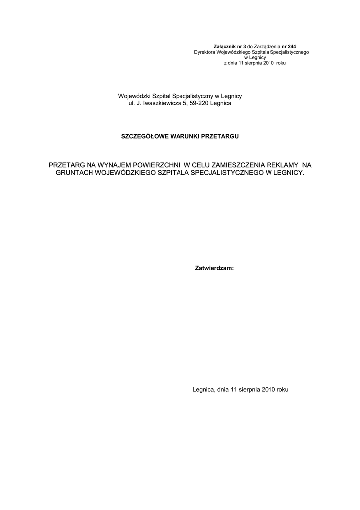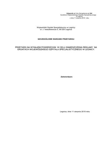 Załącznik nr 3 do Zarządzenia nr 244 Dyrektora Wojewódzkiego Szpitala Specjalistycznego w Legnicy z dnia 11 sierpnia 2010 roku Wojewódzki Szpital Specjalistyczny w Legnicy ul. J. Iwaszkiewicza 5, 59-220 Legnica SZCZEGÓŁOWE WARUNKI PRZETARGU PRZETARG NA WYNAJEM POWIERZCHNI W CELU ZAMIESZCZENIA REKLAMY NA GRUNTACH WOJEWÓDZKIEGO SZPITALA SPECJALISTYCZNEGO W LEGNICY. Zatwierdzam: Legnica, dnia 11 sierpnia 2010 roku W przetargu mogą brać udział osoby fizyczne i prawne oraz jednostki organizacyjne nie posiadające osobowości prawnej, które złożą ofertę spełniającą warunki zawarte w ogłoszeniu oraz w szczegółowych warunkach przetargu oraz wpłacą organizatorowi przetargu wadium w terminie i miejscu wyznaczonym w ogłoszeniu przetargu oraz szczegółowych warunkach przetargu. I. PRZEDMIOT PRZETARGU 1. Przedmiotem przetargu jest wynajem powierzchni w celu zamieszczenia reklamy na gruntach Wojewódzkiego Szpitala Specjalistycznego w Legnicy. 2. Reklama nie może zawierać treści obraźliwych, propagować szkodliwe zachowania społeczne (palenie tytoniu, spożywanie alkoholu, narkotyki, przemoc, agresja, itp.), nie może również promować działalności konkurencyjnej względem Szpitala, ani naruszać innych powszechnie obowiązujących przepisów prawa w zakresie reklamy, w szczególności przepisów ustawy Prawo Farmaceutyczne z dnia 6 września 2001 roku (tekst jednolity Dz.U.Nr 45, poz. 271 z dnia 17 marca 2008 r. z późniejszymi zamianami) i aktów wykonawczych. 3. Organizator przetargu ustala cenę wywoławczą minimalną – 6,00 zł netto za 1 m2 wynajmowanej powierzchni. 4. Powierzchnia przeznaczona pod wynajem znajduje się na gruntach należących do Wojewódzkiego Szpitala Specjalistycznego w Legnicy przy ul. Iwaszkiewicza oraz ul. Wrocławskiej wg mapki sytuacyjnej stanowiącej załącznik do szczegółowych warunków przetargu, tj. a) pas zieleni przy ul. Iwaszkiewicza o długości 160 mb wymiar reklamy dowolny, b) pas zieleni przy ul. Iwaszkiewicza o długości 19,5 mb wymiar reklamy 150 cm x 300 cm, c) pas zieleni przy ul. Wrocławskiej o długości 150 mb wymiar reklamy dowolny d) pas zieleni przy ul. Wrocławskiej o długości 135 mb wymiar reklamy dowolny 5. Wynajmujący dopuszcza możliwość składania ofert częściowych. 6. Najemca przed zamontowaniem reklamy zobowiązany jest do przeprowadzenia właściwych procedur wynikających z prawa budowlanego. II. PRZYGOTOWANIE OFERTY Oferent ma prawo złożyć tylko jedną ofertę. Ofertę należy sporządzić w języku polskim zgodnie ze szczegółowymi warunkami przetargu, w formie maszynopisu lub druku i uzupełnić wymaganymi załącznikami. Oferta musi być podpisana przy imiennych pieczątkach osób upoważnionych do reprezentowania oferenta wymienionych w rejestrze handlowym lub innym odpowiednim dokumencie, upoważniającym do reprezentowania. Kompletna oferta, łącznie z załącznikami, powinna mieć ponumerowane i parafowane strony. Wszystkie strony oferty muszą być spięte /zszyte/ we właściwej kolejności w sposób zapobiegający dekompletacji oferty. Wszelkie poprawki lub zmiany w tekście muszą być parafowane i datowane własnoręcznie przez osobę podpisującą ofertę. Oferty należy składać w nieprzejrzystych, zamkniętych kopertach lub opakowaniach. Koperta powinna być opatrzona napisem: WOJEWÓDZKI SZPITAL SPECJALISTYCZNY W LEGNICY PRZETARG NA WYNAJEM POWIERZCHNI W CELU ZAMIESZCZENIA REKLAMY NA GRUNTACH WOJEWÓDZKIEGO SZPITALA SPECJALISTYCZNEGO W LEGNICY. - NIE OTWIERAĆ PRZED DNIEM 6 WRZEŚNIA 2010 ROKU Oferenci ponoszą wszelkie koszty związane z przygotowaniem i złożeniem oferty. III. DOKUMENTY WYMAGANE OD OFERENTÓW: Oferta powinna zawierać: a) proponowaną stawkę czynszu, b) określenie rozmiarów reklamy łącznie z powierzchnią przeznaczoną na jej montaż oraz treść reklamy, c) aktualny odpis z właściwego rejestru lub zaświadczenie o wpisie do ewidencji działalności gospodarczej wystawiony nie później niż 3 m -ce, przed terminem składania ofert (dotyczy wyłącznie osób prowadzących działalność gospodarczą), d) kopię dowodu wniesienia wadium. Uwagi Dokumenty, o którym mowa w pkt c -d mogą być przedstawione w formie oryginałów albo kserokopii poświadczonej za zgodność z oryginałem przez oferenta. IV. KRYTERIA OCENY Proponowana miesięczna wartość czynszu – 100 % tj: − proponowana miesięczna stawka czynszu za 1 m2 /netto/ - 100 % W przypadku złożenia ofert z taką samą ofertą cenową, Wynajmujący dodatkowo zarządzi składanie ofert dodatkowych. V. TERMIN OBOWIĄZYWANIA UMOWY 1. Umowa najmu zostanie zawarta na czas nieokreślony, z możliwością jej rozwiązania z trzymiesięcznym okresem wypowiedzenia przez każdą ze stron lub na zasadzie porozumienia stron. 2. W przypadku naruszeń postanowień umowy lub zalegania z płatnością czynszu za dwa miesiące, umowa może być rozwiązana przez Wynajmującego w trybie natychmiastowym bez okresu wypowiedzenia. VI. ISTOTNE DLA WYNAJMUJĄCEGO POSTANOWIENIA, KTÓRE ZOSTANĄ WPROWADZONE DO UMOWY Najemca zobowiązany jest do : a) użytkowania wynajmowanej powierzchni zgodnie z jej przeznaczeniem określonym w § 1, b) ponoszenia kosztów dostarczanych mediów według zasad i kwot ustalonych w umowie najmu, c) przeprowadzania na własny koszt montażu oraz demontażu reklamy, d) utrzymania miejsca reklamowego w należytym stanie technicznym i estetycznym, e) usuwania szkód powstałych z jego winy, f) wpłacania czynszu miesięcznego płatnego z góry za miesiąc, powiększonego o obowiązującą stawkę podatku VAT w terminie 14 dni od daty wystawienia faktury za dany miesiąc (płatne z góry). Czynsz będzie waloryzowany przez Wynajmującego raz w roku o średnioroczny wskaźnik wzrostu cen, towarów i usług konsumpcyjnych ogółem. g) po zakończeniu obowiązywania niniejszej umowy Najemca obowiązany jest zwrócić wynajmowaną powierzchnię w stanie nie pogorszonym poza stopień