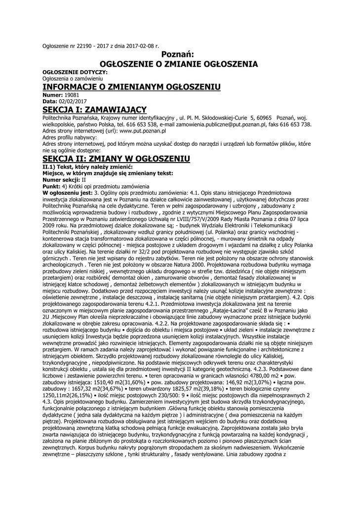 Ogłoszenie nr 22190 - 2017 z dnia 2017-02-08 r. Poznań: OGŁOSZENIE O ZMIANIE OGŁOSZENIA OGŁOSZENIE DOTYCZY: Ogłoszenia o zamówieniu INFORMACJE O ZMIENIANYM OGŁOSZENIU Numer: 19081 Data: 02/02/2017 SEKCJA I: ZAMAWIAJĄCY Politechnika Poznańska, Krajowy numer identyfikacyjny , ul. Pl. M. Skłodowskiej-Curie 5, 60965 Poznań, woj. wielkopolskie, państwo Polska, tel. 616 653 538, e-mail [email protected], faks 616 653 738. Adres strony internetowej (url): www.put.poznan.pl Adres profilu nabywcy: Adres strony internetowej, pod którym można uzyskać dostęp do narzędzi i urządzeń lub formatów plików, które nie są ogólnie dostępne: SEKCJA II: ZMIANY W OGŁOSZENIU II.1) Tekst, który należy zmienić: Miejsce, w którym znajduje się zmieniany tekst: Numer sekcji: II Punkt: 4) Krótki opi przedmiotu zamówienia W ogłoszeniu jest: 3. Ogólny opis przedmiotu zamówienia: 4.1. Opis stanu istniejącego Przedmiotowa inwestycja zlokalizowana jest w Poznaniu na działce całkowicie zainwestowanej , użytkowanej dotychczas przez Politechnikę Poznańską na cele dydaktyczne. Teren w pełni zagospodarowany i uzbrojony , zabudowany z możliwością wprowadzenia budowy i rozbudowy , zgodnie z wytycznymi Miejscowego Planu Zagospodarowania Przestrzennego w Poznaniu zatwierdzonego Uchwałą nr LVIII/757/V/2009 Rady Miasta Poznania z dnia 07 lipca 2009 roku. Na przedmiotowej działce zlokalizowane są; - budynek Wydziału Elektroniki i Telekomunikacji Politechniki Poznańskiej , zlokalizowany wzdłuż granicy południowej (ul. Polanka) oraz granicy wschodniej kontenerowa stacja transformatorowa zlokalizowana w części północnej, - murowany śmietnik na odpady zlokalizowany w części północnej - miejsca postojowe z układem drogowym i wjazdami na działkę z ulicy Polanka oraz ulicy Kaliskiej. Na terenie działki nr 32/2 pod projektowana rozbudowę nie występuje zjawisko szkód górniczych . Teren nie jest wpisany do rejestru zabytków. Teren nie jest położony na obszarze ochrony stanowisk archeologicznych . Teren nie jest położony w obszarze Natura 2000. Projektowana rozbudowa budynku wymaga przebudowy zieleni niskiej , wewnętrznego układu drogowego w strefie tzw. dziedzińca ( nie objęte niniejszym przetargiem) oraz rozbiórek( demontaż okien , zamurowanie otworów , demontaż fasady zlokalizowanej w istniejącej klatce schodowej , demontaż żelbetowych elementów ) zlokalizowanych w istniejącym budynku w miejscu rozbudowy. Dodatkowo przed rozpoczęciem inwestycji należy usunąć kolizje instalacyjne zewnętrzne : oświetlenie zewnętrzne , instalacje deszczową , instalację sanitarną (nie objęte niniejszym przetargiem). 4.2. Opis projektowanego zagospodarowania terenu 4.2.1. Przedmiotowa inwestycja zlokalizowana jest na terenie oznaczonym w miejscowym planie zagospodarowania przestrzennego ,,Rataje-Łacina” cześć B w Poznaniu jako 2U .Miejscowy Plan określa nieprzekraczalne i obowiązujące linie zabudowy wyznaczone przez istniejące budynki zlokalizowane w obrębie zakresu opracowania. 4.2.2. Na projektowane zagospodarowanie składa się : • rozbudowa istniejącego budynku • dojścia do obiektu i miejsca postojowe • układ zieleni • instalacje zewnętrzne z usunięciem kolizji Inwestycja będzie poprzedzona usunięciem kolizji instalacyjnych. Wszystkie instalacje wewnętrzne prowadzić jako rozwinięcie istniejących. Elementy zagospodarowania działki nie są objęte niniejszym przetargiem. W ramach zadania należy zaprojektować i wykonać powiązanie funkcjonalne i architektoniczne z istniejącym obiektem. Skrzydło projektowanej rozbudowy zlokalizowane równolegle do ulicy Kaliskiej, trzykondygnacyjne , niepodpiwniczone. Na podstawie miejscowych odkrywek terenu oraz charakterystyki konstrukcji obiektu , ustala się dla przedmiotowej inwestycji II kategorię geotechniczną. 4.2.3. Podstawowe dane liczbowe i zestawienie powierzchni terenu. • teren opracowania w granicach własności 4780,00 m2 • pow. zabudowy istniejąca: 1510,40 m2(31,60%) • pow. zabudowy projektowana: 146,92 m2(3,07%) • łączna pow. zabudowy : 1657,32 m2(34,67%) • teren utwardzony 1825,57 m2(39,18%) • teren biologicznie czynny 1250,11m2(26,15%) • ilość miejsc postojowych 230/500: 9 • ilość miejsc postojowych dla niepełnosprawnych 2 4.3. Opis projektowanego budynku. Zamierzeniem inwestycyjnym jest budowa skrzydła trzykondygnacyjnego, funkcjonalnie połączonego z istniejącym budynkiem .Główną funkcję obiektu stanowią pomieszczenia dydaktyczne ( jedna sala dydaktyczna na każdym piętrze ) i administracyjne ( dwa pomieszczenia na każdym piętrze). Projektowana rozbudowa obsługiwana jest istniejącym wejściem do budynku oraz dodatkową projektowaną zewnętrzną klatką schodową pełniącą funkcje ewakuacyjną. Zaprojektowana została jako bryła zwarta nawiązująca do istniejącego budynku, trzykondygnacyjna z funkcją powtarzalną na każdej kondygnacji , założona na planie zbliżonym do prostokąta o rozczłonkowanych poziomo i pionowo płaszczyznach ścian zewnętrznych. Korpus budynku nakryty pogrążonym stropodachem za skośnym nadwieszeniem. Wykończenie zewnętrzne – płaszczyzny szklone , tynki strukturalny , fasady wentylowane. Linia zabudowy zgodna z miejscowym planem zagospodarowania terenu . Podział fasady nawiązuje do podziału w istniejącym budynku. 4.4. BILANS POWIERZCHNI PROJEKTOWANEGO OBIEKTU symbol nazwa pomieszczenia powierzchnia ilość osób POZIOM ± 0,00 0/0.1 KOMUNIKACJA 15,39 0/0.2 POM.BIUROWE 17,54 3 0/0.3 POM.BIUROWE 15,91 3 0/0.4 SALA DYDATKTYCZNA 70.65 60 PRZYZIEMIE -POWIERZCHNIA UŻYTKOWA 119.49 POZIOM +4,00 1/0.1 KOMUNIKACJA 15,60 1/0.2 POM.BIUROWE 17,54 3 1/0.3 POM.BIUROWE 15,91 3 1/0.4 SALA DYDAKTYCZNA 70,65 60 PIĘTRO I -POWIERZCHNIA UŻYTKOWA 119,70 POZIOM +8,00 2/0.1 KOMUNIKACJA 17,87 2/0.2 POM.BIUROWE 20,29 3 2/0.3 POM.BIUROWE 15,91 3 2/0.4 SALA DYDAKTYCZNA 70,65 60 PIĘTRO IIPOWIERZCHNIA UŻYTKOWA 124,72