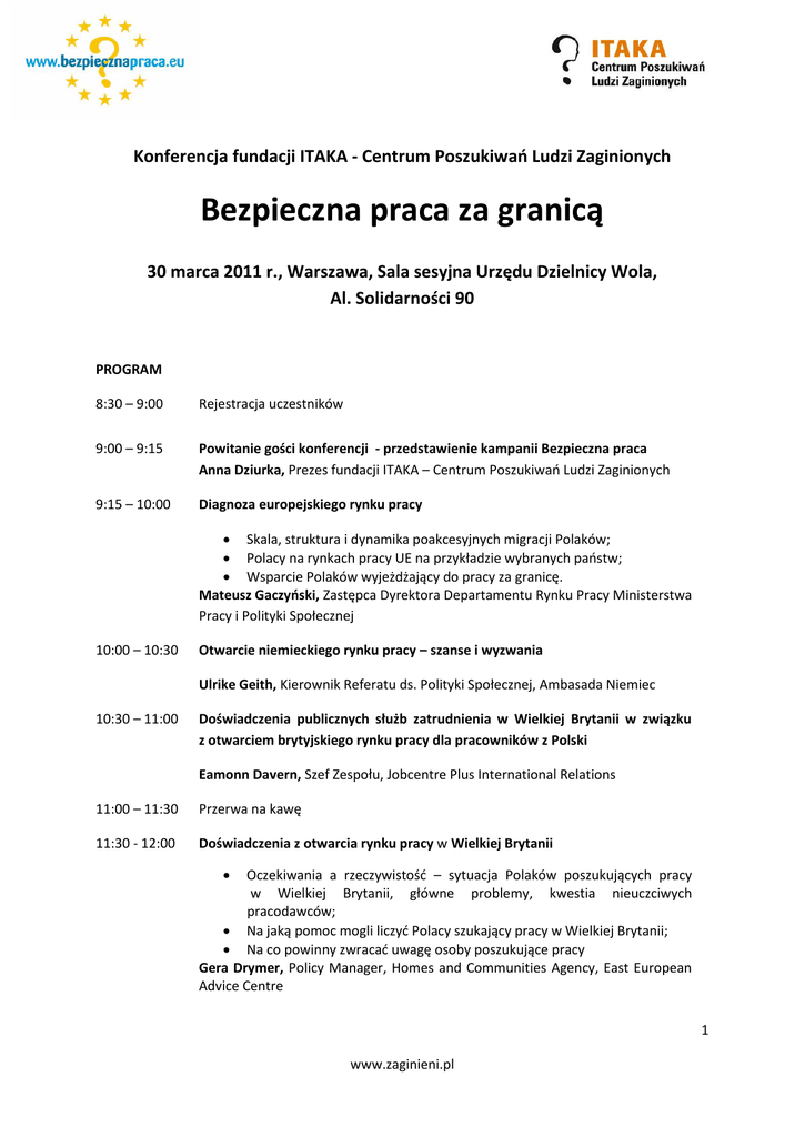 Konferencja fundacji ITAKA - Centrum Poszukiwao Ludzi Zaginionych Bezpieczna praca za granicą 30 marca 2011 r., Warszawa, Sala sesyjna Urzędu Dzielnicy Wola, Al. Solidarności 90 PROGRAM 8:30 – 9:00 Rejestracja uczestników 9:00 – 9:15 Powitanie gości konferencji - przedstawienie kampanii Bezpieczna praca Anna Dziurka, Prezes fundacji ITAKA – Centrum Poszukiwao Ludzi Zaginionych 9:15 – 10:00 Diagnoza europejskiego rynku pracy Skala, struktura i dynamika poakcesyjnych migracji Polaków; Polacy na rynkach pracy UE na przykładzie wybranych paostw; Wsparcie Polaków wyjeżdżający do pracy za granicę. Mateusz Gaczyoski, Zastępca Dyrektora Departamentu Rynku Pracy Ministerstwa Pracy i Polityki Społecznej 10:00 – 10:30 Otwarcie niemieckiego rynku pracy – szanse i wyzwania Ulrike Geith, Kierownik Referatu ds. Polityki Społecznej, Ambasada Niemiec 10:30 – 11:00 Doświadczenia publicznych służb zatrudnienia w Wielkiej Brytanii w związku z otwarciem brytyjskiego rynku pracy dla pracowników z Polski Eamonn Davern, Szef Zespołu, Jobcentre Plus International Relations 11:00 – 11:30 Przerwa na kawę 11:30 - 12:00 Doświadczenia z otwarcia rynku pracy w Wielkiej Brytanii Oczekiwania a rzeczywistośd – sytuacja Polaków poszukujących pracy w Wielkiej Brytanii, główne problemy, kwestia nieuczciwych pracodawców; Na jaką pomoc mogli liczyd Polacy szukający pracy w Wielkiej Brytanii; Na co powinny zwracad uwagę osoby poszukujące pracy Gera Drymer, Policy Manager, Homes and Communities Agency, East European Advice Centre 1 www.zaginieni.pl 12:00 – 12:45 Zaginięcia Polaków za granicą jako konsekwencja nieprzygotowanego wyjazdu do pracy Problem zaginięd zagranicznych – skala zjawiska; Zaginięcia w poszczególnych krajach UE; Handel ludźmi, niewolnicza praca– możliwe zagrożenia podczas zagranicznych wyjazdów do pracy. Aleksandra Andruszczak, Zastępca Dyrektora Zespołu Poszukiwao i Identyfikacji, ITAKA – Centrum Poszukiwao Ludzi Zaginionych 12:45 – 13:30 Przerwa na obiad 13:30 – 14:15 Warunki zatrudnienia w wybranych krajach UE Ogólne warunki zatrudnienia w Wielkiej Brytanii, Niemczech oraz Holandii; Oczekiwania finansowe a realne płace w wybranych krajach UE; Na jaką pracę mogą liczyd pracownicy z Polski? Jak weryfikowad zagraniczne oferty pracy, co powinno wzbudzad nasze podejrzenia? W jaki sposób można sprawdzid potencjalnego pracodawcę? Pan Guido Vreuls, Członek Zarządu Polskiego Forum HR 14:15 – 15:00 Zagrożenia związane z wyborem niesprawdzonej oferty pracy Najczęściej spotykane zagrożenia związane z wyjazdem do pracy za granicę; Historie osób, które padły ofiarą nieuczciwych pracodawców; Gdzie szukad pomocy w przypadku zagrożeo Marek Wyszkowski, Nadkomisarz, Radca Centralnego Zespołu Handlu Ludźmi, Centralne Biuro Śledcze Komendy Głównej Policji 15:00-15:30 Pytania uczestników i podsumowanie konferencji Honorowy patronat Partner Patronat medialny 2 www.zaginieni.pl