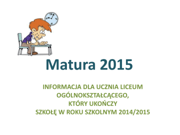 Matura 2015 INFORMACJA DLA UCZNIA LICEUM OGÓLNOKSZTAŁCĄCEGO, KTÓRY UKOŃCZY SZKOŁĘ W ROKU SZKOLNYM 2014/2015 TERMINARZ Egzamin maturalny jest przeprowadzany jeden raz w ciągu roku szkolnego – w okresie od maja do września – zgodnie z harmonogramem ogłoszonym przez dyrektora CKE na stronie internetowej www.cke.edu.pl WAŻNE TERMINY • 30 września - termin składania przez ucznia do dyrektora szkoły deklaracji wstępnych • 30 września - termin składania dokumentacji uprawniającej do dostosowania warunków i form egzaminu maturalnego do potrzeb absolwentów ze specjalnymi potrzebami edukacyjnymi • 7 lutego termin nanoszenia zmian w deklaracjach – (deklaracja ostateczna), weryfikacja danych w deklaracjach, możliwość uzupełnienia dokumentacji uprawniającej do dostosowania warunków egzaminu maturalnego • 4 marca ogłoszenie harmonogramu egzaminów ustnych • 4 marca ogłoszenie informacji o dodatkowych materiałach pomocniczych na egzaminach • 20 kwietnia termin złożenia dyrektorowi szkoły wniosku o zmianę wyboru przedmiotu lub poziomu egzaminu w przypadku gdy absolwent uzyskał tytuł laureata lub finalisty z innego przedmiotu niż wskazany w deklaracji • 24 kwietnia zakończenie roku szkolnego w klasach maturalnych • 4 maja rozpoczęcie sesji egzaminacyjnej (egzamin pisemny z języka polskiego) wg harmonogramu ustalonego przez dyrektora CKE • 4 – 29 maja część ustna egzaminu maturalnego z języków obcych nowożytnych, języka łemkowskiego, języka kaszubskiego – przeprowadzana wg harmonogramów ustalanych w szkołach • 11 – 23 maja część ustna egzaminu maturalnego z języka polskiego, języka ukraińskiego • 1 – 17 czerwca egzamin maturalny w terminie dodatkowym • 30 czerwca rozdanie świadectw dojrzałości • do 7 lipca złożenie do dyrektora szkoły pisemnego oświadczenia o przystąpieniu do egzaminu poprawkowego • do 10 sierpnia informacja na stronie internetowej OKE o miejscu przeprowadzenia egzaminów poprawkowych • 25 sierpnia pisemny egzamin poprawkowy • 24 – 28 sierpnia ustny egzamin poprawkowy • 11 września rozdanie świadectw dojrzałości po sesji poprawkowej Absolwent, przystępując do egzaminu maturalnego, zdaje obowiązkowo: • w części ustnej – egzaminy, dla których nie określa się poziomu, z następujących przedmiotów: • język polski • język obcy nowożytny wybrany spośród języków: angielskiego, francuskiego, hiszpańskiego, niemieckiego, rosyjskiego i włoskiego Absolwent, przystępując do egzaminu maturalnego, zdaje obowiązkowo: • w części pisemnej – egzaminy na poziomie podstawowym z następujących przedmiotów: • język polski • matematyka • język obcy nowożytny (ten sam, który zdaje w części ustnej) Absolwent, przystępując do egzaminu maturalnego, zdaje obowiązkowo: • w części pisemnej – jeden egzamin z przedmiotu dodatkowego na poziomie rozszerzonym lub – w przypadku języka obcego nowożytnego – na poziomie rozszerzonym albo dwujęzycznym. Wyboru dokonuje spośród następujących przedmiotów: • • • • • • • • • biologia chemia filozofia fizyka geografia historia historia muzyki historia sztuki informatyka • język łaciński i kultura antyczna • język obcy nowożytny (wybór spośród następujących języków: angielski, francuski, hiszpański, niemiecki, rosyjski, włoski) • język polski • matematyka • wiedza o społeczeństwie • Uczeń może ponadto przystąpić w danym roku do egzaminu maturalnego z nie więcej niż pięciu kolejnych przedmiotów dodatkowych wybranych spośród pozostałych przedmiotów dodatkowych wymienionych wcześniej na poziomie rozszerzonym (lub dwujęzycznym) • Egzamin maturalny z języka obcego nowożytnego jako przedmiotu dodatkowego, może być zdawany tylko w części pisemnej albo w części pisemnej i w części ustnej z tego samego języka. POLSKI – 30% USTNA J.OBCY – 30% OBOWIĄZKOWO PODSTAWOWA: POLSKI – 30% MATEMATYKA – 30% PISEMNA DODATKOWO: DO 5 WYBRANYCH PRZEDMIOTÓW NA POZIOMIE ROZSZERZONYM – bez poziomu zaliczenia J.OBCY – 30% ROZSZERZONA/DWUJĘZYCZNA: 1 WYBRANY PRZEDMIOT – bez poziomu zaliczenia Absolwent, który z wszystkich przedmiotów obowiązkowych uzyska co najmniej 30% pkt. i przystąpi do przynajmniej jednego przedmiotu dodatkowego, otrzyma świadectwo dojrzałości. • Wyniki z egzaminów dodatkowych oraz zdawanych w języku obcym będącym drugim językiem nauczania nie mają wpływu na uzyskanie świadectwa. Sesja poprawkowa Absolwent, który nie zda wyłącznie jednego egzaminu obowiązkowego w części ustnej albo pisemnej, może przystąpić do niego ponownie w sesji poprawkowej w sierpniu. Prawo to nie dotyczy osób nieobecnych na egzaminie lub tych, którym unieważniono egzamin. Absolwent, który nie przystąpił do egzaminu z co najmniej jednego przedmiotu dodatkowego w części pisemnej albo któremu ten egzamin unieważniono, może przystąpić ponownie do egzaminu z przedmiotu dodatkowego w kolejnych sesjach przez okres 5 lat od pierwszego egzaminu maturalnego, licząc od października roku, w którym przystąpił po raz pierwszy, zgodnie z aktualnie obowiązującymi przepisami. Absolwent, który nie zda więcej niż jednego egzaminu obowiązkowego, może przystąpić do tych egzaminów w kolejnej sesji na zasadach obowiązujących w roku 2015. Jeśli absolwent nie zda egzaminu z języka obcego, może w kolejnej sesji zadeklarować inny język obcy niż język, który zdawał poprzednio. Absolwent, o którym mowa, może przystąpić do podwyższania wyników uzyskanych poprzednio w części obowiązkowej lub części dodatkowej zgodnie z przepisami obowiązującymi w roku, w którym przystępował do egzaminu po raz pierwszy. Może również wybrać nowe przedmioty dodatkowe, zdawane zgodnie z przepisami obowiązującymi w roku, w którym ponownie przystępuje do egzaminu. Absolwent, który otrzyma świadectwo, może w kol