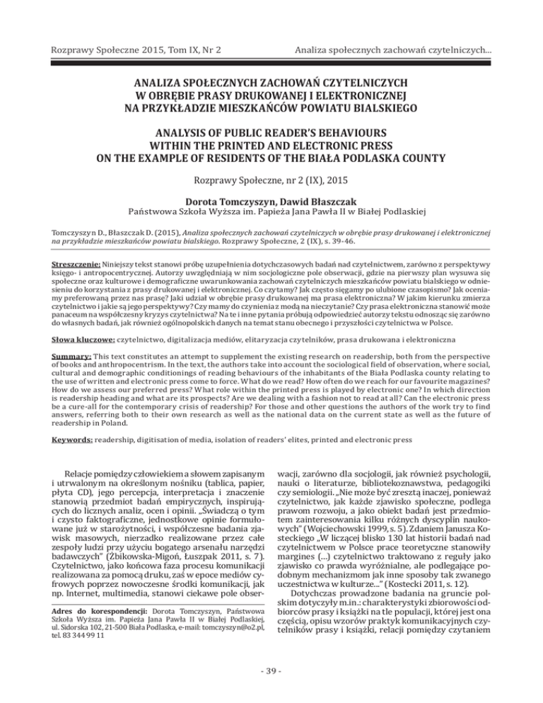 Rozprawy Społeczne 2015, Tom IX, Nr 2 Analiza społecznych zachowań czytelniczych... ANALIZA SPOŁECZNYCH ZACHOWAŃ CZYTELNICZYCH W OBRĘBIE PRASY DRUKOWANEJ I ELEKTRONICZNEJ NA PRZYKŁADZIE MIESZKAŃCÓW POWIATU BIALSKIEGO ANALYSIS OF PUBLIC READER’S BEHAVIOURS WITHIN THE PRINTED AND ELECTRONIC PRESS ON THE EXAMPLE OF RESIDENTS OF THE BIAŁA PODLASKA COUNTY Rozprawy Społeczne, nr 2 (IX), 2015 Dorota Tomczyszyn, Dawid Błaszczak Państwowa Szkoła Wyższa im. Papieża Jana Pawła II w Białej Podlaskiej Tomczyszyn D., Błaszczak D. (2015), Analiza społecznych zachowań czytelniczych w obrębie prasy drukowanej i elektronicznej na przykładzie mieszkańców powiatu bialskiego. Rozprawy Społeczne, 2 (IX), s. 39-46. Streszczenie: Niniejszy tekst stanowi próbę uzupełnienia dotychczasowych badań nad czytelnictwem, zarówno z perspektywy księgo- i antropocentrycznej. Autorzy uwzględniają w nim socjologiczne pole obserwacji, gdzie na pierwszy plan wysuwa się społeczne oraz kulturowe i demogra iczne uwarunkowania zachowań czytelniczych mieszkańców powiatu bialskiego w odniesieniu do korzystania z prasy drukowanej i elektronicznej. Co czytamy? Jak często sięgamy po ulubione czasopismo? Jak oceniamy preferowaną przez nas prasę? Jaki udział w obrębie prasy drukowanej ma prasa elektroniczna? W jakim kierunku zmierza czytelnictwo i jakie są jego perspektywy? Czy mamy do czynienia z modą na nieczytanie? Czy prasa elektroniczna stanowić może panaceum na współczesny kryzys czytelnictwa? Na te i inne pytania próbują odpowiedzieć autorzy tekstu odnosząc się zarówno do własnych badań, jak również ogólnopolskich danych na temat stanu obecnego i przyszłości czytelnictwa w Polsce. Słowa kluczowe: czytelnictwo, digitalizacja mediów, elitaryzacja czytelników, prasa drukowana i elektroniczna Summary: This text constitutes an attempt to supplement the existing research on readership, both from the perspective of books and anthropocentrism. In the text, the authors take into account the sociological ield of observation, where social, cultural and demographic conditionings of reading behaviours of the inhabitants of the Biała Podlaska county relating to the use of written and electronic press come to force. What do we read? How often do we reach for our favourite magazines? How do we assess our preferred press? What role within the printed press is played by electronic one? In which direction is readership heading and what are its prospects? Are we dealing with a fashion not to read at all? Can the electronic press be a cure-all for the contemporary crisis of readership? For those and other questions the authors of the work try to ind answers, referring both to their own research as well as the national data on the current state as well as the future of readership in Poland. Keywords: readership, digitisation of media, isolation of readers’ elites, printed and electronic press Relacje pomiędzy człowiekiem a słowem zapisanym i utrwalonym na określonym nośniku (tablica, papier, płyta CD), jego percepcja, interpretacja i znaczenie stanowią przedmiot badań empirycznych, inspirujących do licznych analiz, ocen i opinii. „Świadczą o tym i czysto faktogra iczne, jednostkowe opinie formułowane już w starożytności, i współczesne badania zjawisk masowych, nierzadko realizowane przez całe zespoły ludzi przy użyciu bogatego arsenału narzędzi badawczych” (Żbikowska-Migoń, Łuszpak 2011, s. 7). Czytelnictwo, jako końcowa faza procesu komunikacji realizowana za pomocą druku, zaś w epoce mediów cyfrowych poprzez nowoczesne środki komunikacji, jak np. Internet, multimedia, stanowi ciekawe pole obserAdres do korespondencji: Dorota Tomczyszyn, Państwowa Szkoła Wyższa im. Papieża Jana Pawła II w Białej Podlaskiej, ul. Sidorska 102, 21-500 Biała Podlaska, e-mail: [email protected], tel. 83 344 99 11 wacji, zarówno dla socjologii, jak również psychologii, nauki o literaturze, bibliotekoznawstwa, pedagogiki czy semiologii. „Nie może być zresztą inaczej, ponieważ czytelnictwo, jak każde zjawisko społeczne, podlega prawom rozwoju, a jako obiekt badań jest przedmiotem zainteresowania kilku różnych dyscyplin naukowych” (Wojciechowski 1999, s. 5). Zdaniem Janusza Kosteckiego „W liczącej blisko 130 lat historii badań nad czytelnictwem w Polsce prace teoretyczne stanowiły margines (…) czytelnictwo traktowano z reguły jako zjawisko co prawda wyróżnialne, ale podlegające podobnym mechanizmom jak inne sposoby tak zwanego uczestnictwa w kulturze...” (Kostecki 2011, s. 12). Dotychczas prowadzone badania na gruncie polskim dotyczyły m.in.: charakterystyki zbiorowości odbiorców prasy i książki na tle populacji, której jest ona częścią, opisu wzorów praktyk komunikacyjnych czytelników prasy i książki, relacji pomiędzy czytaniem - 39 - Rozprawy Społeczne 2015, Tom IX, Nr 2 Analiza społecznych zachowań czytelniczych... a innymi formami aktywności społecznej. Przedmiotem badań jest również odbiór tekstów poprzez dwa uzupełniające się i nakładające na siebie procesy tj. rozumienia i wartościowania. „Wartościując, odbiorca dokonuje zabiegów selekcji, hierarchizacji i oceny rozpoznanych znaczeń-wartości…” (Kostecki 2011, s. 20). Historia badań nad czytelnictwem swoimi początkami sięga drugiej połowy XIX wieku, kiedy W USA w latach siedemdziesiątych, na łamach „Library Journal”, pojawiły się wyniki badań dotyczących preferencji czytelniczych młodzieży amerykańskiej. Dekadę później badania w zakresie psycho izycznego procesu czytania opublikował E. Java, zaś w 1882 roku niemiecki nauczyciel H. Wolgast rozpoczął analizy w zakresie pedagogiki czytelnictwa. Na gruncie polskim badania nad czytelnictwem rozpoczęto u schyłku XIX wieku, między innymi na łamach „Przeglądu Pedagogicznego”. Z upływem czasu analizy tego typu zaczęły prowadzić biblioteki, ankietując swoich czyte