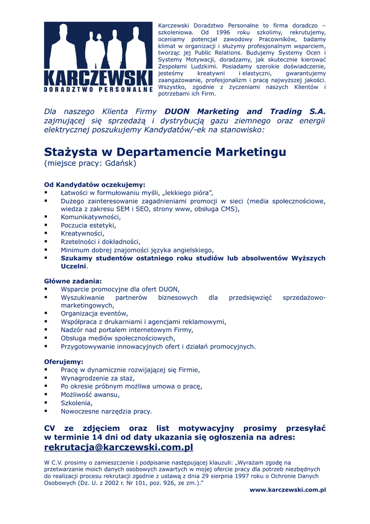 Karczewski Doradztwo Personalne to firma doradczo – szkoleniowa. Od 1996 roku szkolimy, rekrutujemy, oceniamy potencjał zawodowy Pracowników, badamy klimat w organizacji i służymy profesjonalnym wsparciem, tworząc jej Public Relations. Budujemy Systemy Ocen i Systemy Motywacji, doradzamy, jak skutecznie kierować Zespołami Ludzkimi. Posiadamy szerokie doświadczenie, jesteśmy kreatywni i elastyczni, gwarantujemy zaangażowanie, profesjonalizm i pracę najwyższej jakości. Wszystko, zgodnie z życzeniami naszych Klientów i potrzebami ich Firm. Dla naszego Klienta Firmy DUON Marketing and Trading S.A. zajmującej się sprzedażą i dystrybucją gazu ziemnego oraz energii elektrycznej poszukujemy Kandydatów/-ek na stanowisko: Stażysta w Departamencie Marketingu (miejsce pracy: Gdańsk) Od Kandydatów oczekujemy:  Łatwości w formułowaniu myśli, „lekkiego pióra”,  Dużego zainteresowanie zagadnieniami promocji w sieci (media społecznościowe, wiedza z zakresu SEM i SEO, strony www, obsługa CMS),  Komunikatywności,  Poczucia estetyki,  Kreatywności,  Rzetelności i dokładności,  Minimum dobrej znajomości języka angielskiego,  Szukamy studentów ostatniego roku studiów lub absolwentów Wyższych Uczelni. Główne zadania:  Wsparcie promocyjne dla ofert DUON,  Wyszukiwanie partnerów biznesowych dla przedsięwzięć marketingowych,  Organizacja eventów,  Współpraca z drukarniami i agencjami reklamowymi,  Nadzór nad portalem internetowym Firmy,  Obsługa mediów społecznościowych,  Przygotowywanie innowacyjnych ofert i działań promocyjnych. sprzedażowo- Oferujemy:  Pracę w dynamicznie rozwijającej się Firmie,  Wynagrodzenie za staż,  Po okresie próbnym możliwa umowa o pracę,  Możliwość awansu,  Szkolenia,  Nowoczesne narzędzia pracy. CV ze zdjęciem oraz list motywacyjny prosimy przesyłać w terminie 14 dni od daty ukazania się ogłoszenia na adres: [email protected] W C.V. prosimy o zamieszczenie i podpisanie następującej klauzuli: „Wyrażam zgodę na przetwarzanie moich danych osobowych zawartych w mojej ofercie pracy dla potrzeb niezbędnych do realizacji procesu rekrutacji zgodnie z ustawą z dnia 29 sierpnia 1997 roku o Ochronie Danych Osobowych (Dz. U. z 2002 r. Nr 101, poz. 926, ze zm.).” www.karczewski.com.pl