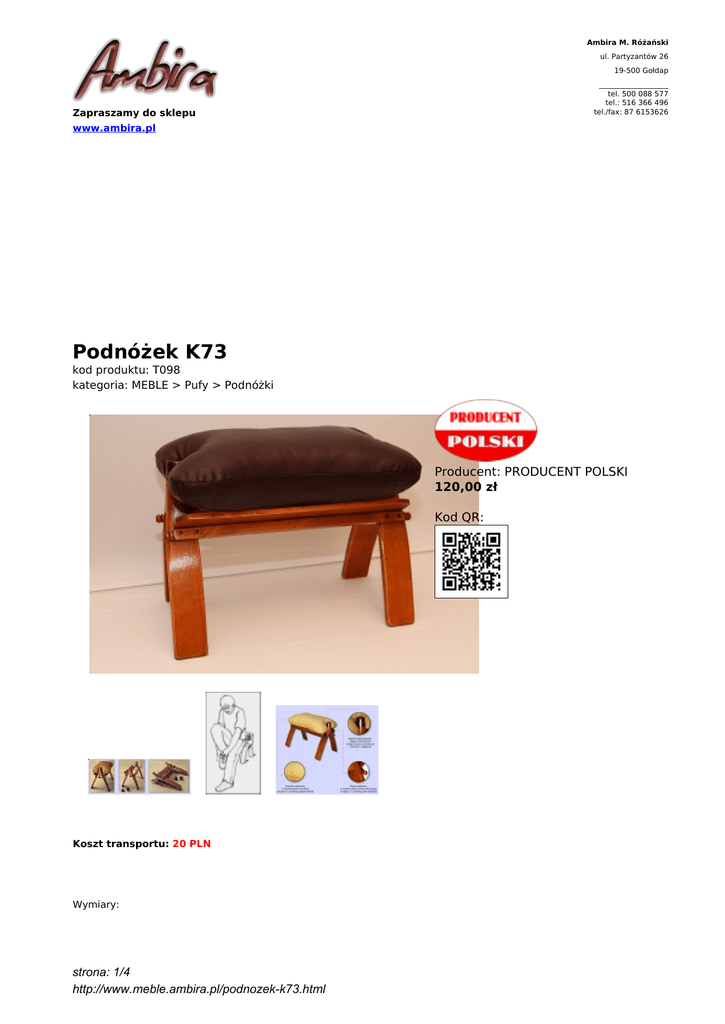 Ambira M. Różański ul. Partyzantów 26 19-500 Gołdap ___________________ tel. 500 088 577 tel.: 516 366 496 tel./fax: 87 6153626 Zapraszamy do sklepu www.ambira.pl Podnóżek K73 kod produktu: T098 kategoria: MEBLE > Pufy > Podnóżki Producent: PRODUCENT POLSKI 120,00 zł Kod QR: Koszt transportu: 20 PLN Wymiary: strona: 1/4 http://www.meble.ambira.pl/podnozek-k73.html strona: 2/4 http://www.meble.ambira.pl/podnozek-k73.html Kolory drewna: strona: 3/4 http://www.meble.ambira.pl/podnozek-k73.html strona: 4/4 http://www.meble.ambira.pl/podnozek-k73.html