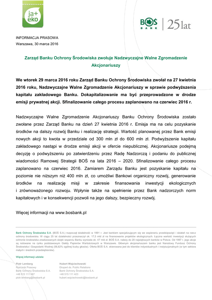 INFORMACJA PRASOWA Warszawa, 30 marca 2016 Zarząd Banku Ochrony Środowiska zwołuje Nadzwyczajne Walne Zgromadzenie Akcjonariuszy We wtorek 29 marca 2016 roku Zarząd Banku Ochrony Środowiska zwołał na 27 kwietnia 2016 roku, Nadzwyczajne Walne Zgromadzenie Akcjonariuszy w sprawie podwyższenia kapitału zakładowego Banku. Dokapitalizowanie ma być przeprowadzone w drodze emisji prywatnej akcji. Sfinalizowanie całego procesu zaplanowano na czerwiec 2016 r. Nadzwyczajne Walne Zgromadzenie Akcjonariuszy Banku Ochrony Środowiska zostało zwołane przez Zarząd Banku na dzień 27 kwietnia 2016 r. Emisja ma na celu pozyskanie środków na dalszy rozwój Banku i realizację strategii. Wartość planowanej przez Bank emisji nowych akcji to kwota w przedziale od 300 mln zł do 600 mln zł. Podwyższenie kapitału zakładowego nastąpi w drodze emisji akcji w ofercie niepublicznej. Akcjonariusze podejmą decyzję o podwyższeniu po zatwierdzeniu przez Radę Nadzorczą i podaniu do publicznej wiadomości Ramowej Strategii BOŚ na lata 2016 – 2020. Sfinalizowanie całego procesu zaplanowano na czerwiec 2016. Zamiarem Zarządu Banku jest pozyskanie kapitału na poziomie nie niższym niż 400 mln zł, co umożliwi Bankowi organiczny rozwój, generowanie środków na realizację misji w zakresie finansowania inwestycji ekologicznych i zrównoważonego rozwoju. Wpłynie także na spełnienie przez Bank nadzorczych norm kapitałowych i w konsekwencji pozwoli na jego dalszy, bezpieczny rozwój. Więcej informacji na www.bosbank.pl Bank Ochrony Środowiska S.A. (BOŚ S.A.) rozpoczął działalność w 1991 r. Jest bankiem specjalizującym się we wspieraniu przedsięwzięć i działań na rzecz ochrony środowiska. W ciągu 25 lat działalności przeznaczył ok. 17,5 mld zł na finansowanie projektów ekologicznych. Łączna wartość inwestycji służących ochronie środowiska zrealizowanych dzięki wsparciu Banku wyniosła ok. 47 mld zł. BOŚ S.A. należy do 20 największych banków w Polsce. Od 1997 r. jego akcje są notowane na rynku podstawowym Giełdy Papierów Wartościowych w Warszawie. Głównym akcjonariuszem banku jest Narodowy Fundusz Ochrony Środowiska i Gospodarki Wodnej (56,62% ogólnej liczby głosów). Oferta BOŚ S.A. skierowana jest do klientów indywidualnych i instytucjonalnych (w tym sektora małych i średnich przedsiębiorstw). Więcej informacji udziela: Piotr Lemberg Rzecznik Prasowy Bank Ochrony Środowiska S.A. +48 515 111 087 [email protected] Hubert Wojciechowski Ekspert ds. Public Relations Bank Ochrony Środowiska S.A. +48 515 111 423 [email protected]