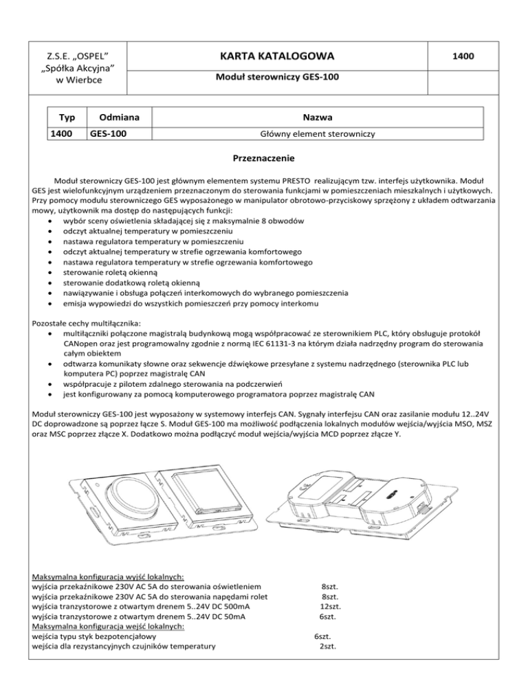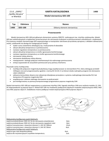 Z.S.E. „OSPEL” „Spółka Akcyjna” w Wierbce Typ 1400 KARTA KATALOGOWA Moduł sterowniczy GES-100 Odmiana GES-100 1400 Nazwa Główny element sterowniczy Przeznaczenie Moduł sterowniczy GES-100 jest głównym elementem systemu PRESTO realizującym tzw. interfejs użytkownika. Moduł GES jest wielofunkcyjnym urządzeniem przeznaczonym do sterowania funkcjami w pomieszczeniach mieszkalnych i użytkowych. Przy pomocy modułu sterowniczego GES wyposażonego w manipulator obrotowo-przyciskowy sprzężony z układem odtwarzania mowy, użytkownik ma dostęp do następujących funkcji: wybór sceny oświetlenia składającej się z maksymalnie 8 obwodów odczyt aktualnej temperatury w pomieszczeniu nastawa regulatora temperatury w pomieszczeniu odczyt aktualnej temperatury w strefie ogrzewania komfortowego nastawa regulatora temperatury w strefie ogrzewania komfortowego sterowanie roletą okienną sterowanie dodatkową roletą okienną nawiązywanie i obsługa połączeń interkomowych do wybranego pomieszczenia emisja wypowiedzi do wszystkich pomieszczeń przy pomocy interkomu Pozostałe cechy multiłącznika: multiłączniki połączone magistralą budynkową mogą współpracować ze sterownikiem PLC, który obsługuje protokół CANopen oraz jest programowalny zgodnie z normą IEC 61131-3 na którym działa nadrzędny program do sterowania całym obiektem odtwarza komunikaty słowne oraz sekwencje dźwiękowe przesyłane z systemu nadrzędnego (sterownika PLC lub komputera PC) poprzez magistralę CAN współpracuje z pilotem zdalnego sterowania na podczerwień jest konfigurowany za pomocą komputerowego programatora poprzez magistralę CAN Moduł sterowniczy GES-100 jest wyposażony w systemowy interfejs CAN. Sygnały interfejsu CAN oraz zasilanie modułu 12..24V DC doprowadzone są poprzez łącze S. Moduł GES-100 ma możliwość podłączenia lokalnych modułów wejścia/wyjścia MSO, MSZ oraz MSC poprzez złącze X. Dodatkowo można podłączyć moduł wejścia/wyjścia MCD poprzez złącze Y. Maksymalna konfiguracja wyjść lokalnych: wyjścia przekaźnikowe 230V AC 5A do sterowania oświetleniem wyjścia przekaźnikowe 230V AC 5A do sterowania napędami rolet wyjścia tranzystorowe z otwartym drenem 5..24V DC 500mA wyjścia tranzystorowe z otwartym drenem 5..24V DC 50mA Maksymalna konfiguracja wejść lokalnych: wejścia typu styk bezpotencjałowy wejścia dla rezystancyjnych czujników temperatury 8szt. 8szt. 12szt. 6szt. 6szt. 2szt. Podłączenie lokalnych i zdalnych modułów wejścia/wyjścia Parametry techniczne rodzaj magistrali systemowej protokół komunikacyjny zakres adresowy węzła ustawianie adresu adres fabryczny modułu max wewnętrzny pobór prądu wewnętrzny pobór prądu w stanie ustalonym zasilanie modułu złącza systemowe izolacja magistrali systemowej ciężar wymiary – wysokość [mm] wymiary – szerokość [mm] wymiary – głębokość [mm] CAN CAN open 1..30 przy pomocy programu konfigurującego 1 mA mA 12..24V DC dostępne w magistrali systemowej gniazdo 10-stykowe typu Micro-Match (X) – moduły MSO,MSZ,MSC gniazdo 12-stykowe typu Micro-Match (Y) – moduł MCD gniazdo 6-stykowe typu Micro-Match (S) – magistrala systemowa 1000V g 142mm 71mm 31mm Parametry funkcjonalne ilość obwodów oświetlenia o obciążalności 5A każdy możliwość komponowania scen oświetlenia możliwość przełączania wybranych scen oświetlenia przy pomocy dodatkowych przycisków ilość niezależnych rolet obsługiwanych przez jeden multiłącznik ilość ustawień wysokości podniesienia rolety możliwość kalibracji rolety ilość niezależnych wbudowanych w multiłącznik regulatorów temperatury ( np. jeden do grzejników, drugi do ogrzewania podłogowego) możliwość wyboru typu zaworu z którym współpracuje wbudowany w multiłącznik regulator (normalnie otwarty lub normalnie zamknięty) możliwość ustawiania histerezy dla każdego obwodu ogrzewania oddzielnie możliwość ustawiania progu przeciwzamarzaniowego dla każdego obwodu ogrzewania oddzielnie możliwość określenia czy wskazany regulator ma „prawo” załączyć kocioł możliwość sterowania stykiem blokady kotła możliwość wyboru typu styku blokady kotła z którym współpracuje wbudowany w multiłącznik regulator (normalnie otwarty lub normalnie zamknięty) maksymalna ilość czujników temperatury z którymi współpracuje każdy z wbudowanych regulatorów możliwość ustawiania wag dla wskazań temperatury z poszczególnych czujników temperatury w celu uzyskania uśrednionej wartości zgodnej z odczuciami użytkownika wbudowana funkcja wewnętrznego telefonu (interkom) możliwość wyboru pomieszczenia z którym chcemy się połączyć interkom wymaga odrębnego okablowania możliwość powiedzenia do wszystkich pomieszczeń naraz (tzw. tryb rozgłaszania) możliwość zmiany języka w którym lektor potrafi wygłaszać nawigujące po menu komunikaty ilość języków obcych w których lektor potrafi wygłaszać nawigujące po menu komunikaty możliwość zmiany głosu dla wybranego języka ilość dostępnych głosów dla każdego języka możliwość zmiany formy wypowiadanych komunikatów na tzw. tryb uczący w którym lektor prowadzący przez menu formułuje bardziej opisowe zdania regulacja siły głosu współpraca z pilotem zdalnego sterowania współpraca z układami automatyki cyfrowej innych firm współpraca ze programowanym sterownikiem logicznym (PLC) wyposażonym w kolorowy dotykowy ekran oraz oprogramowanie do wizualizacji współpraca z komputerem PC wyposażonym w oprogramowanie do konfigurowania multiłącznika 8 tak tak 2 10 tak 2 tak tak tak tak tak tak 3 tak tak tak nie tak tak 7 tak 2 tak tak tak tak tak tak