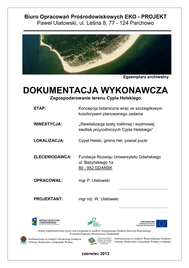 Biuro Opracowań Prośrodowiskowych EKO - PROJEKT Paweł Ulatowski, ul. Leśna 8, 77 - 124 Parchowo Egzemplarz archiwalny DOKUMENTACJA WYKONAWCZA Zagospodarowanie terenu Cypla Helskiego ETAP: Koncepcja botaniczna wraz ze szczegółowym kosztorysem planowanego zadania INWESTYCJA: „Rewitalizacja szaty roślinnej i wydmowej siedlisk przyrodniczych Cypla Helskiego” LOKALIZACJA: Cypel Helski, gmina Hel, powiat pucki ZLECENIODAWCA: Fundacja Rozwoju Uniwersytetu Gdańskiego ul. Bażyńskiego 1a 80 - 952 GDAŃSK OPRACOWAŁ: mgr P. Ulatowski ……………………………… PROJEKTANT: mgr inż. W. Ulatowski ……………………………… Projekt współfinansowany przez Unię Europejską ze środków Europejskiego Funduszu Rozwoju Regionalnego w ramach Programu Infrastruktura i Środowisko Dofinansowano ze środków Wojewódzkiego Funduszu Ochrony Środowiska i Gospodarki Wodnej w Gdańsku Dofinansowano ze środków Narodowego Funduszu Ochrony Środowiska i Gospodarki Wodnej czerwiec 2013 Rewitalizacja szaty roślinnej i wydmowej siedlisk przyrodniczych Cypla Helskiego SPIS TREŚCI 1. WSTĘP - ZAŁOŻENIA 2. PODSTAWA OPRACOWANIA 3. ZAKRES PLANOWANEJ INWESTYCJI 4. OPIS TECHNICZNY INWESTYCJI 4.1. Stan istniejący 4.2. Stan docelowy 4.3. Specyfikacja techniczna 5. UWAGI I ZALECENIA 6. SZCZEGÓŁOWY KOSZTORYS INWESTORSKI ZAŁĄCZNIKI B.O.P. EKO – PROJEKT Paweł Ulatowski 1/11 Rewitalizacja szaty roślinnej i wydmowej siedlisk przyrodniczych Cypla Helskiego 1. WSTĘP – ZAŁOŻENIA Przedmiotem opracowania jest koncepcja botaniczna wraz ze szczegółowym kosztorysem planowanego zadania pn.: „REWITALIZACJA SZATY ROŚLINNEJ I WYDMOWEJ SIEDLISK PRZYRODNICZYCH CYPLA HELSKIEGO”. Powyższy cel planuje się osiągnąć poprzez rewitalizację obszarów wydm wraz z reintrodukcją dwóch gatunków oraz usunięciem obcego substratu z powierzchni 10 ha Cypla Helskiego. Prace te wykonywane będą w latach 2013 i 2014. Zaplanowano ochronę istniejących walorów przyrodniczych oraz umożliwienie zrównoważonej turystyki. Planowana inwestycja będzie dofinansowana przez Unię Europejską ze środków Europejskiego Funduszu Rozwoju Regionalnego w ramach Programu Operacyjnego Infrastruktura i Środowisko, ze środków Narodowego Funduszu Ochrony Środowiska i Gospodarki Wodnej oraz Wojewódzkiego Funduszu Ochrony Środowiska i Gospodarki Wodnej w Gdańsku. Zakres inwestycji został objęty kodami CPV: 45111000-8 - Roboty w zakresie burzenia, roboty ziemne 45112300-8 - Rekultywacja gleby 45112310-1 - Podsypywanie gleby 45112700-2 - Roboty w zakresie kształtowania terenu 77310000-6 - Usługi sadzenia roślin oraz utrzymania terenów zielonych 2. PODSTAWA OPRACOWANIA Podstawą wykonania koncepcji jest zlecenie Zamawiającego, tj.: Zamawiający: Fundacja Rozwoju Uniwersytetu Gdańskiego ul. Bażyńskiego 1a 80 - 952 GDAŃSK Wykonawca: Biuro Opracowań Prośrodowiskowych EKO-PROJEKT Paweł Ulatowski ul. Leśna 8, 77 - 124 PARCHOWO Inne materiały i opracowania: Uchwała nr XXVI/155/08 Rady Miasta Helu z dnia 29 października 2008 roku w sprawie ustanowienia zespołu przyrodniczo – krajobrazowego „Helski Cypel” Karta informacyjna przedsięwzięcia Zaświadczenie organu odpowiedzialnego za monitorowanie obszarów Natura 2000 P. Bik, 2013: Ekspertyza dotycząca zagrożenia występowaniem przedmiotów wybuchowych pochodzenia wojskowego na terenie części Cypla Helskiego, Gdańsk A. Woźniakowski, 2013: Inwentaryzacja zabytkowych obiektów powojskowych w rejonie Cypla Helskiego, Gdańsk M. Lazarus, K. Wszałek – Rożek, 2013: Inwentaryzacja przyrodnicza części Cypla Helskiego, Gdańsk – Hel J. Herbich: Inwentaryzacja, waloryzacja, zagrożenia i założenia ochrony siedlisk przyrodniczych i szaty roślinnej Cypla Helskiego B.O.P. EKO – PROJEKT Paweł Ulatowski 2/11 Rewitalizacja szaty roślinnej i wydmowej siedlisk przyrodniczych Cypla Helskiego 3. ZAKRES PLANOWANEJ INWESTYCJI Działania realizowane w ramach niniejszego projektu obejmują prace renaturalizacyjne i porządkowe na wydmach Cypla Helskiego. W ramach przedsięwzięcia planowana jest rewitalizacja obszarów siedlisk wydmowych wraz z reintrodukcją dwóch gatunków oraz usunięciu obcego substratu z przedmiotowego obszaru, w tym ze ścieżki na odcinku ok. 300 m. Powierzchnia objęta projektem wynosi 10 ha - 5.5 ha z prawej strony cypla i 4.5 ha z lewej strony cypla. Projekt przewiduje również uporządkowanie i odtworzenie terenu wokół betonowych umocnień powojskowych. Prace będą wykonywane w latach 2013 i 2014. Prace terenowe: a) usunięcie obcego substratu z dzikiej ścieżki na odcinku około 300 m, głębokości do 0,50 m, szerokości do 6,50 m oraz wypełnienie wyrobiska refulatem (piaskiem wydmowym); b) usunięcie obcego substratu glebowego z powierzchni wydmowej; c) karczowanie krzaków (usuwanie roślin obcych i inwazyjnych) z ich wywiezieniem i utylizacją, oczyszczenie terenu z ich pozostałości; d) utylizacja karczy, gałęzi, gruzu i korzeni na najbliższym składowisku odpadów w Nowej Wsi Lęborskiej; e) uporządkowanie i odtworzenie terenu wokół betonowych umocnień powojskowych. Prace rekultywacyjne: f) wypełnienie zagłębień po usunięciu obcego substratu i odtworzenie podłoża wydmowego refulatem. Pielęgnacja zieleni i nasadzenie roślinności: g) nasadzanie gatunków charakterystycznych dla siedlisk wydmowych, takich jak: wydmuchrzyca piaskowa (Leymus arenarius) i piaskownica zwyczajna (Ammophila arenaria); h) pielęgnacja i dosadzania; i) usuwanie pozostałości gatunków inwazyjnych. 4. OPIS TECHNICZNY INWESTYCJI 4.1. Stan istniejący Cypel Helski to miejsce unikatowe w skali Europy pod względem przyrodniczym i geograficznym (Natura 2000, Nadmorski Park Krajobrazowy i akwen sieci BSPA HELCOM). W miejscu tym, na małej powierzchni występuje duży zbiór chronionych siedlisk przyrodniczych (2110 inicjalne stadia nadmorskich wydm białych, 2120 nadmorskie wydmy białe, *2130 nadmorskie wydmy szare